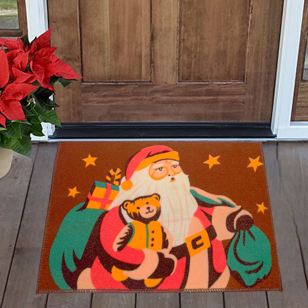 The image shows a festive doormat placed in front of a wooden door. The doormat features a colorful illustration of Santa Claus holding a teddy bear and a green sack filled with gifts. Santa is surrounded by stars, adding to the holiday theme. To the left of the doormat, there is a potted plant with vibrant red poinsettia flowers, enhancing the Christmas ambiance. This doormat is interesting and relevant as it adds a cheerful and welcoming touch to the entrance, perfect for the holiday season.