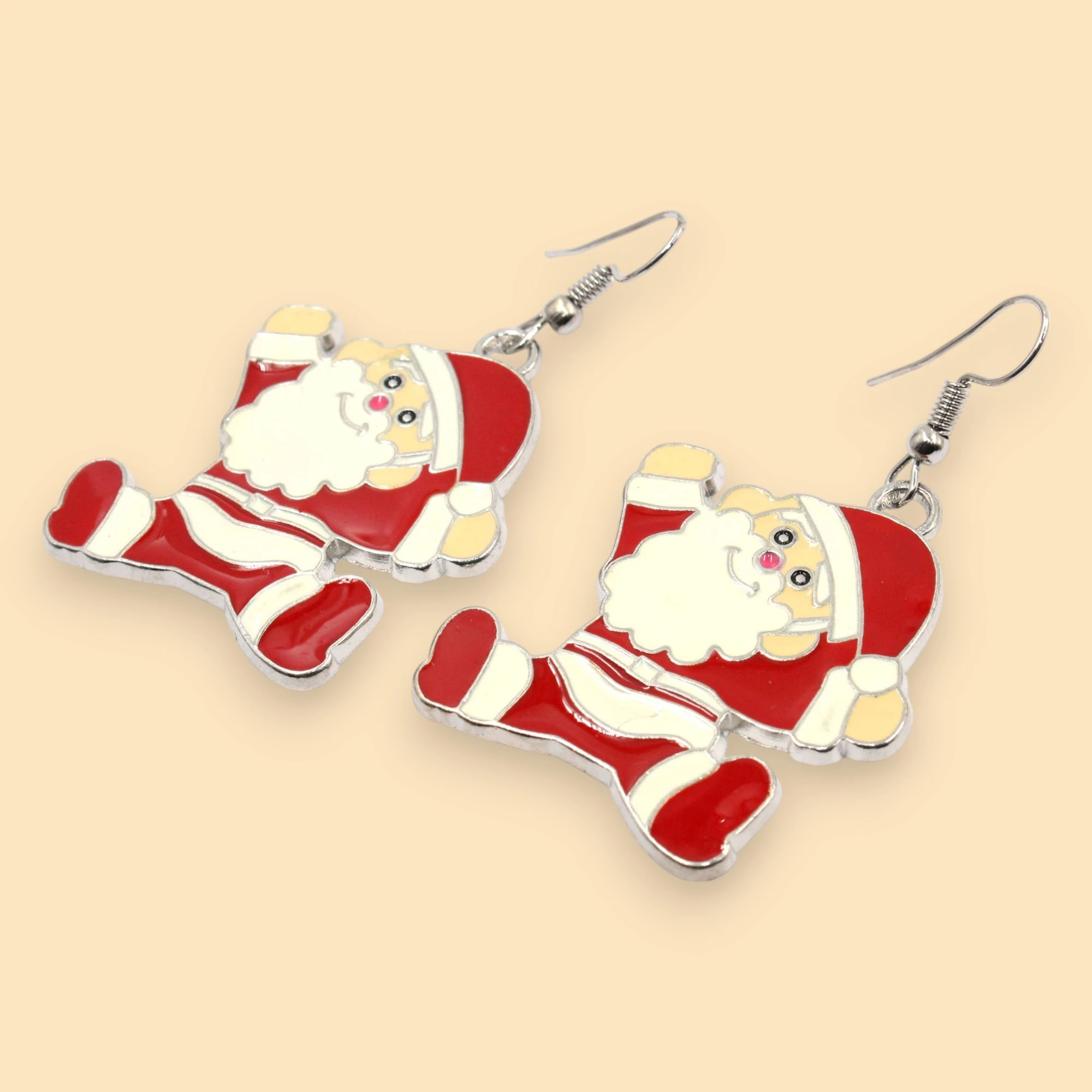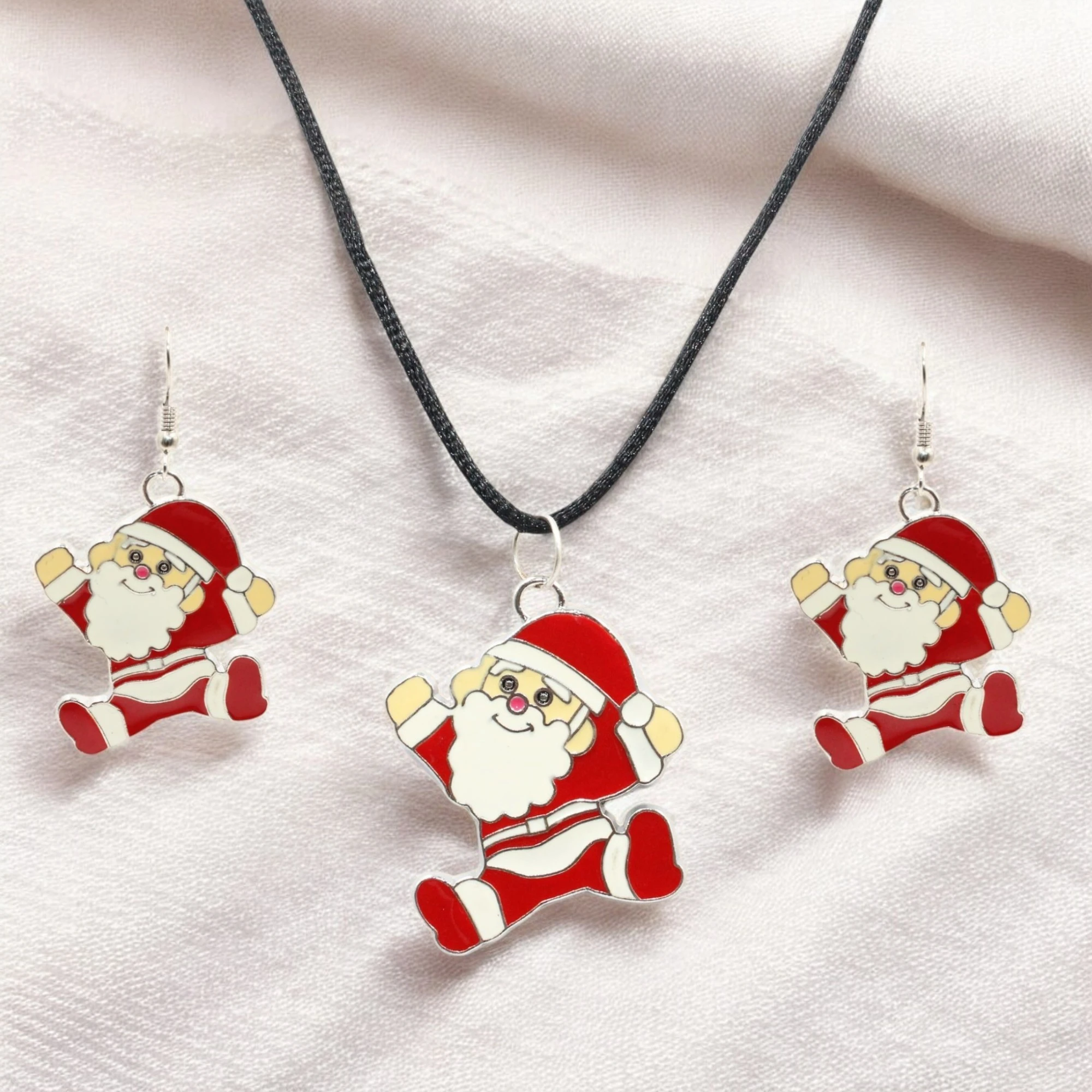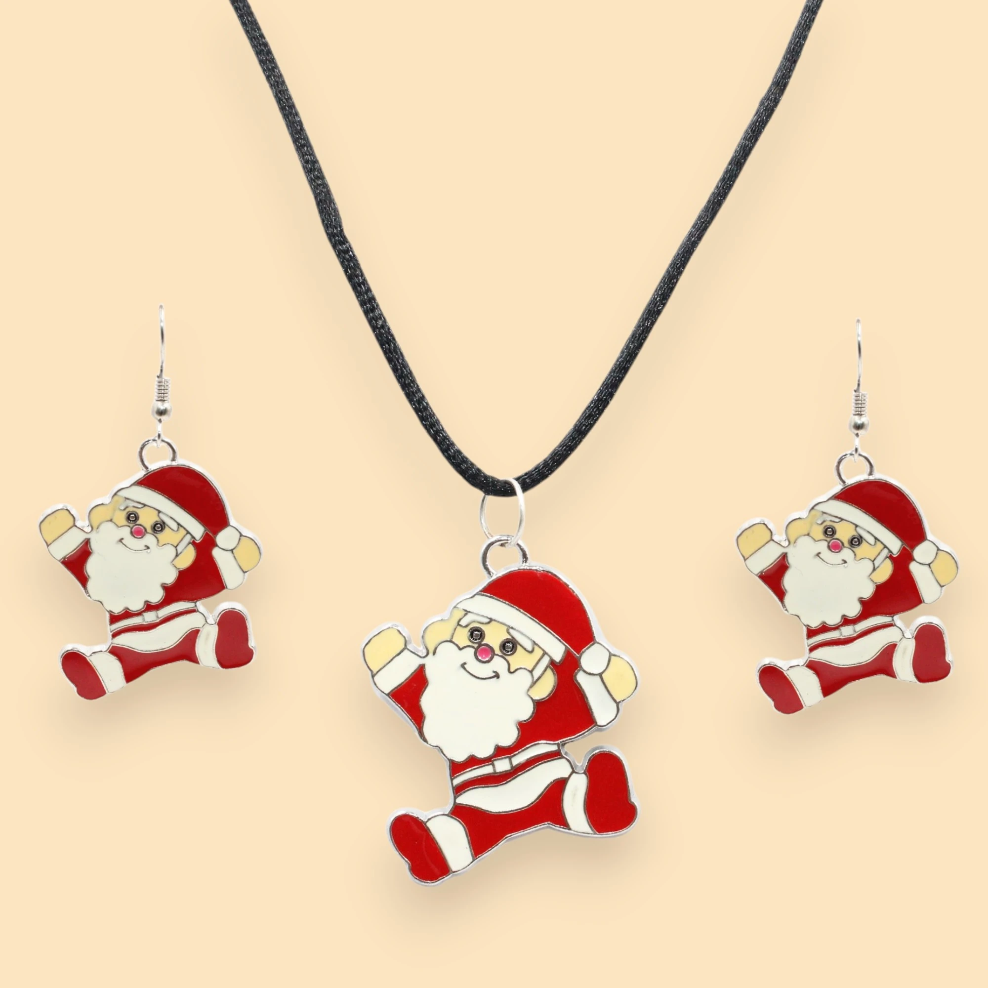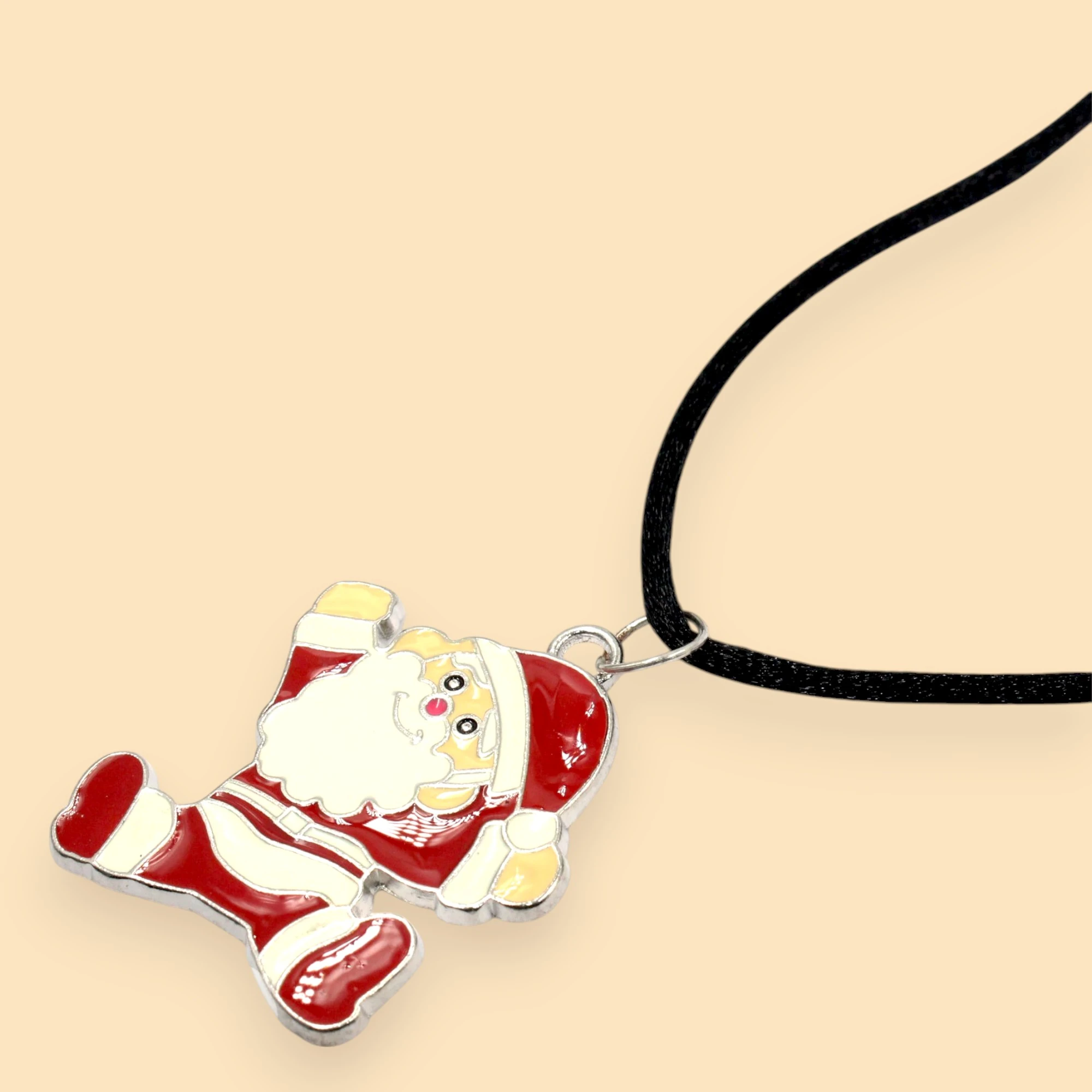 The image showcases a festive pendant necklace featuring a cheerful Santa Claus charm. The pendant is attached to a black cord, which contrasts nicely with the vibrant red and white colors of Santa’s outfit. Santa is depicted in a playful pose, with arms raised and a joyful expression, making this accessory perfect for adding a touch of holiday spirit to any outfit. The charm is detailed with Santa’s iconic hat, beard, and belt, capturing the essence of Christmas cheer. This necklace is both fun and festive, ideal for holiday celebrations or as a seasonal gift.
