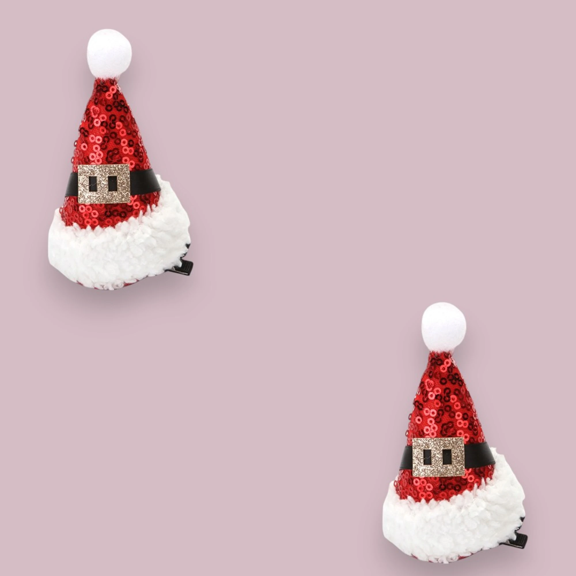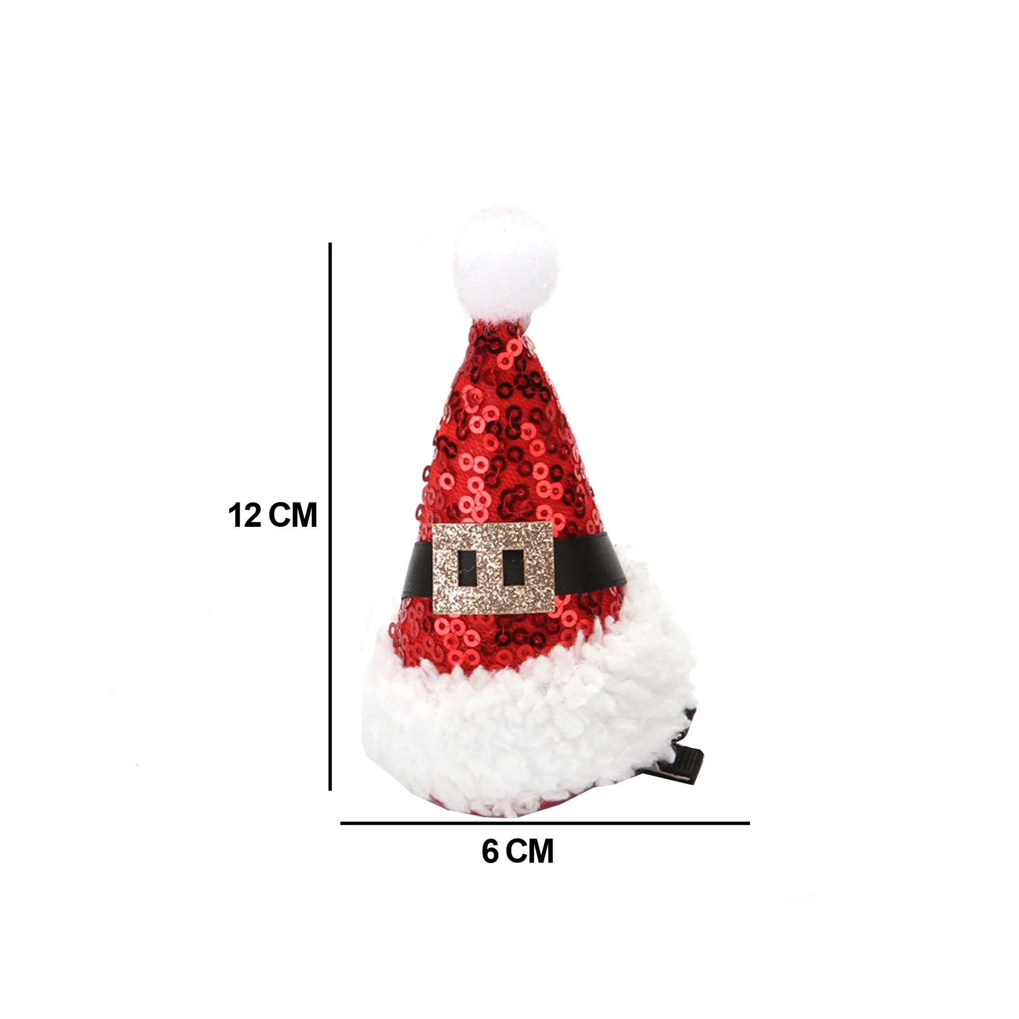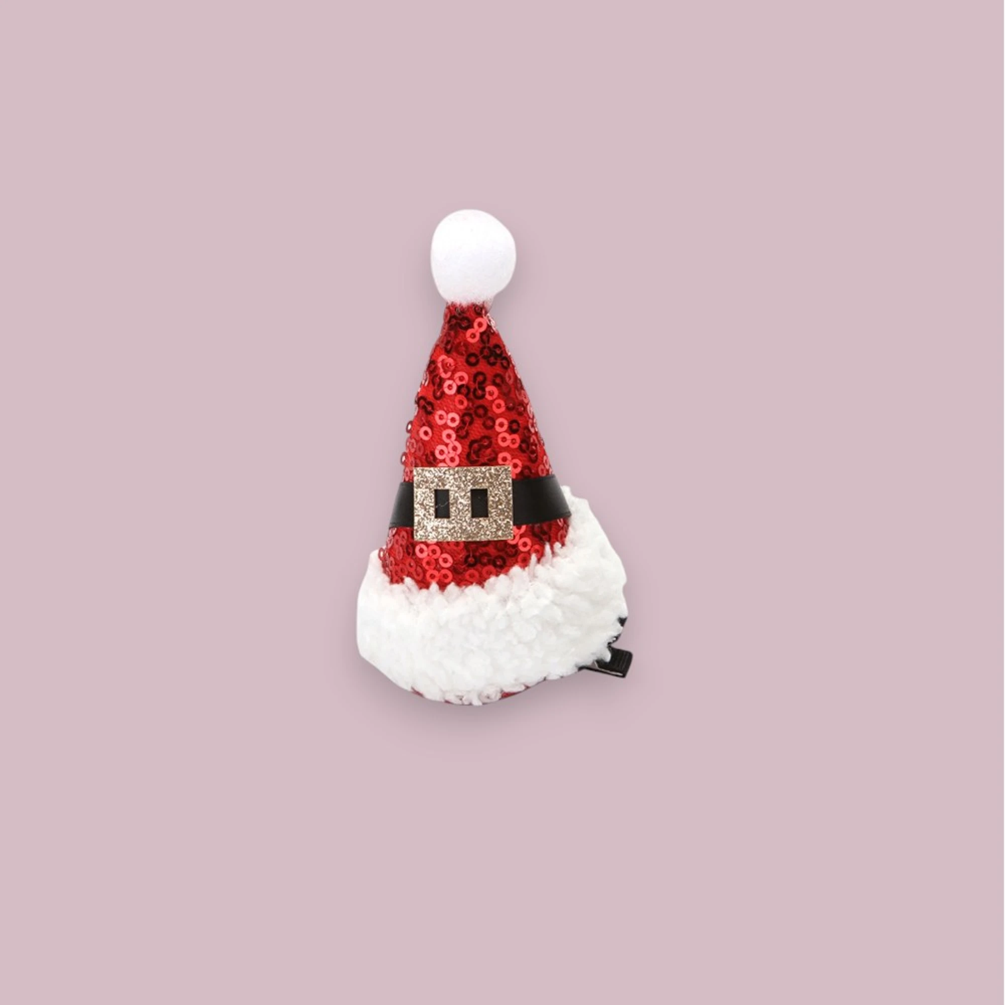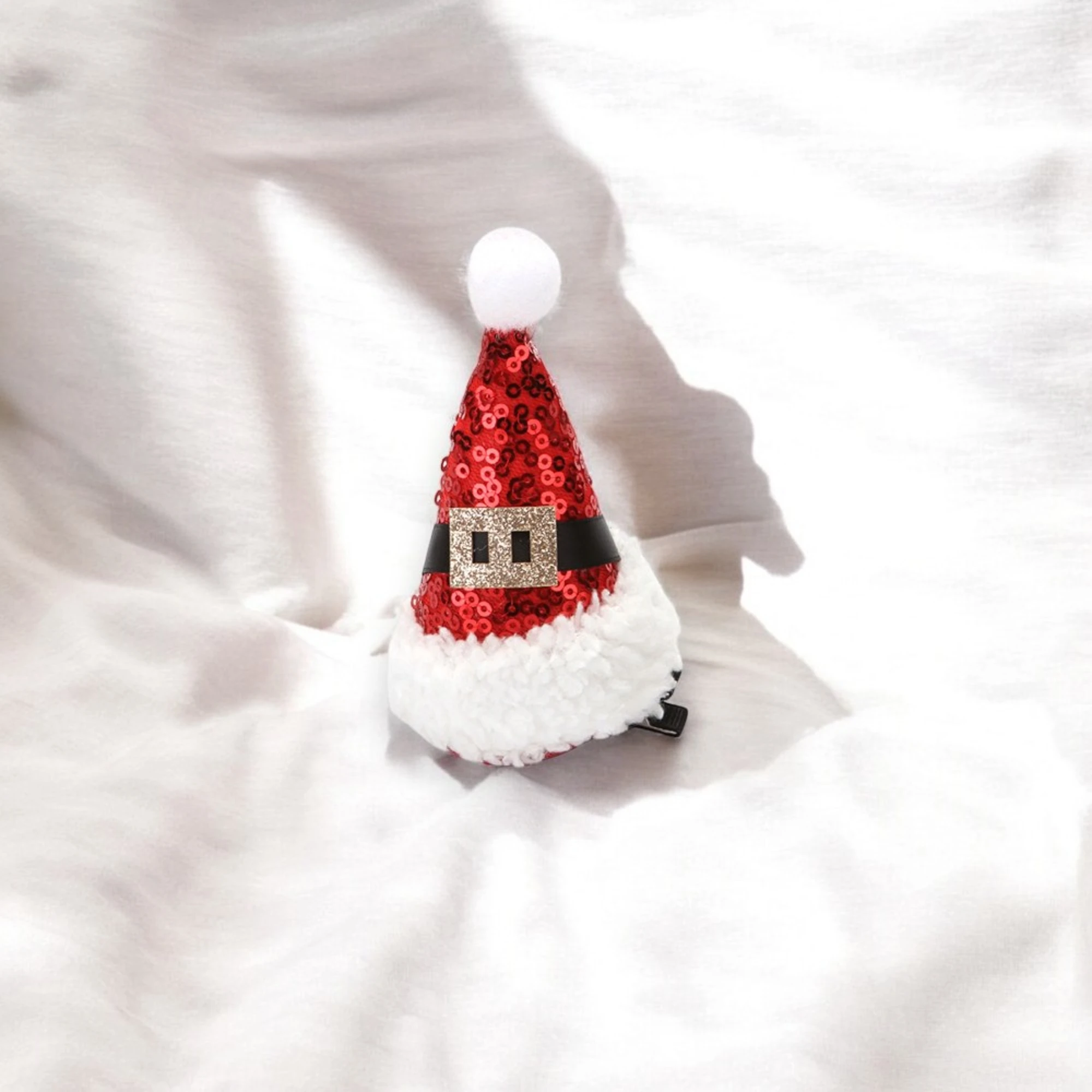 The image shows a hair clip designed to look like a miniature Santa hat. The hat is red with sequins, has a white fluffy trim at the base, a black belt with a glittery gold buckle, and a white pom-pom at the top. The hair clip is placed on a white fabric background, which highlights the festive and decorative nature of the accessory. This hair clip is interesting and relevant as it is a seasonal accessory, likely used for Christmas-themed outfits or celebrations.