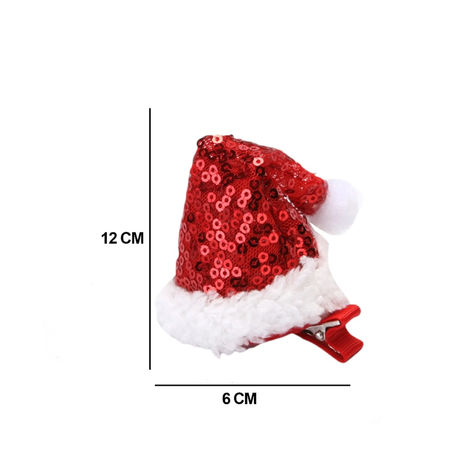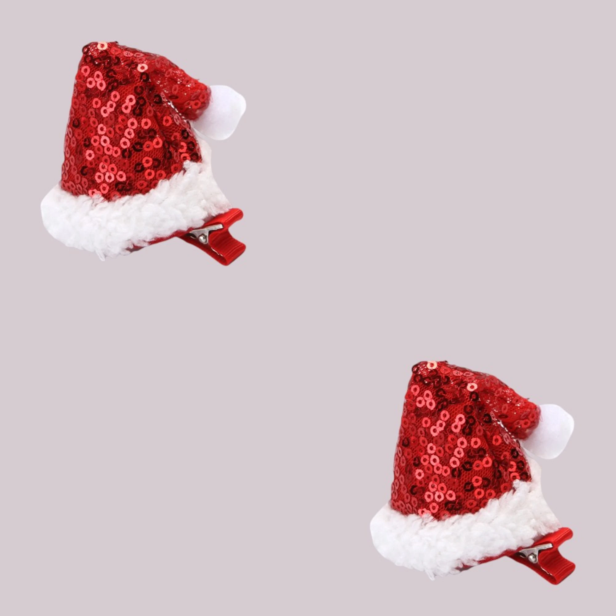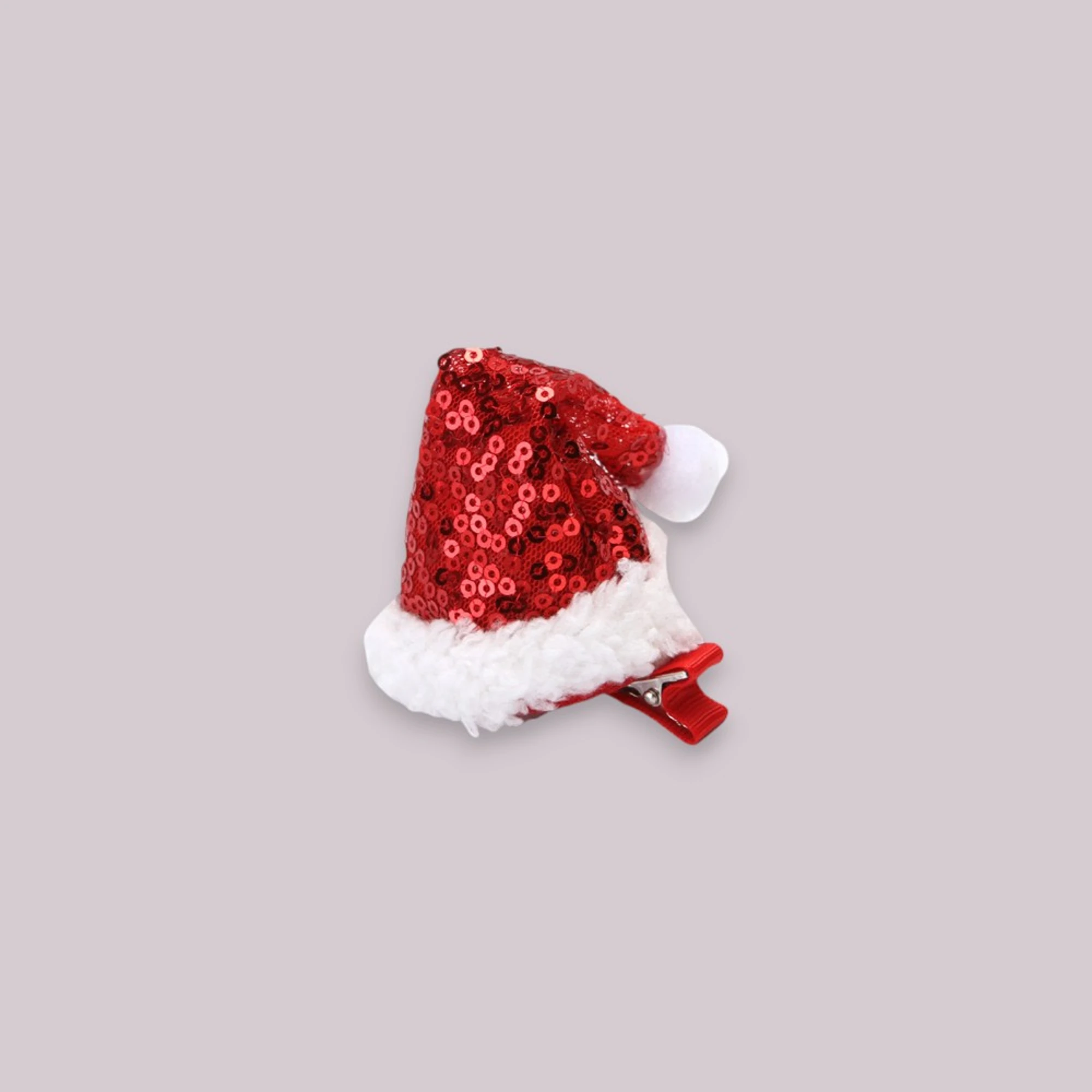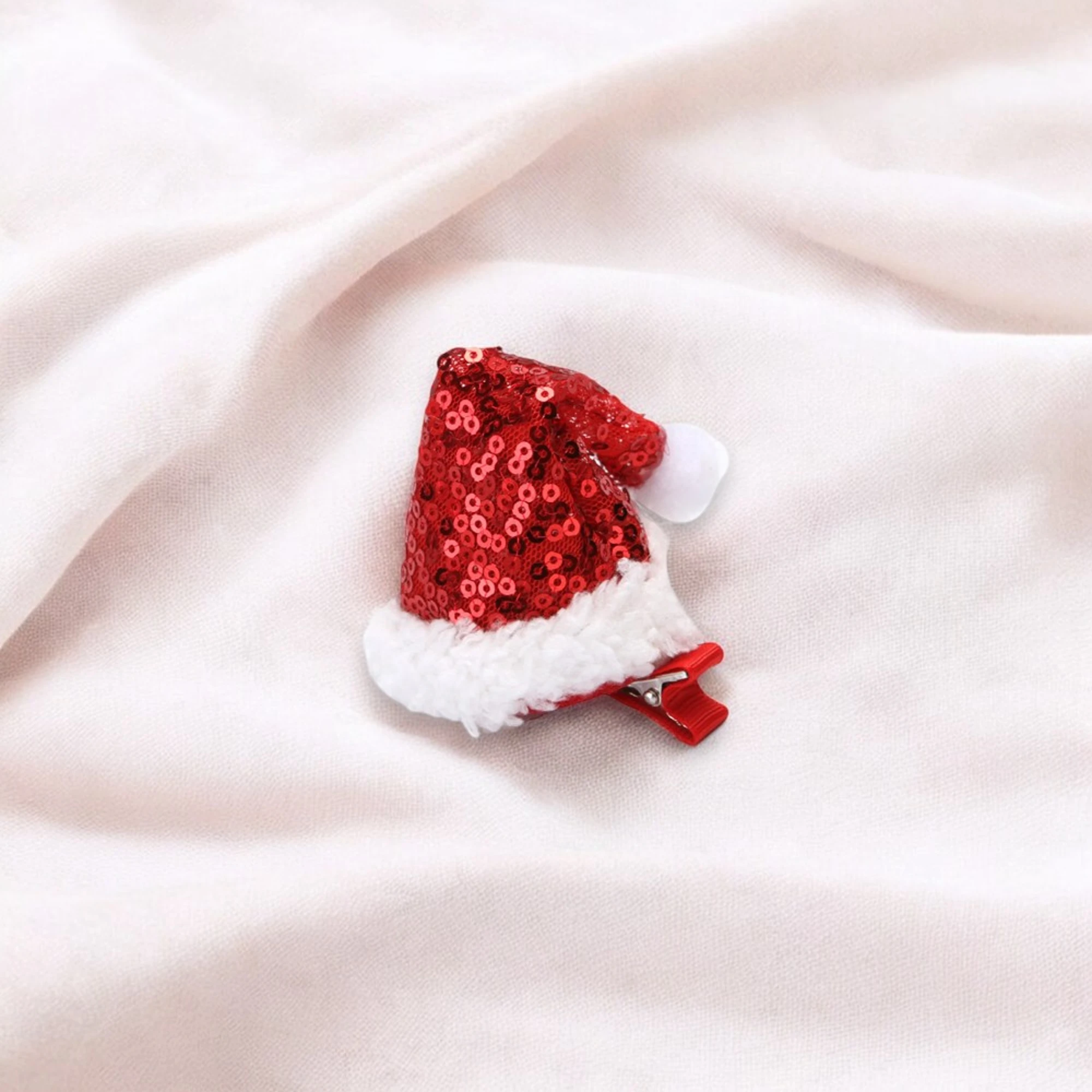 The image shows a small, festive Santa hat hair clip placed on a soft, white fabric background. The hat is adorned with red sequins and has a white, fluffy trim at the base, resembling the traditional Santa Claus hat. Attached to the bottom of the hat is a red hair clip, making it a decorative accessory likely intended for holiday-themed outfits or events. The contrast between the vibrant red hat and the soft white background makes the accessory stand out, highlighting its festive and playful nature.