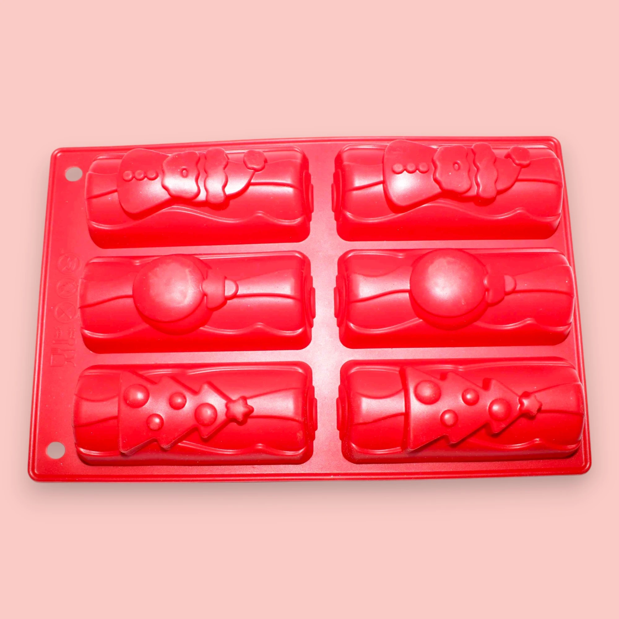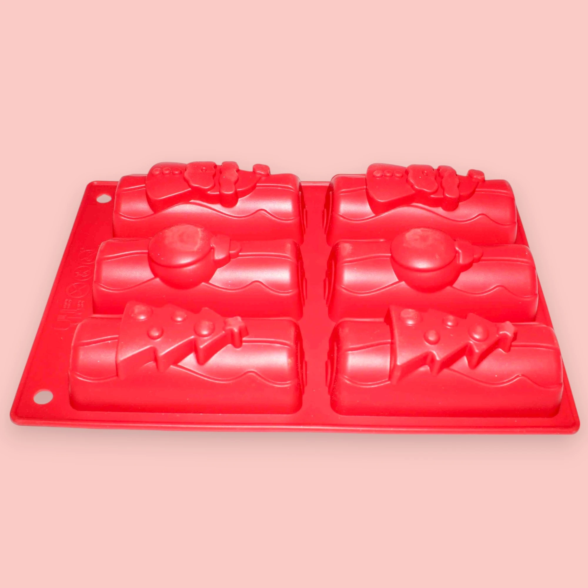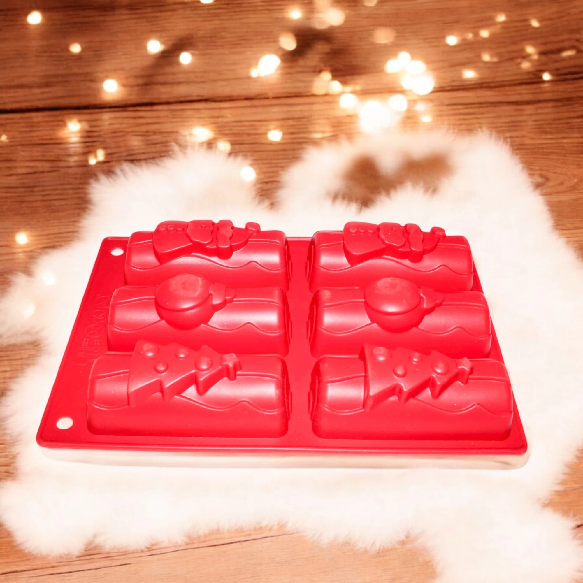 The image shows a red silicone baking mold designed for creating festive treats. The mold features six cavities, each with a different holiday-themed design. The top row has two snowmen, the middle row has two Santa Claus faces, and the bottom row has two Christmas trees. This mold is interesting and relevant for those looking to make holiday-themed baked goods or chocolates, adding a festive touch to their culinary creations.