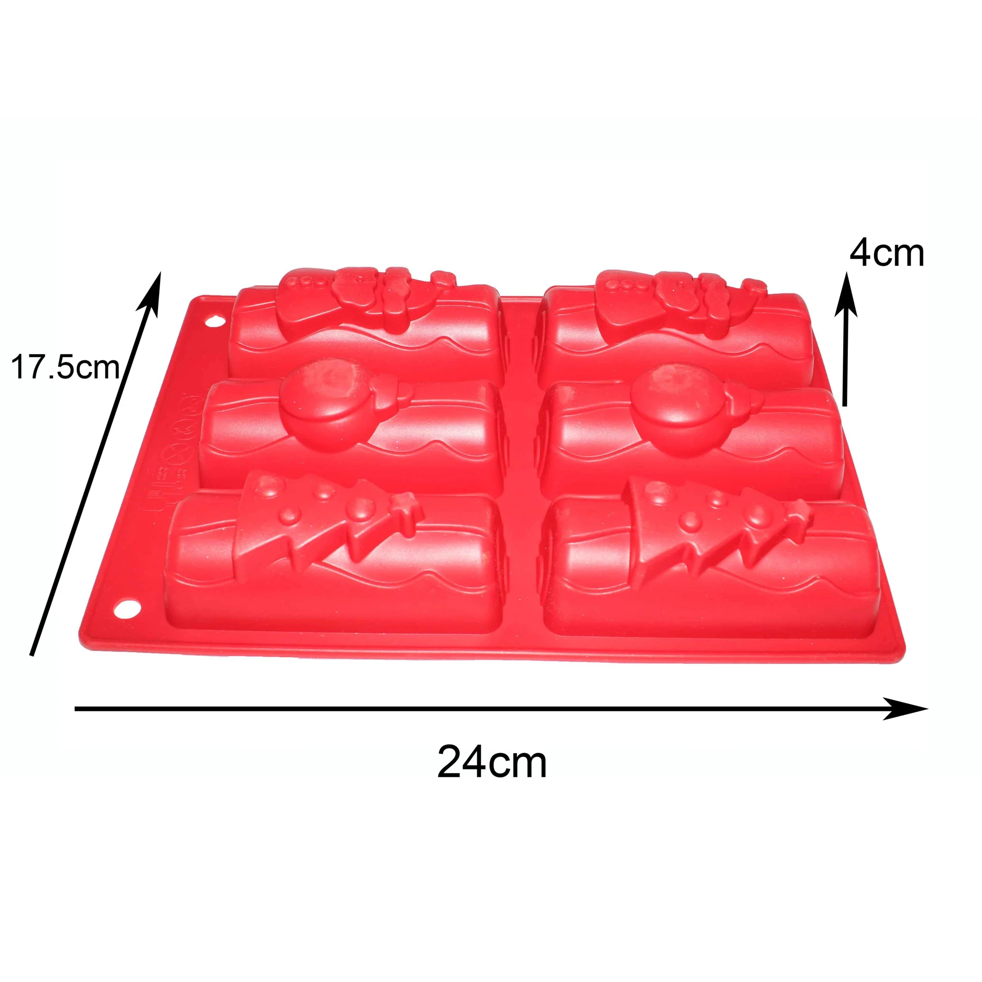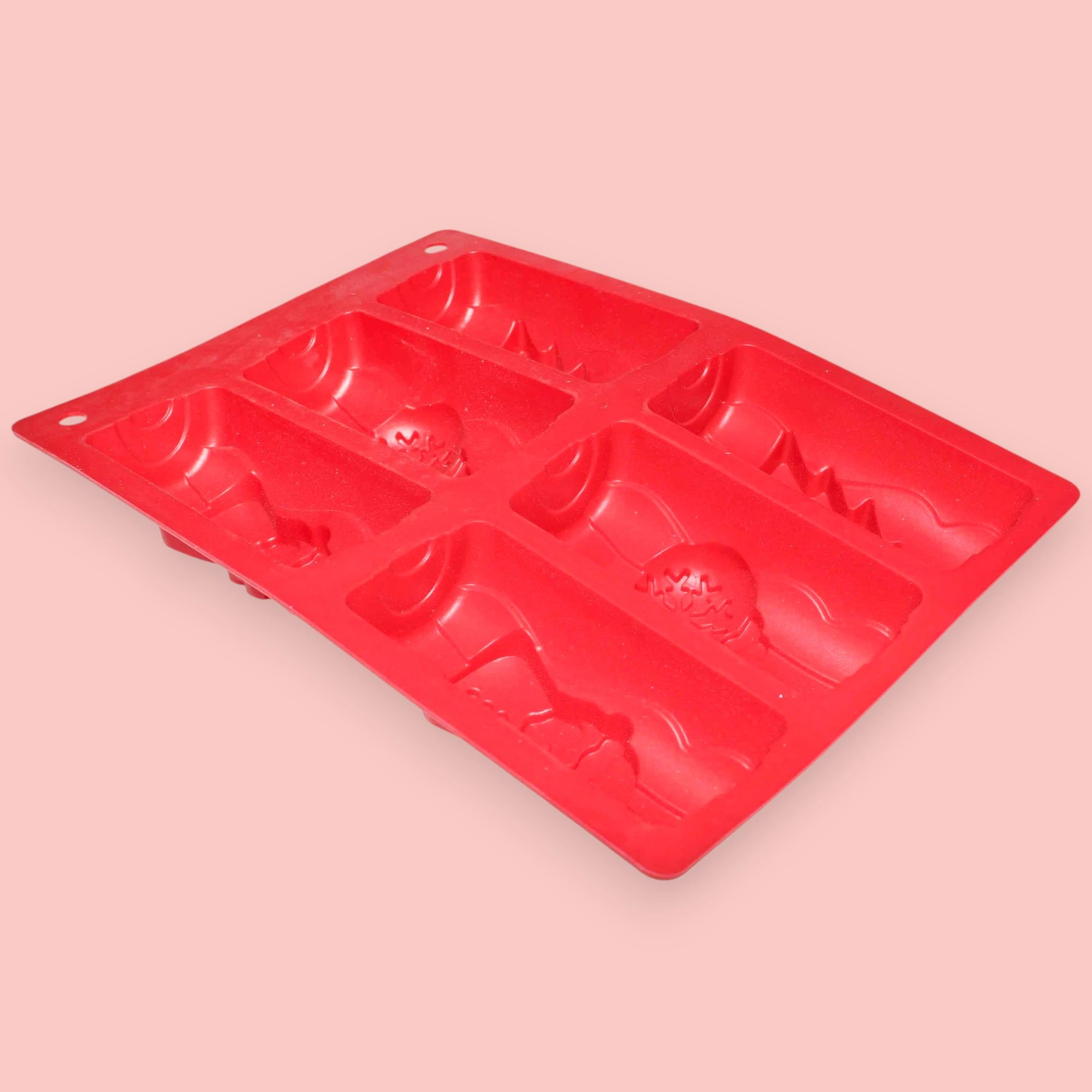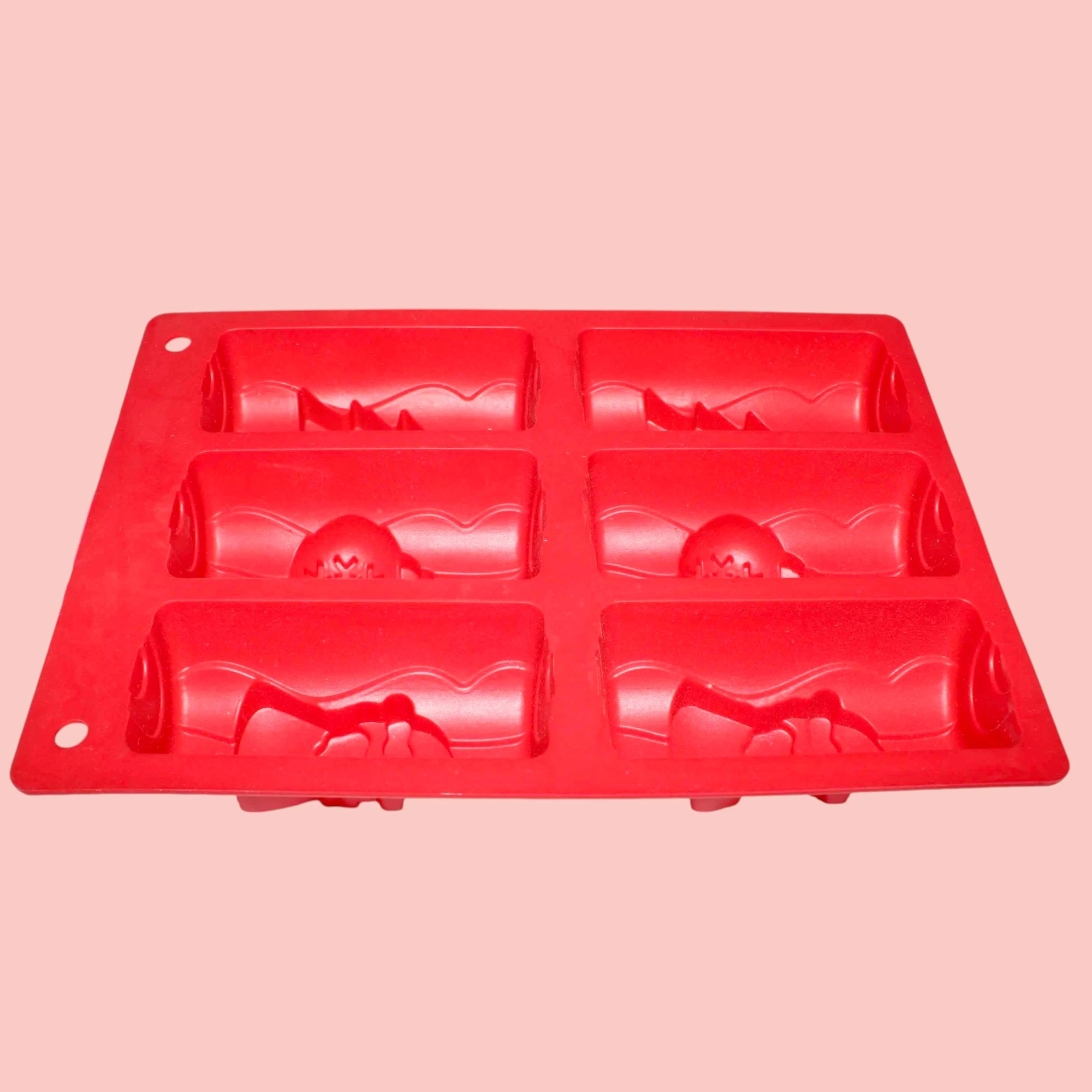 The image shows a red silicone baking mold designed for creating festive treats. The mold features six cavities, each with a different holiday-themed design. The top row has two snowmen, the middle row has two Santa Claus faces, and the bottom row has two Christmas trees. This mold is interesting and relevant for those looking to make holiday-themed baked goods or chocolates, adding a festive touch to their culinary creations.