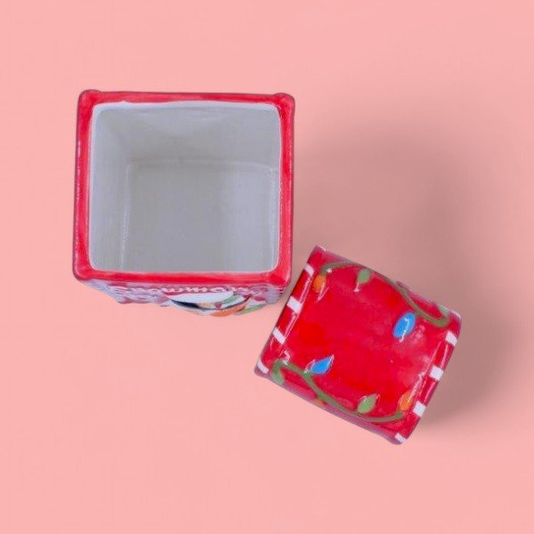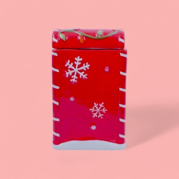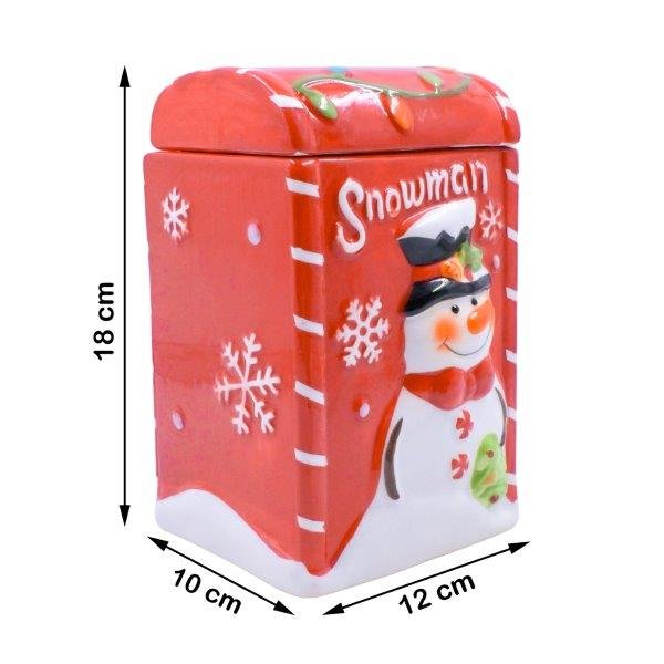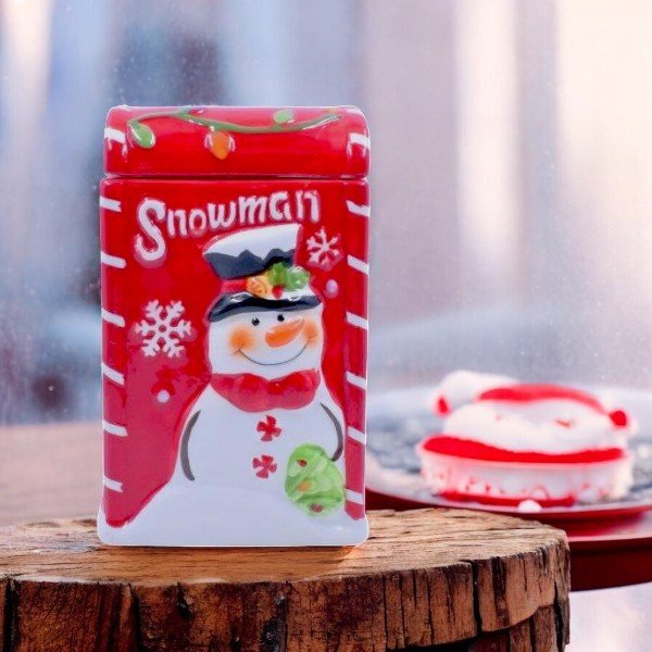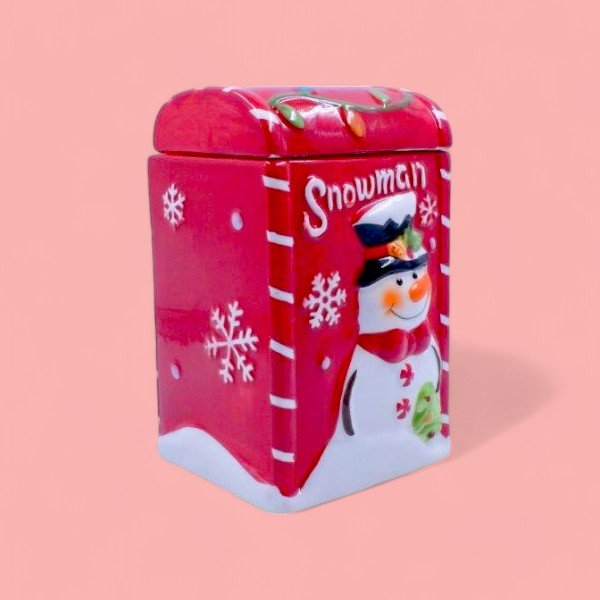 The image shows a festive ceramic container with a snowman theme. The container is primarily red with white accents and features a cheerful snowman wearing a black hat and red scarf. The word “Snowman” is written at the top in white letters. The container has a removable lid, which is also red and decorated with colorful Christmas lights. This item is likely used for holiday decoration or storage, adding a cheerful and festive touch to any space.