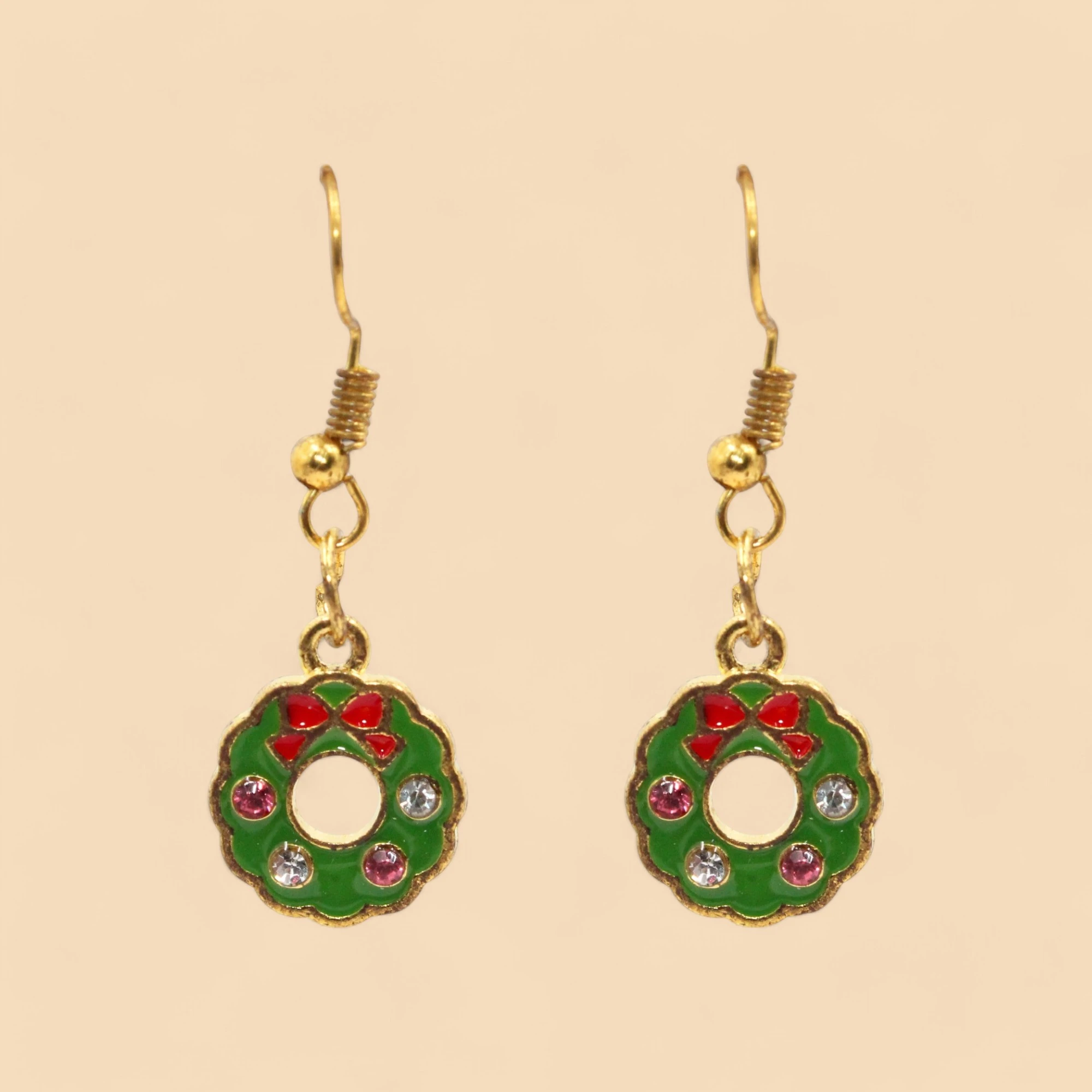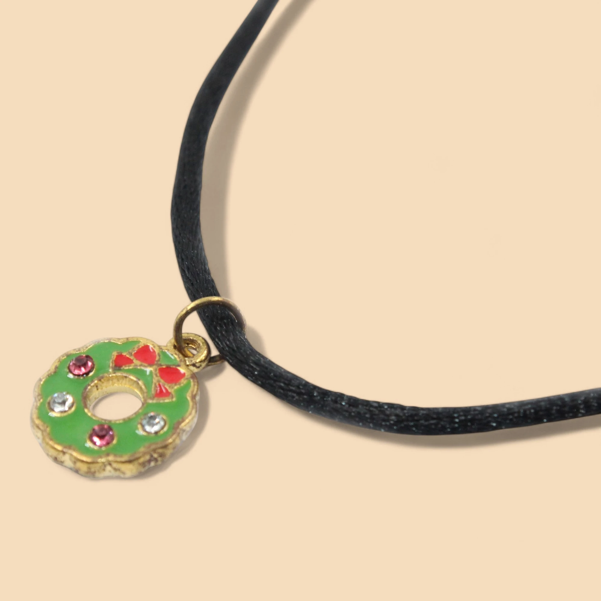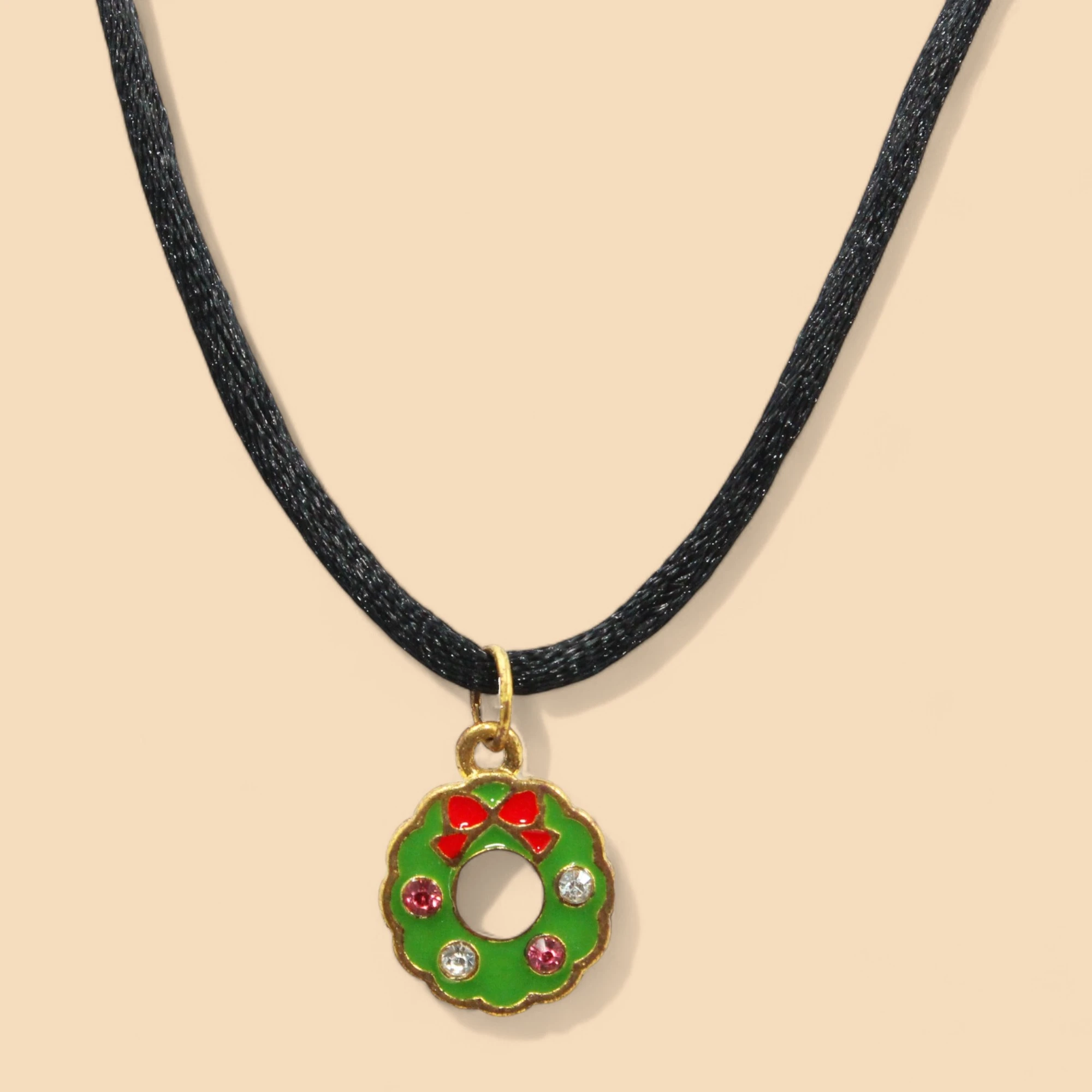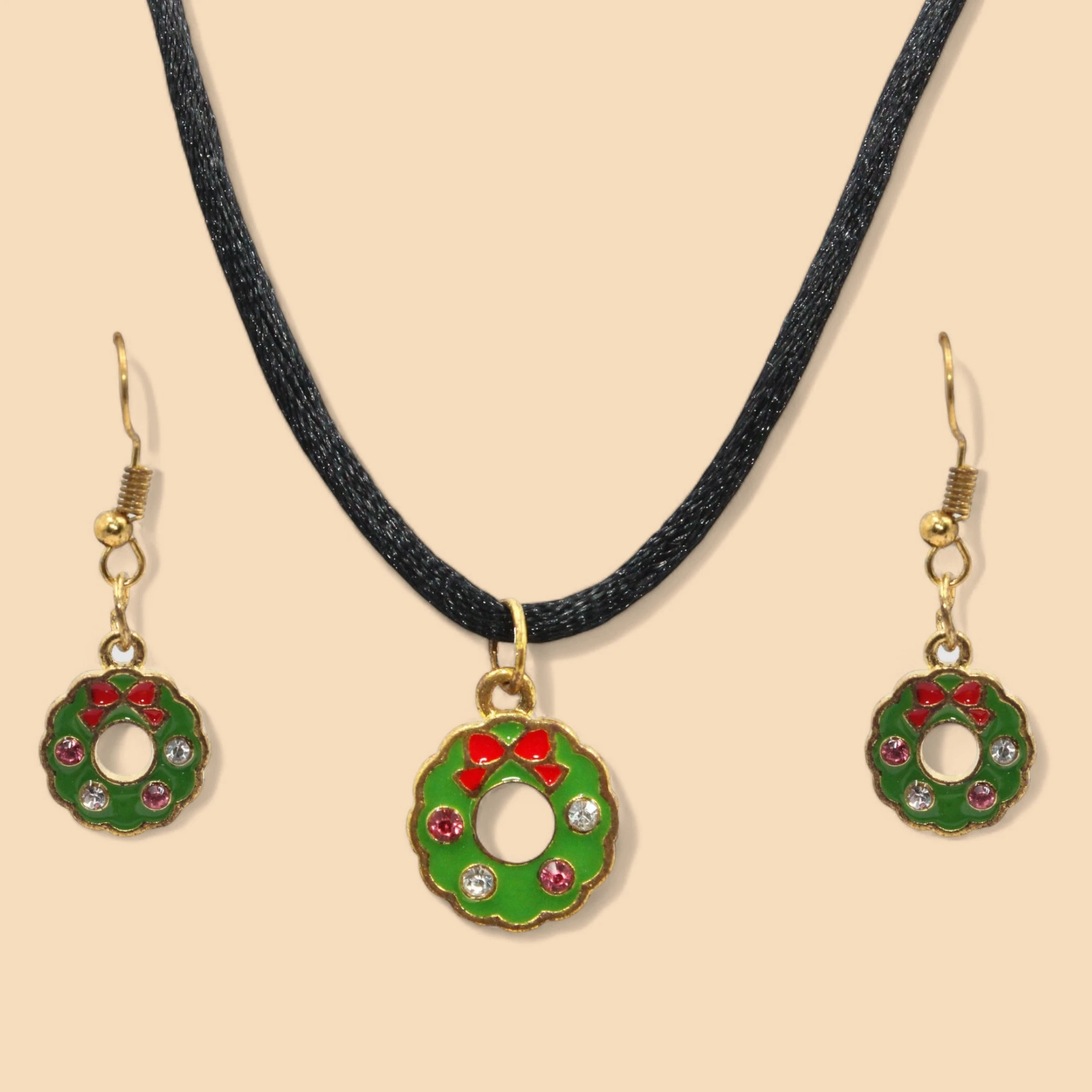 This image showcases a festive jewelry set consisting of a necklace and a pair of earrings. The necklace features a black cord with a pendant shaped like a Christmas wreath, adorned with red and green gemstones and a red bow at the top. The earrings match the pendant, each also designed as a Christmas wreath with similar red and green gemstones and a red bow. The jewelry set is designed to evoke the holiday spirit, making it a perfect accessory for festive occasions.