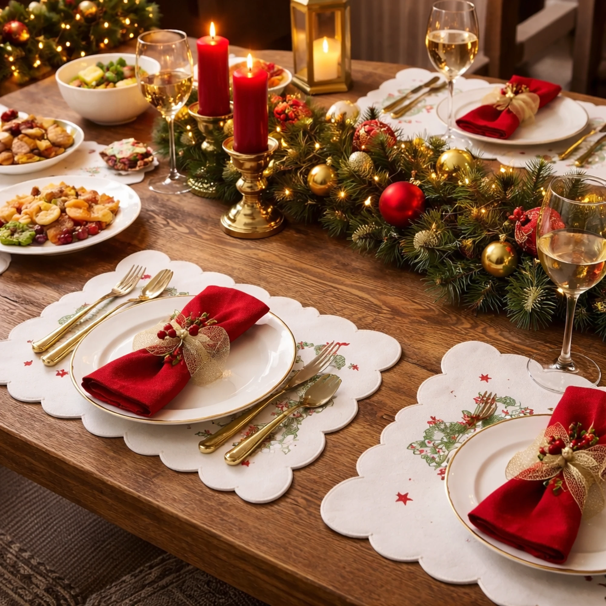 Bring holiday cheer to your dining table with a set of beautifully embroidered XMAS table mats. These delightful mats feature intricate embroidery, capturing the magic of Christmas with every detail.