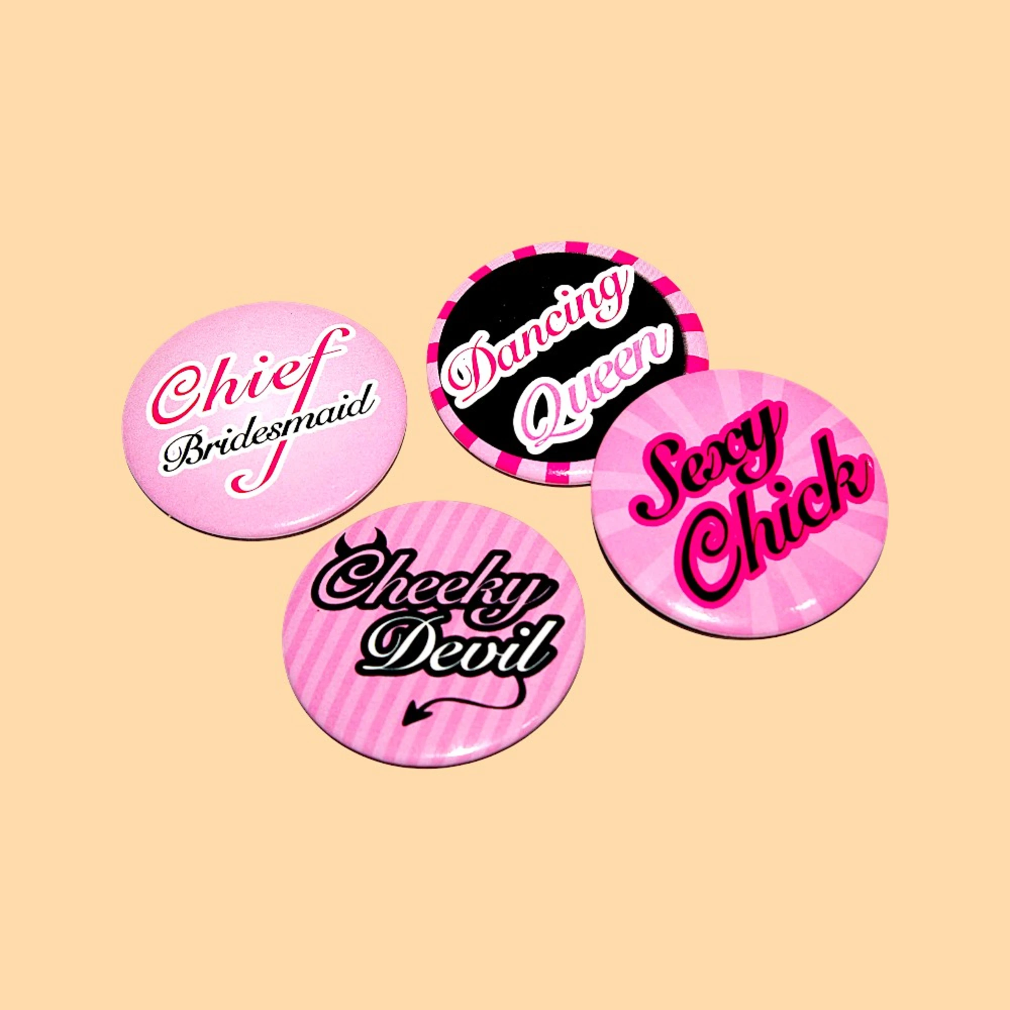 – Each set includes several unique badges with cheeky phrases and playful designs.