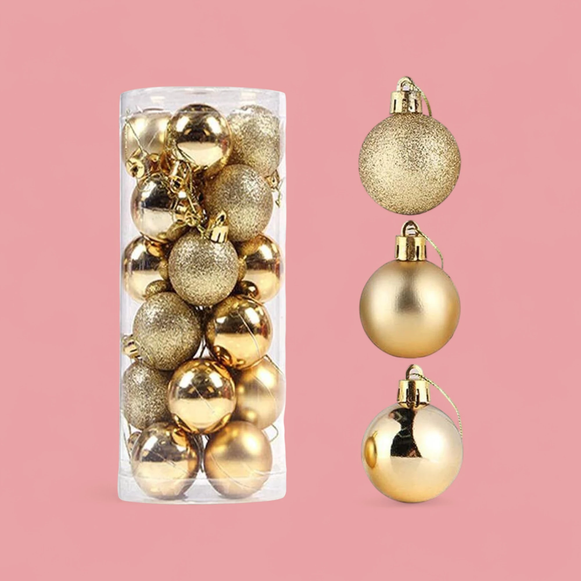 Add a touch of elegance to your holiday decor with these stunning gold Christmas tree baubles. Each bauble measures 4 cm in diameter, making them the perfect size to blend seamlessly with your existing decorations. The set includes 24 pieces, ensuring you have plenty to deck out your entire tree or add a pop of shine to wreaths and garlands.