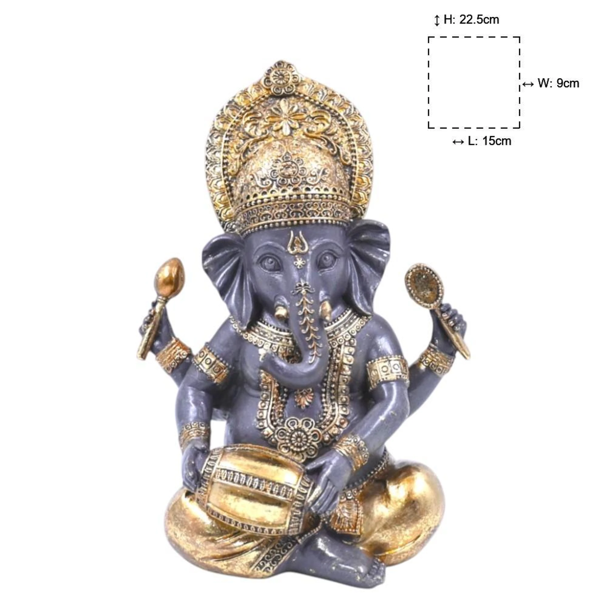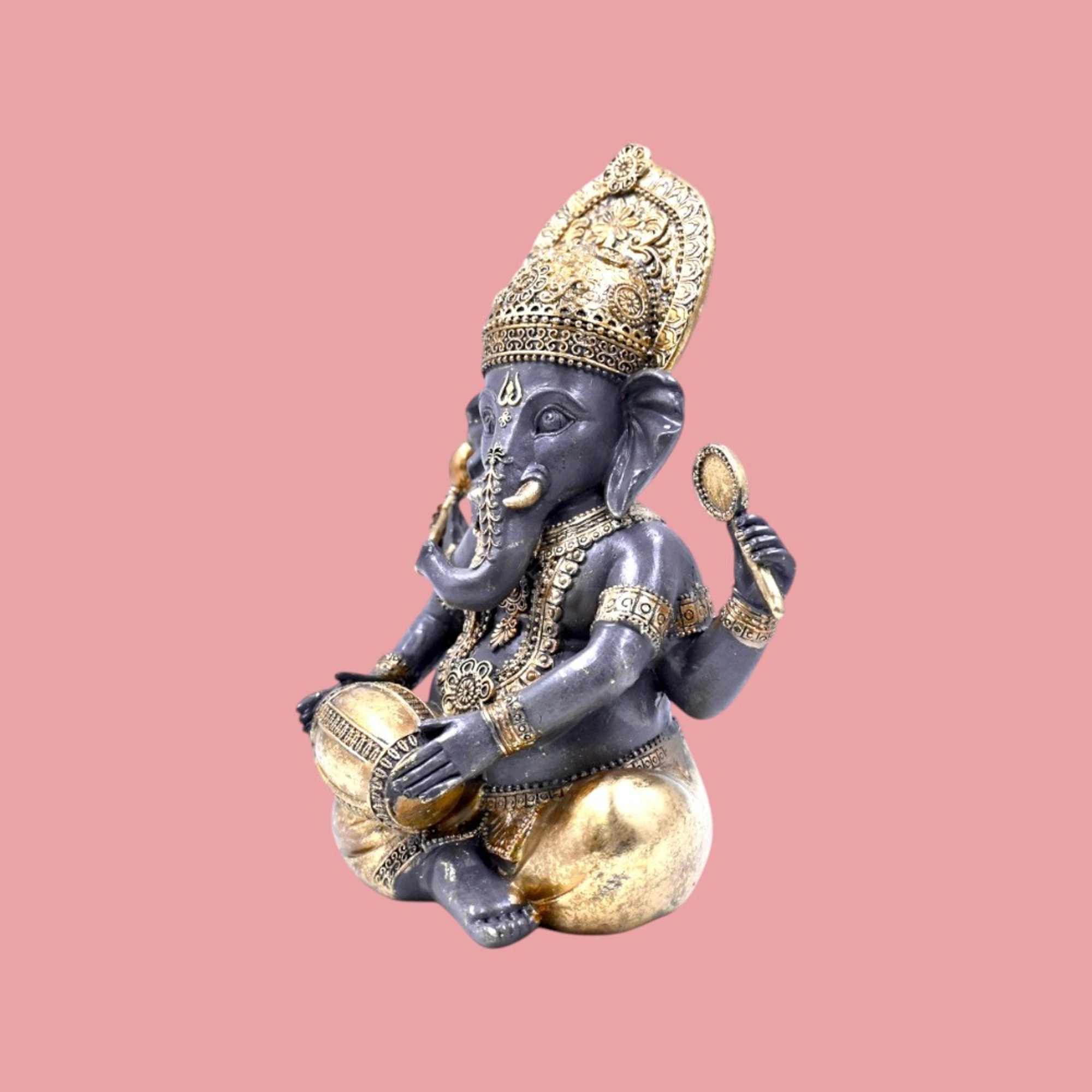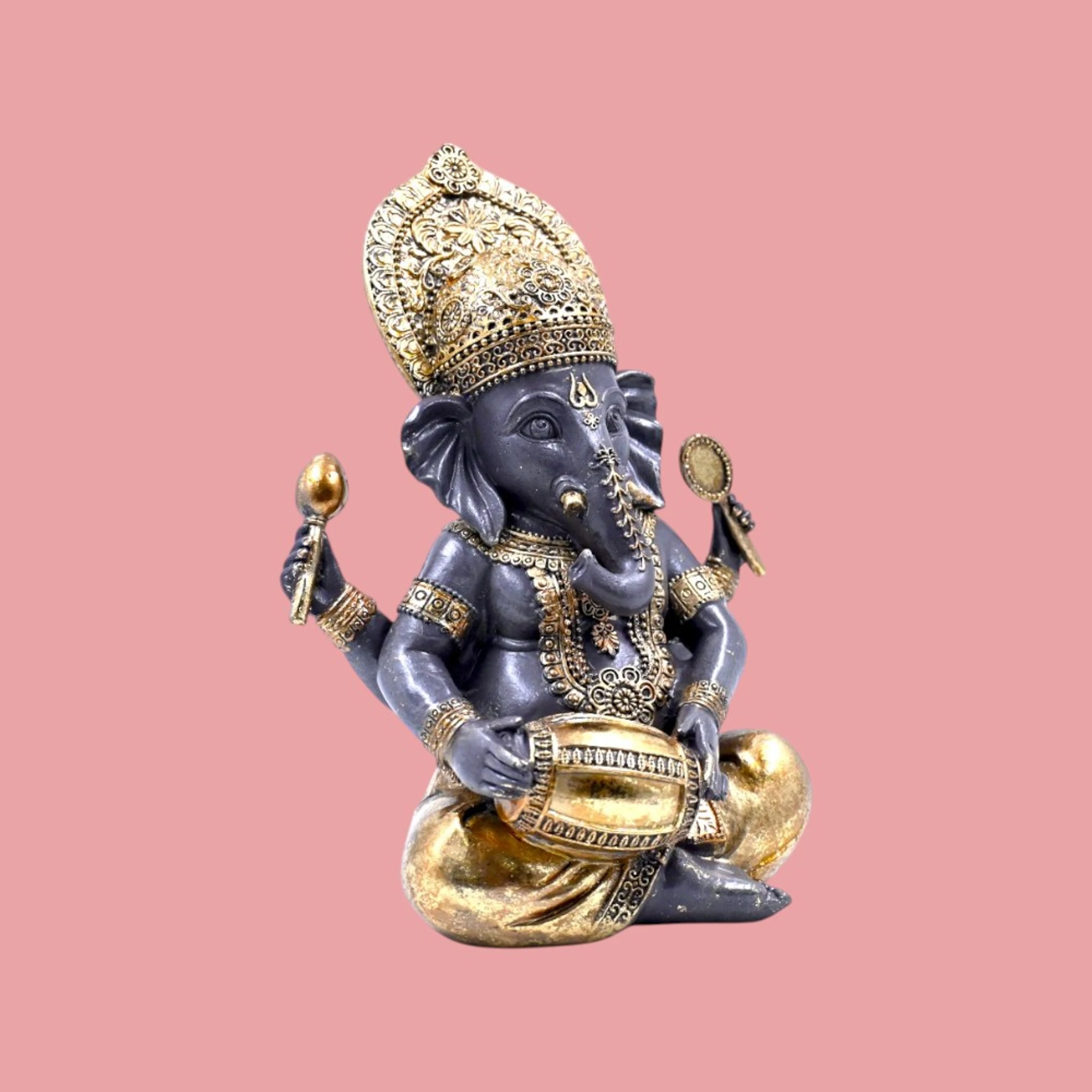 Add a touch of divine musical charm to your space with the Gold Ganapati Playing Dhol Figurine. This exquisite piece captures Lord Ganesh in a joyous moment, drumming away on a dhol drum.
