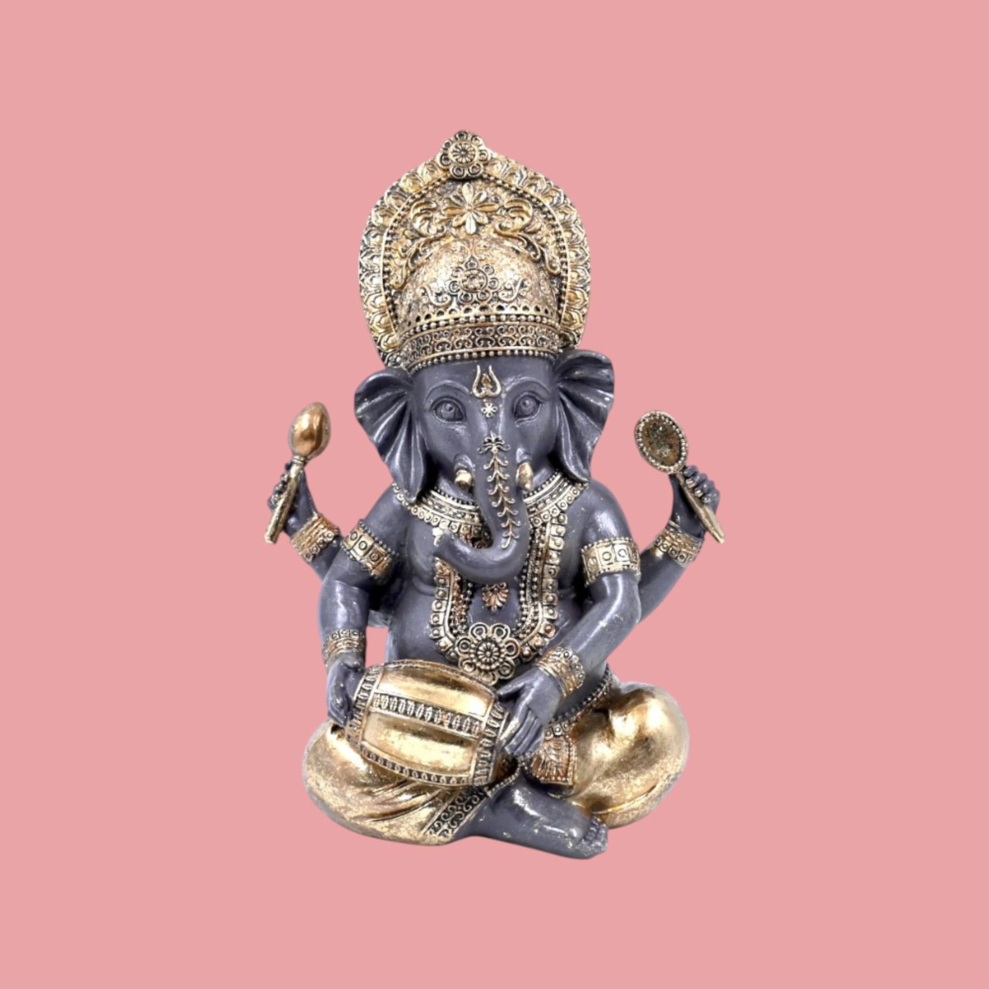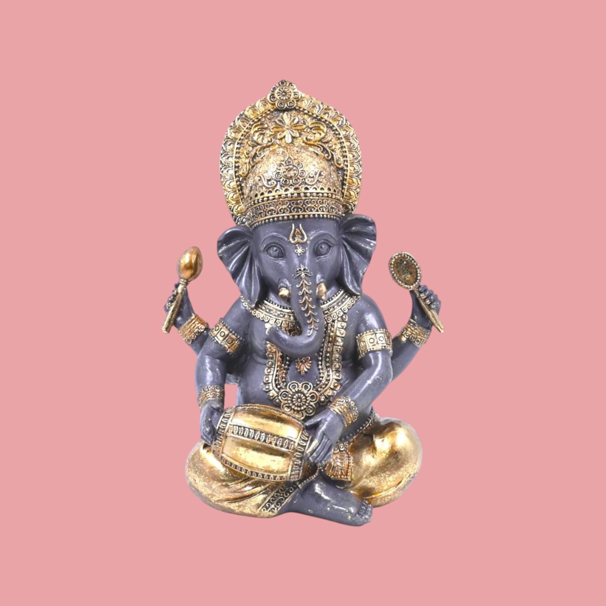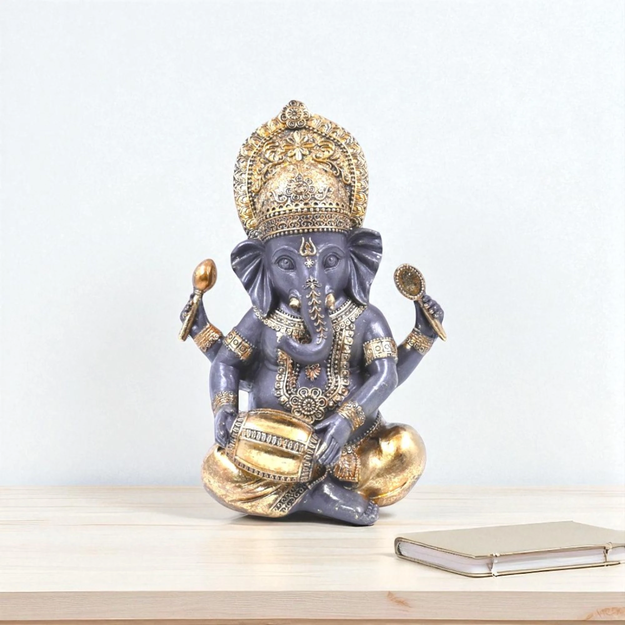 Add a touch of divine musical charm to your space with the Gold Ganapati Playing Dhol Figurine. This exquisite piece captures Lord Ganesh in a joyous moment, drumming away on a dhol drum.