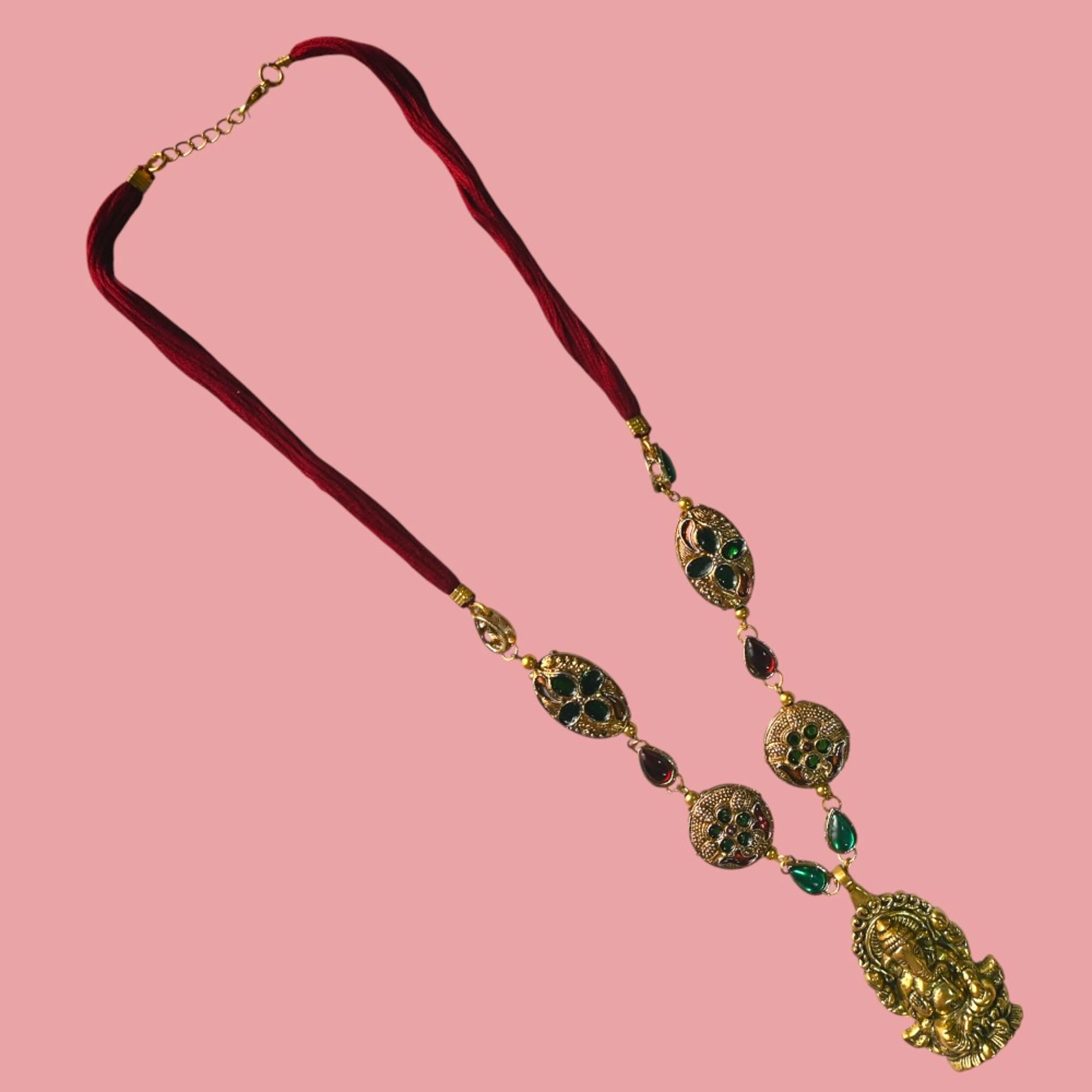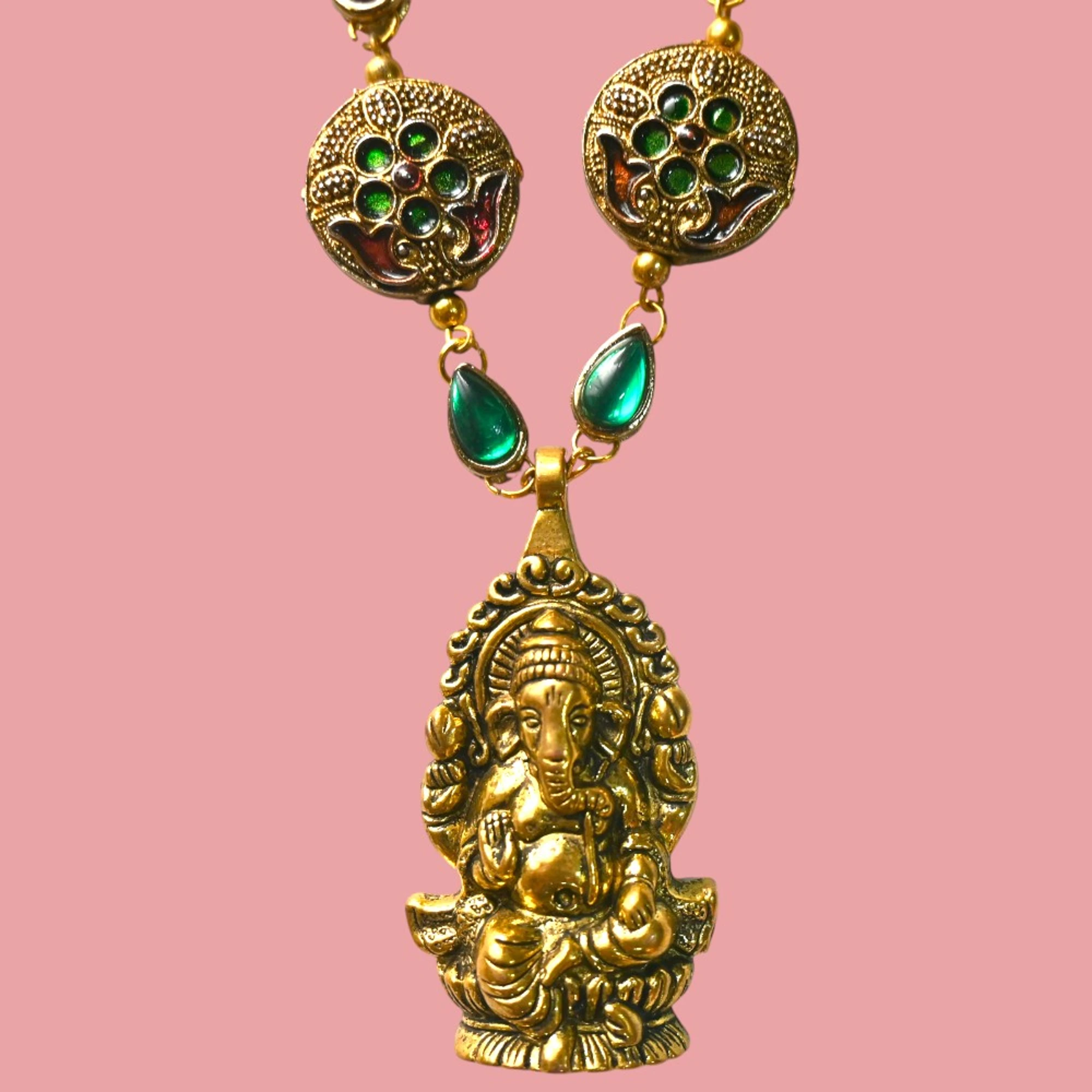 This Gold Ganpati Pendant and Earrings Set is perfect for those seeking a blend of spirituality and style. This elegant set features a gold-toned, intricately designed Ganpati pendant, harmoniously paired with matching earrings that reflect auspiciousness.