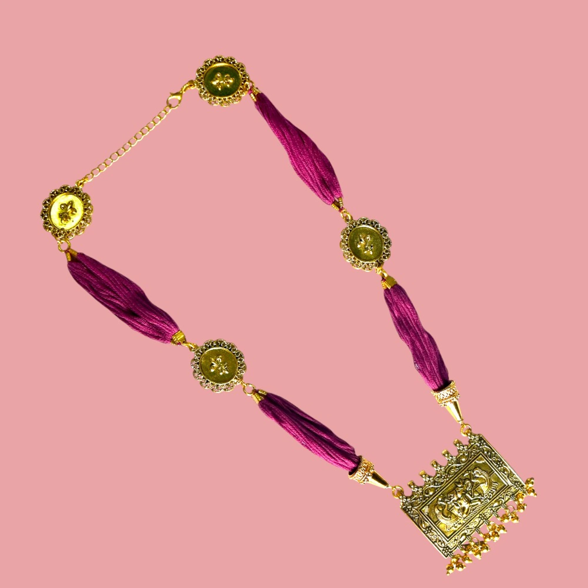 Add a touch of elegance to your wardrobe with this stunning Gold Pendant and Purple Thread Earring Set. The rich, golden pendant is beautifully complemented by striking purple thread accents, creating a stylish harmony that’s perfect for any occasion.