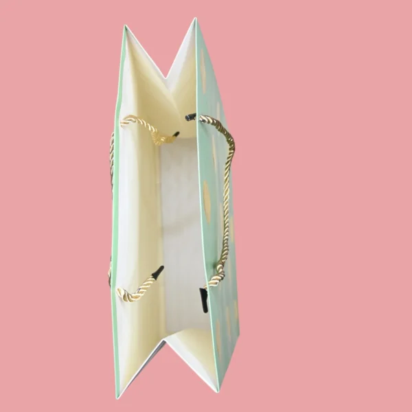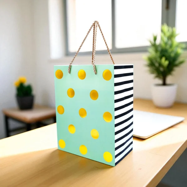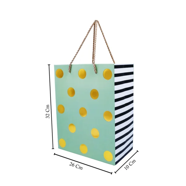 Add a dash of elegance to your gifting with our Gold Polka Dot Paper Gift Bag in a refreshing pista shade. Perfectly sized at 18x23x10 cm, these small bags are ideal for presenting a variety of gifts from jewelry to small trinkets.