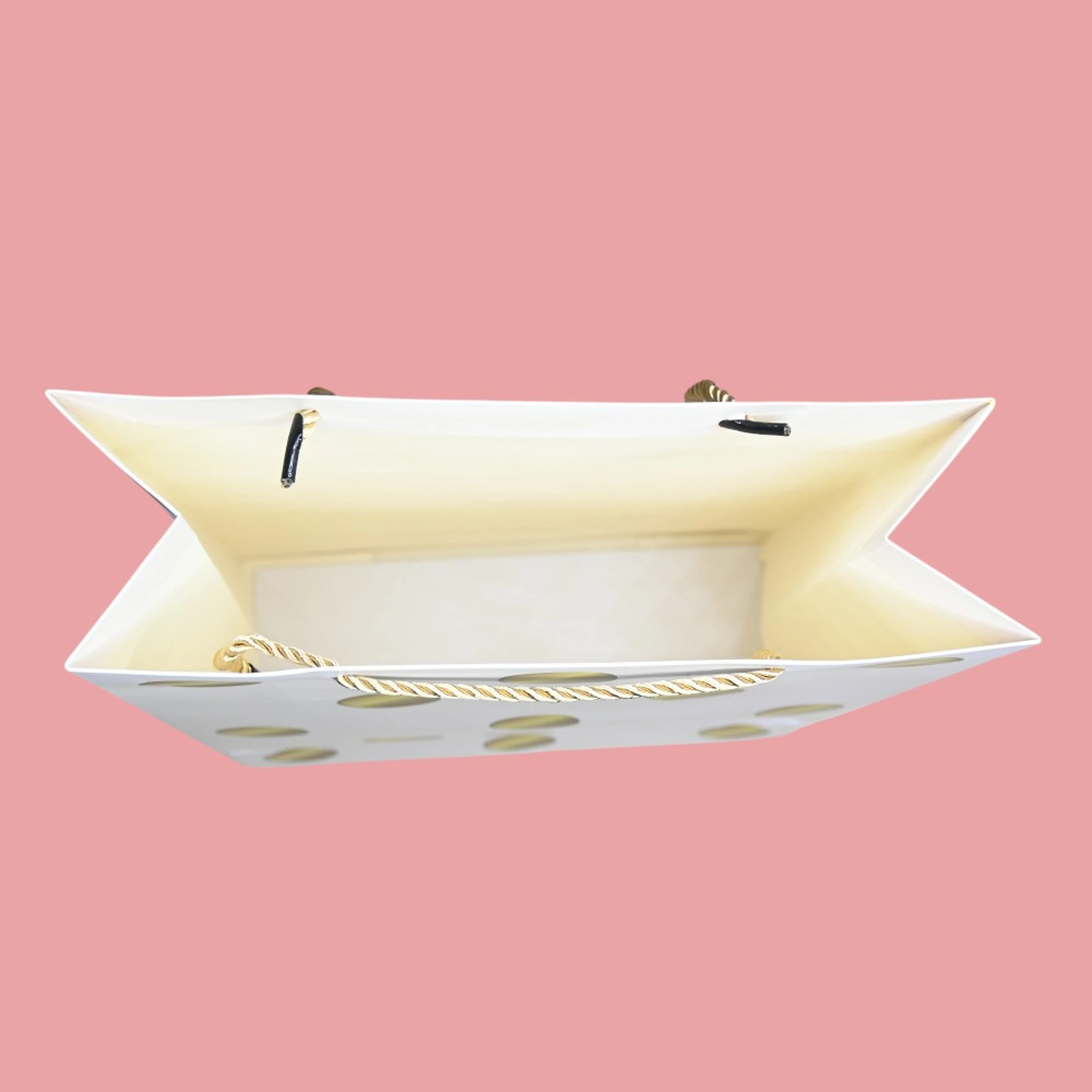– Stylish Design: Gleaming gold polka dots dance across a pristine white background, creating a festive and eye-catching presentation.