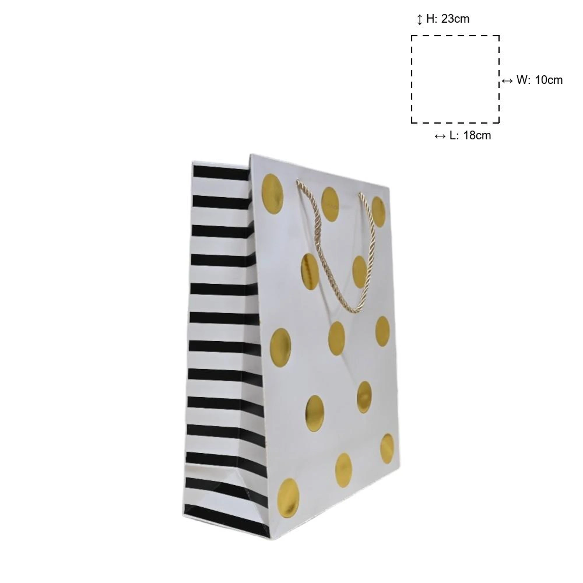 Add a touch of elegance to any present with these charming Gold Polka Dot Paper Gift Bags. Perfectly sized at 182310, these small bags are ideal for gifting treasures, treats, or tokens of appreciation.