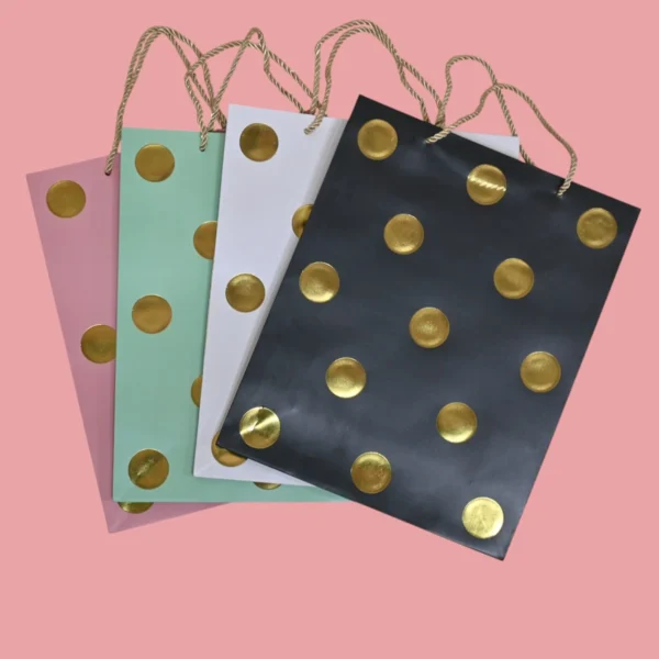 Perfect for any celebration, the Gold Polka Dot Paper Gift Bag in a delightful pink hue adds a touch of elegance to your gift-giving. Sized at 18 x 23 x 10 cm, these small bags are ideal for your presents and party favors.
