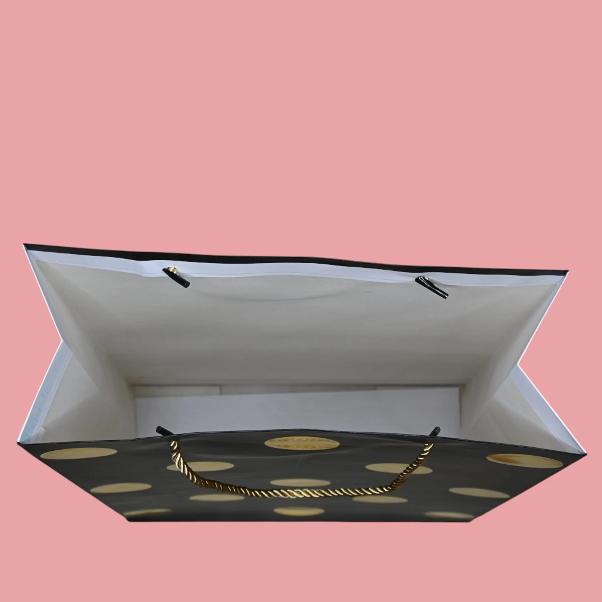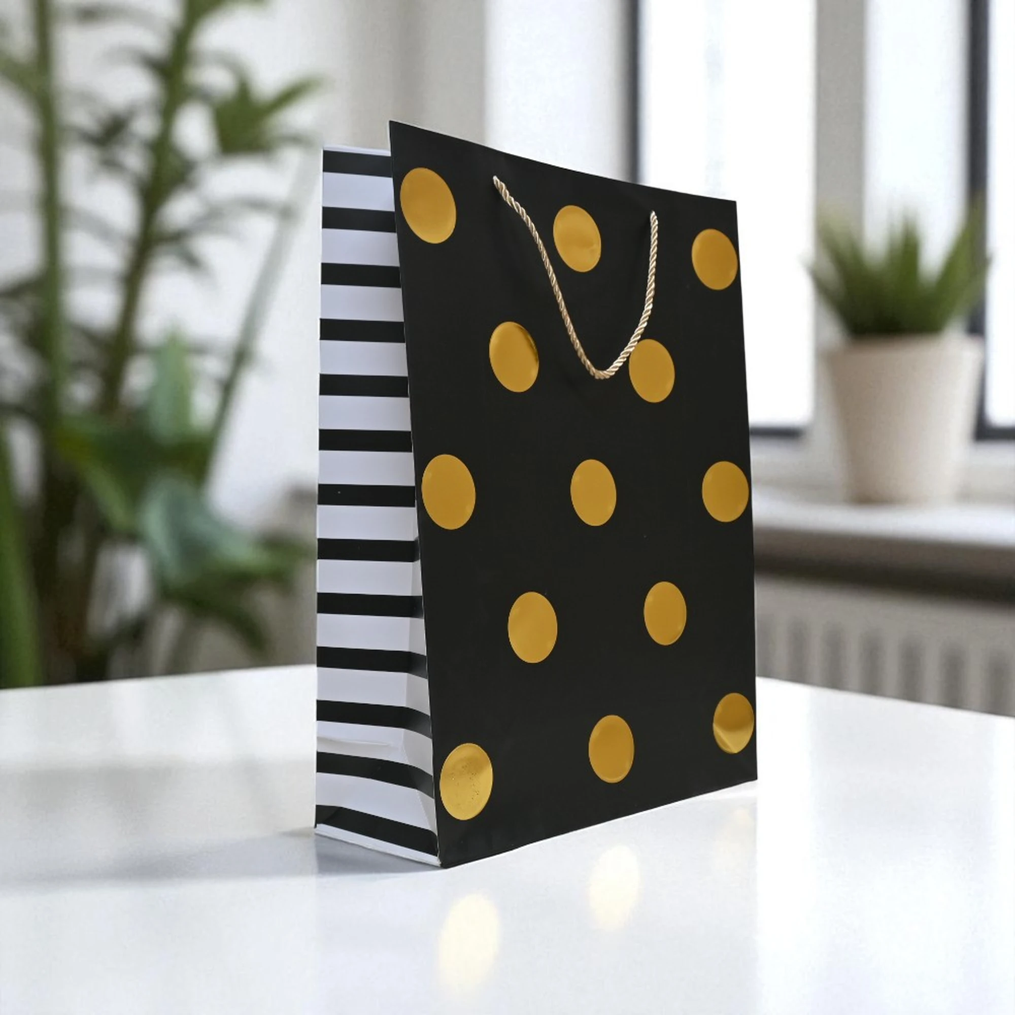 – Eye-Catching Design: The chic gold polka dots on the classic black background make these bags a standout.