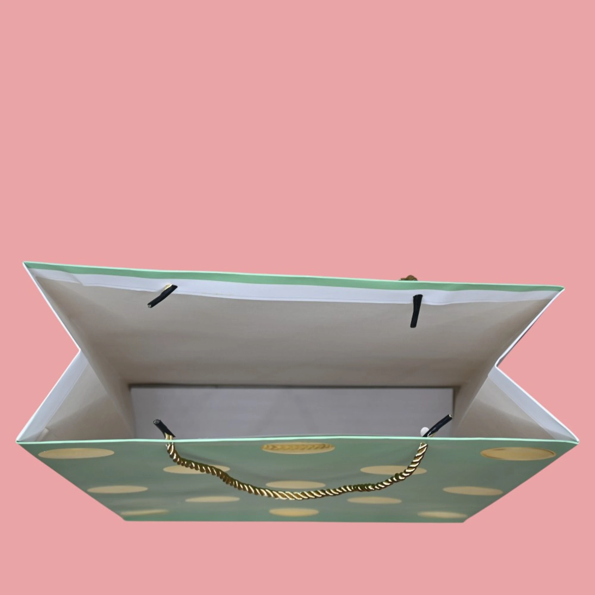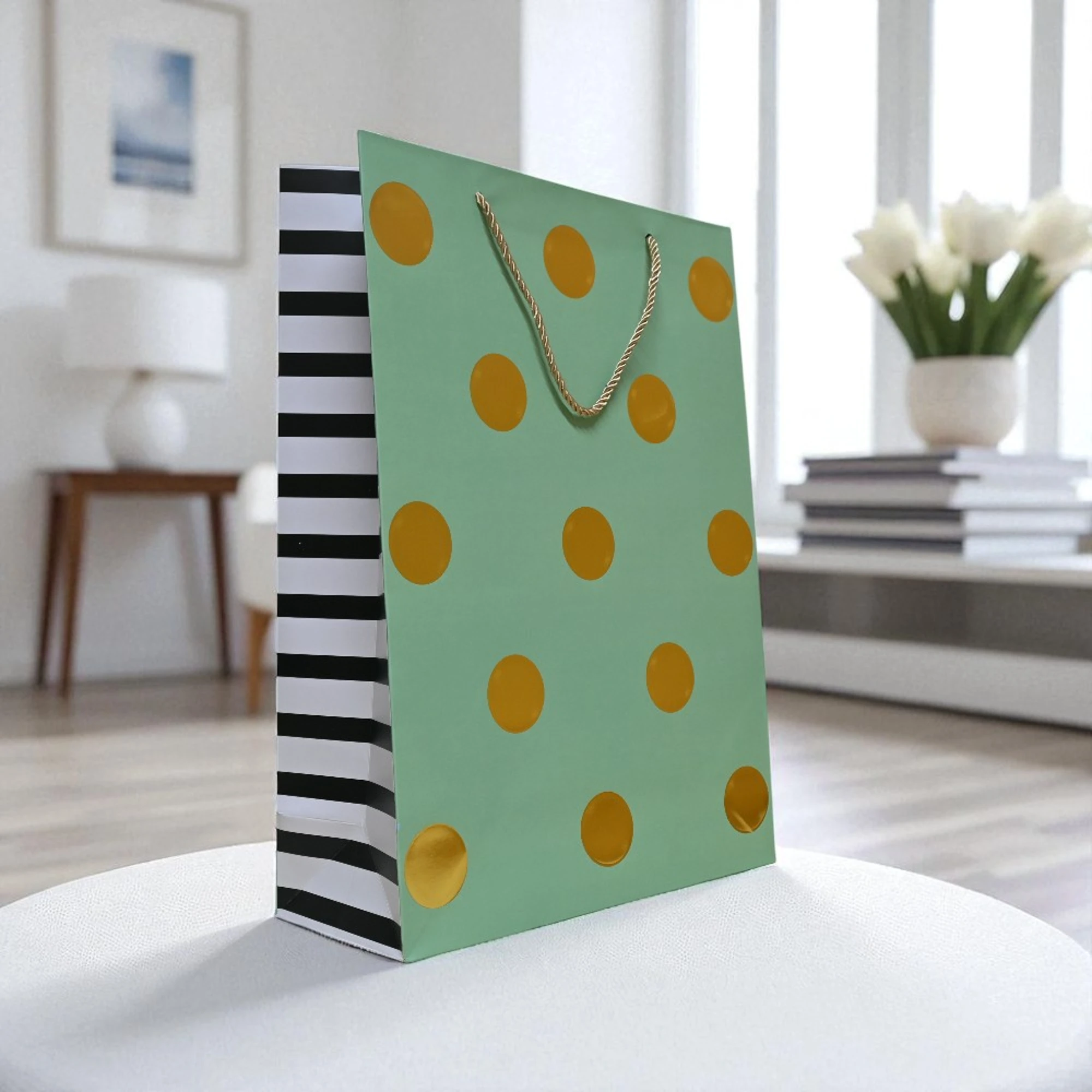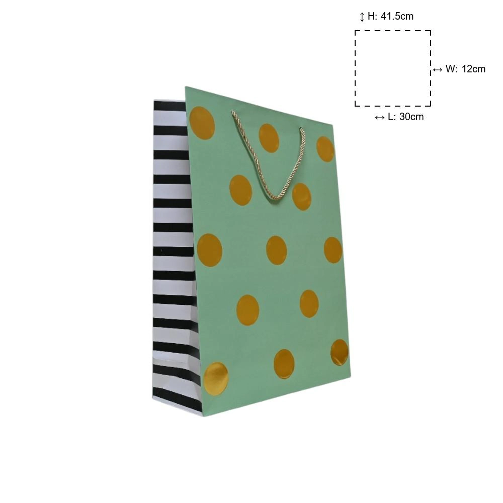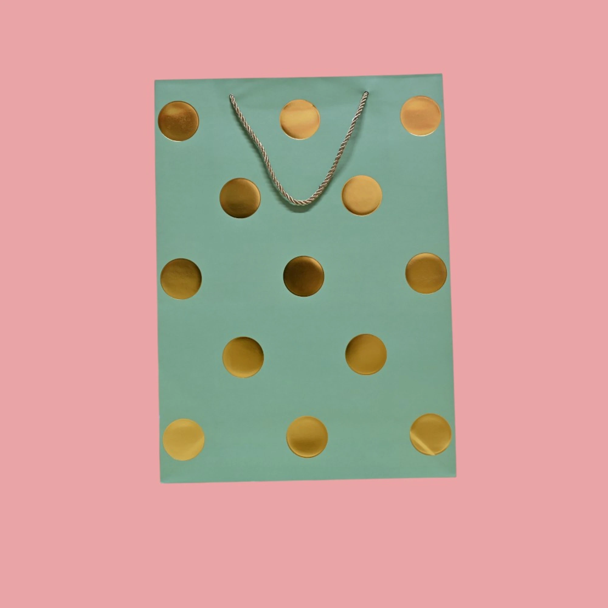– Stylish Design: These bags feature an elegant gold polka dot pattern on a soothing pista green backdrop.