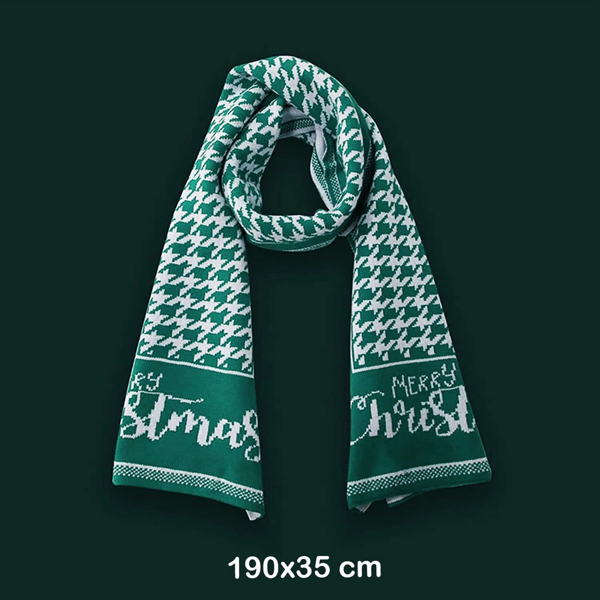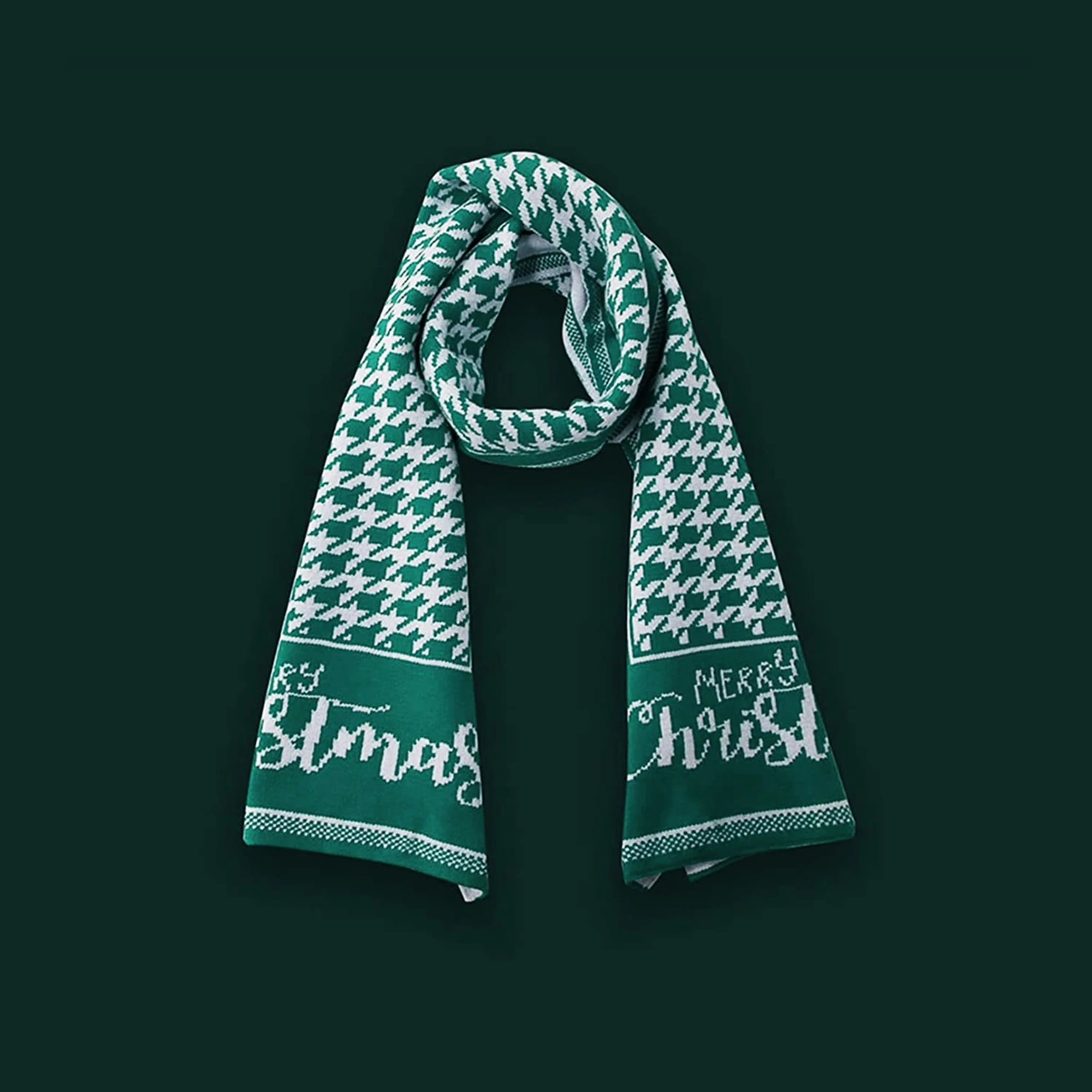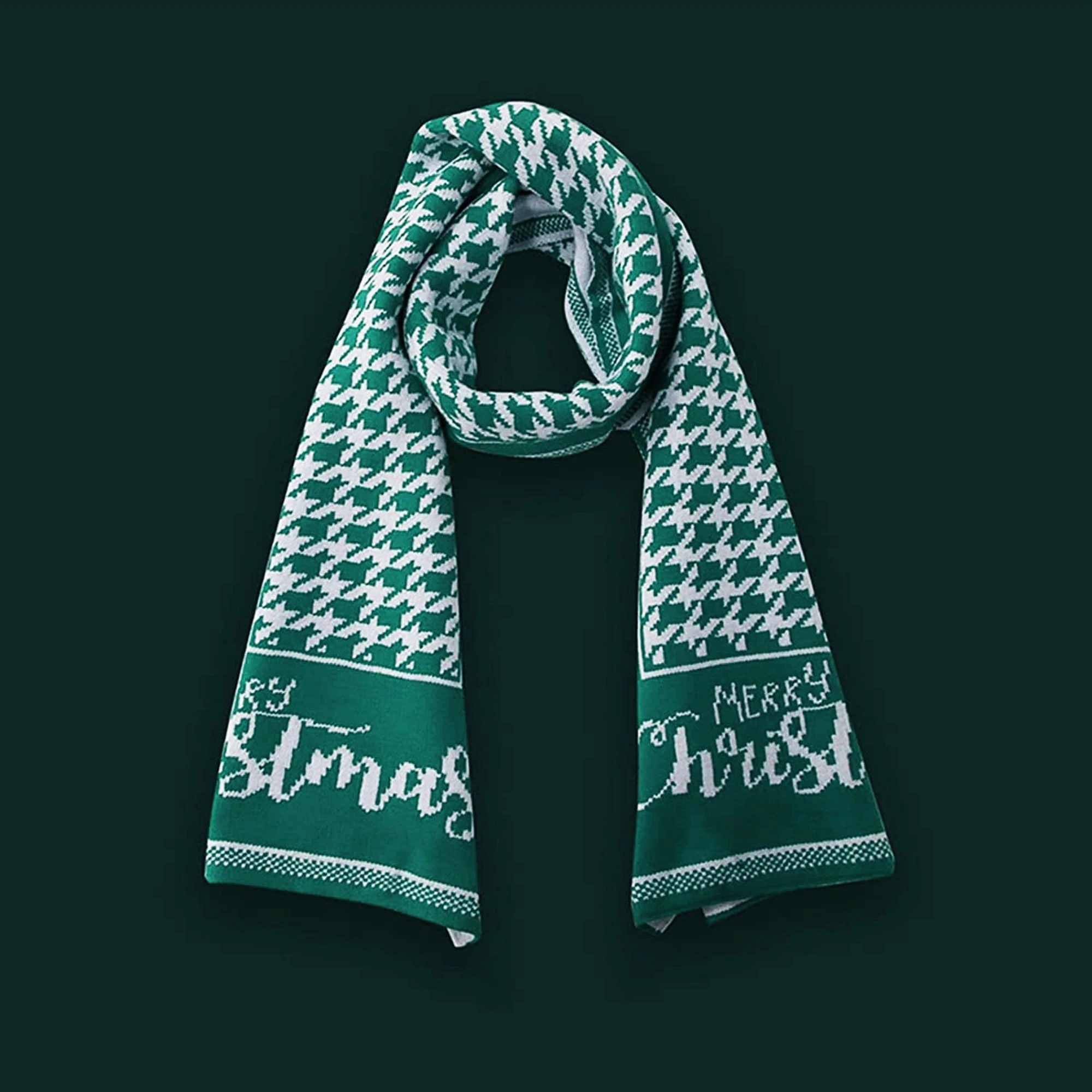 The image shows a green and white scarf with a houndstooth pattern. The scarf has a festive design with the words “Merry Christmas” knitted into it. The text is divided between the two ends of the scarf, with “Merry” on one end and “Christmas” on the other. The scarf appears to be made of a knitted fabric and is displayed against a dark green background. This image is interesting and relevant as it depicts a holiday-themed accessory, which could be of interest for seasonal fashion or gift ideas.