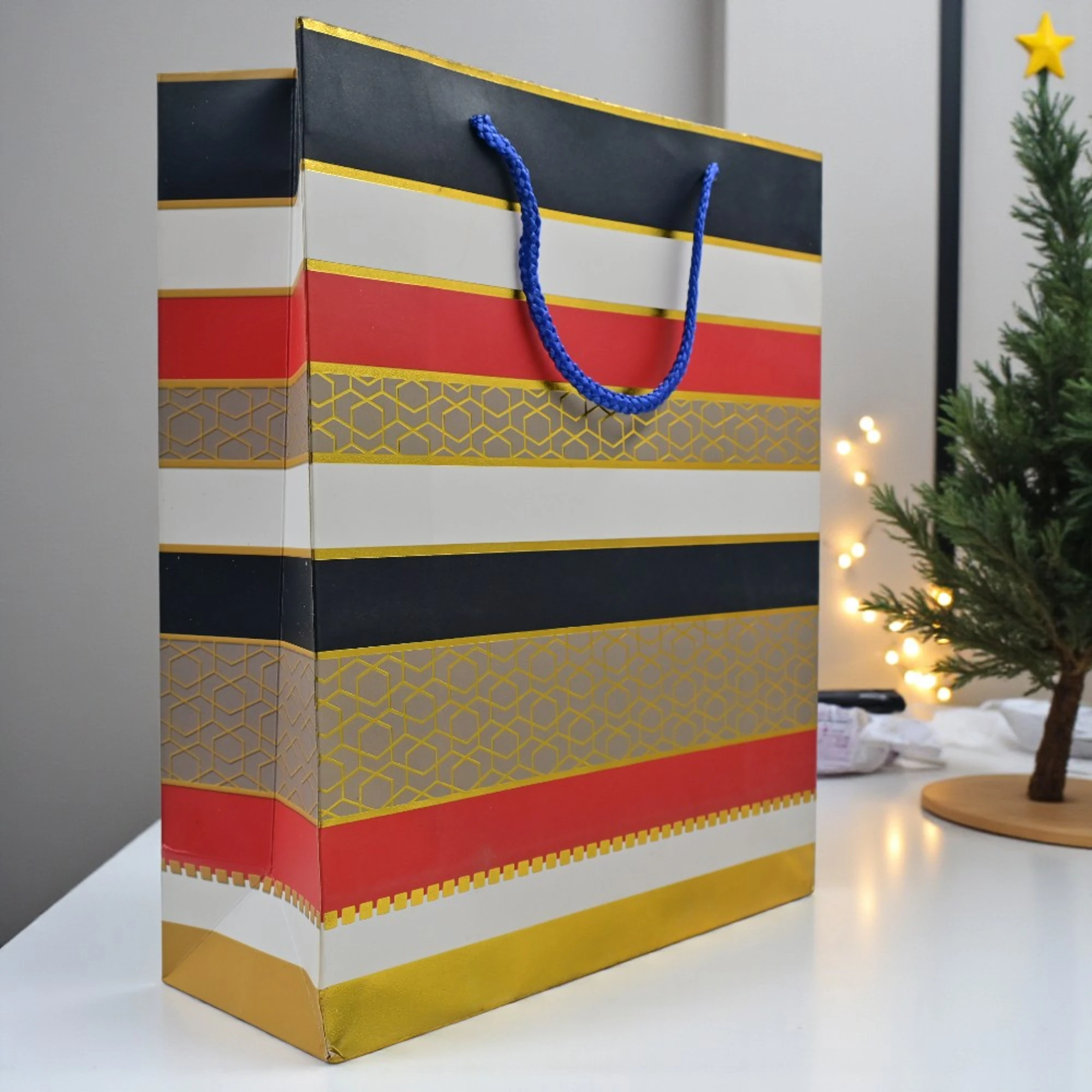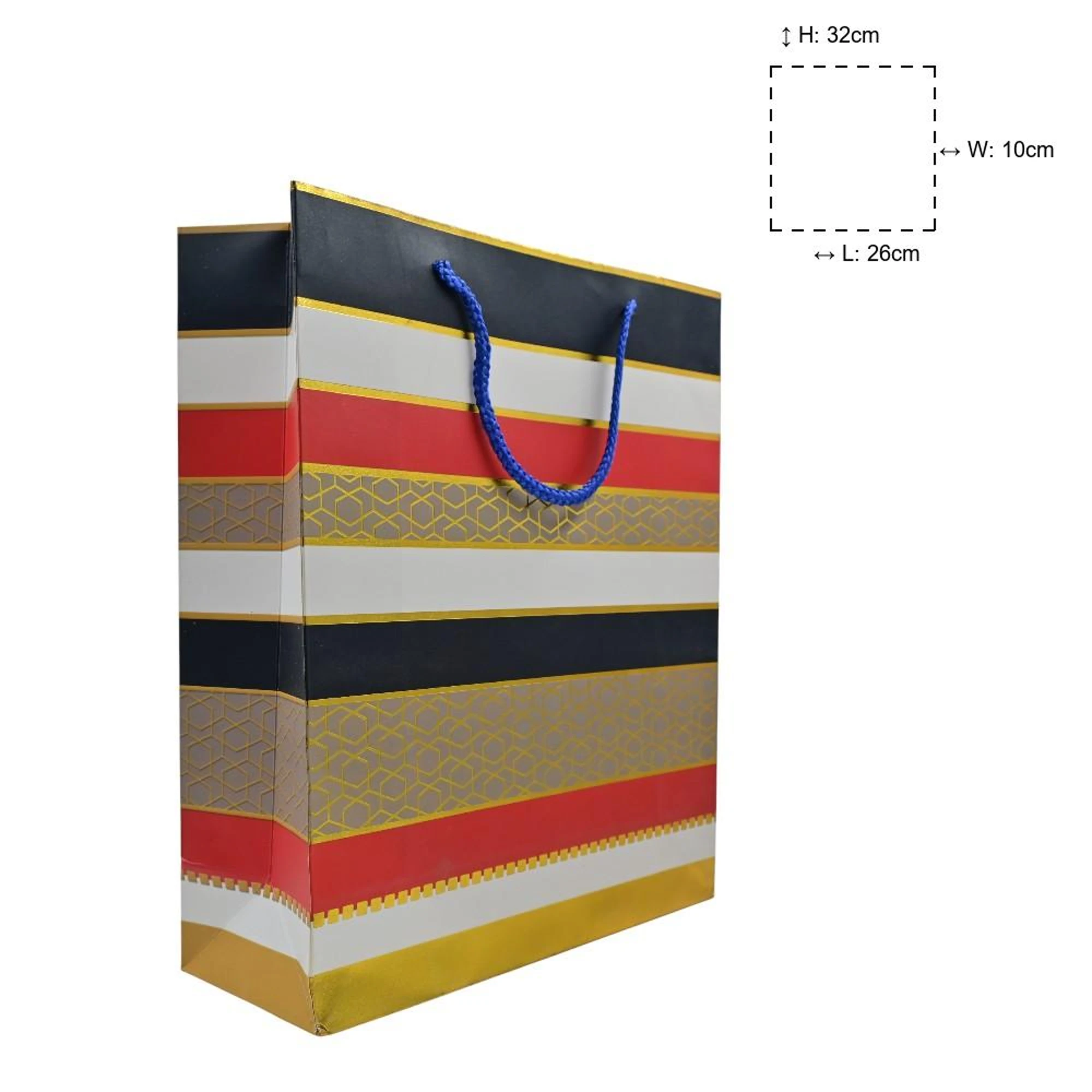Add a splash of style and sustainability to your gift-giving with our Horizontal Lines Paper Bags. Each bag in this delightful set of six boasts eye-catching horizontal lines, making your presents stand out. Crafted with a sturdy 26x32x10 cm size, these bags are perfect for birthdays, holidays, or any special occasion.
