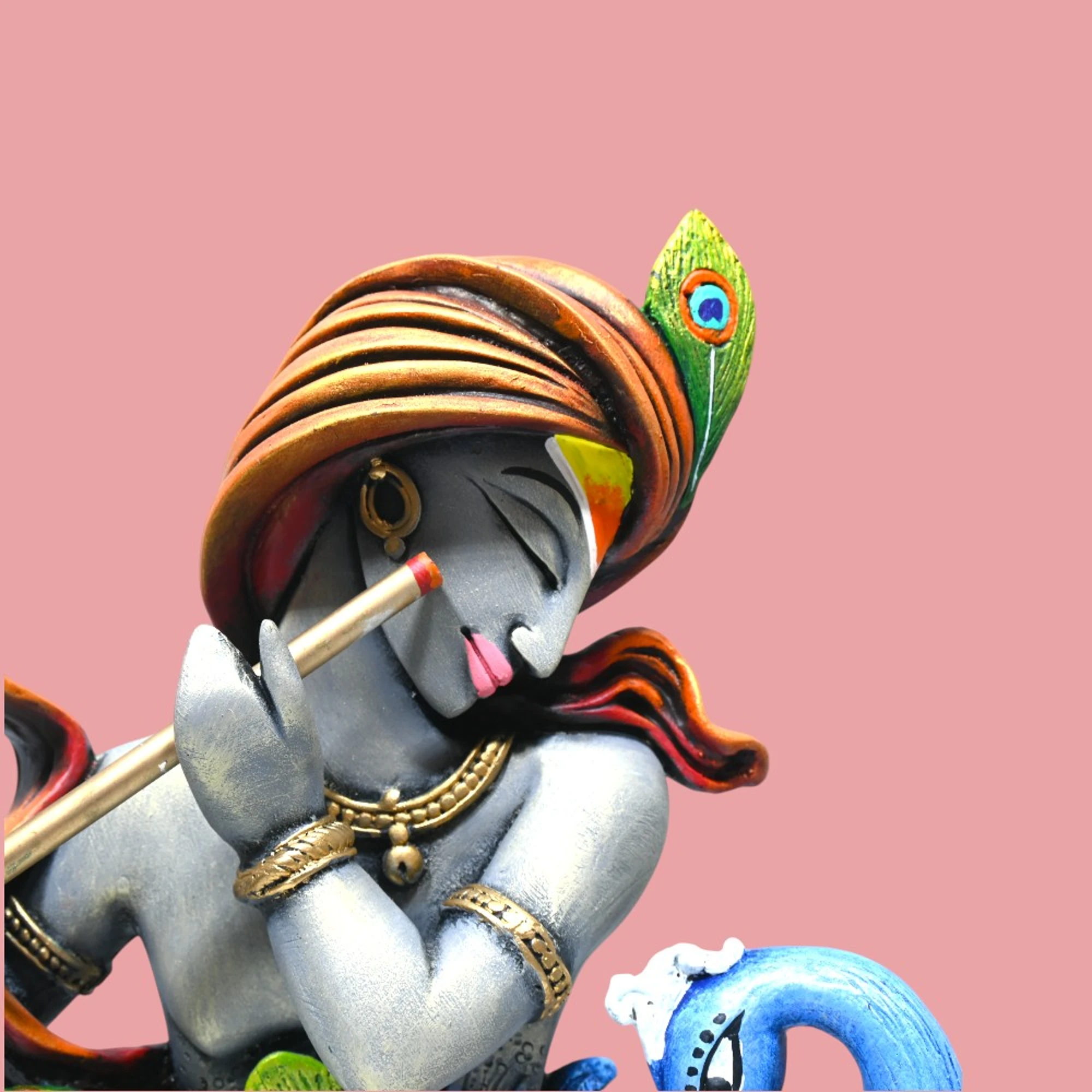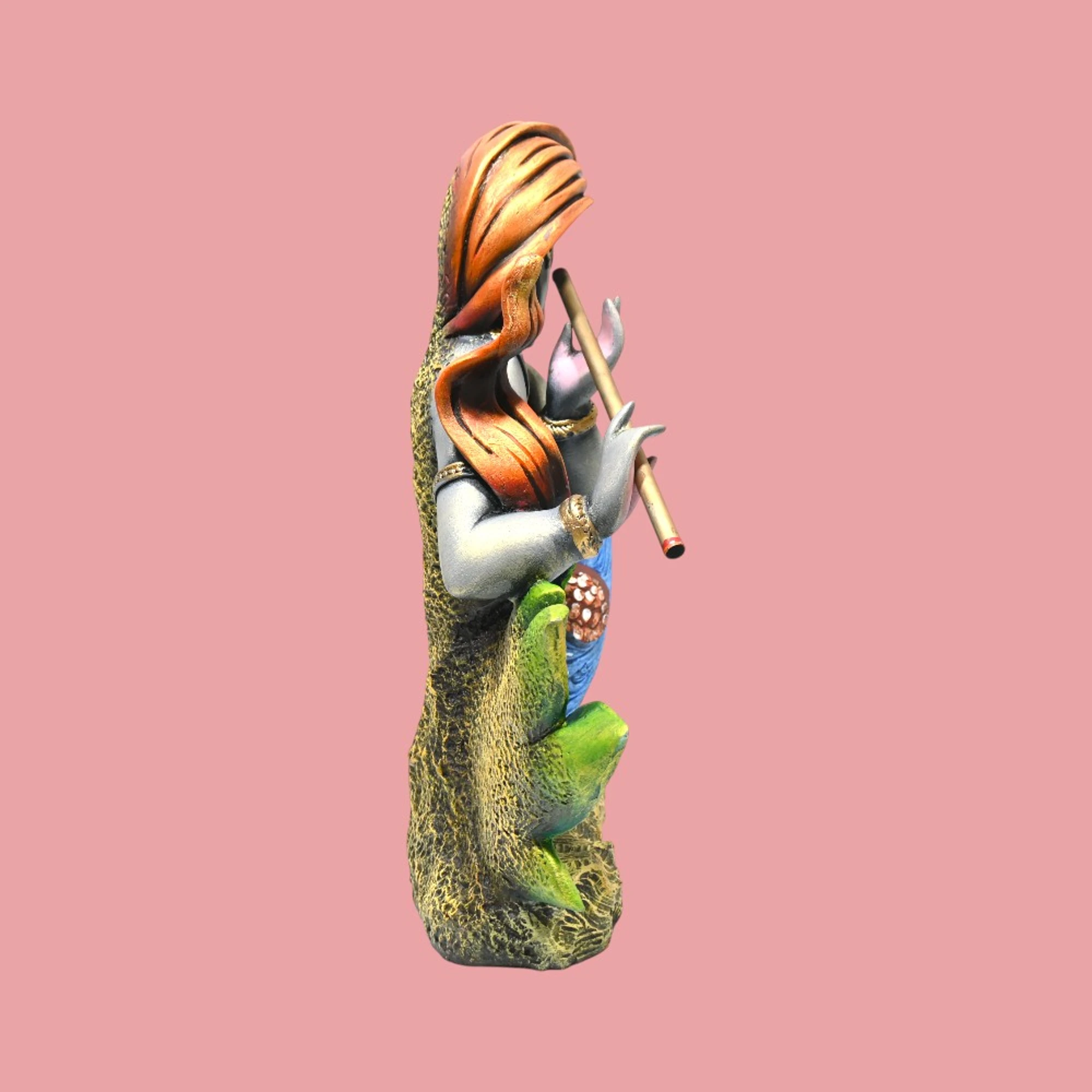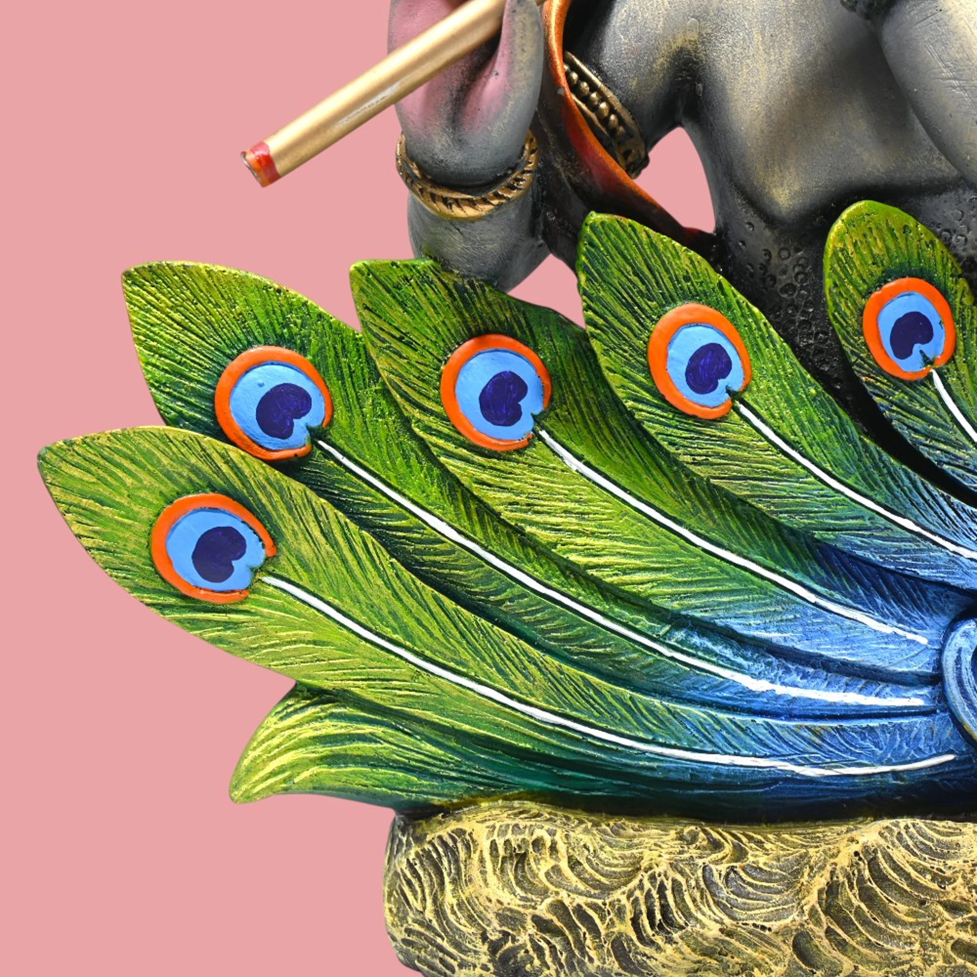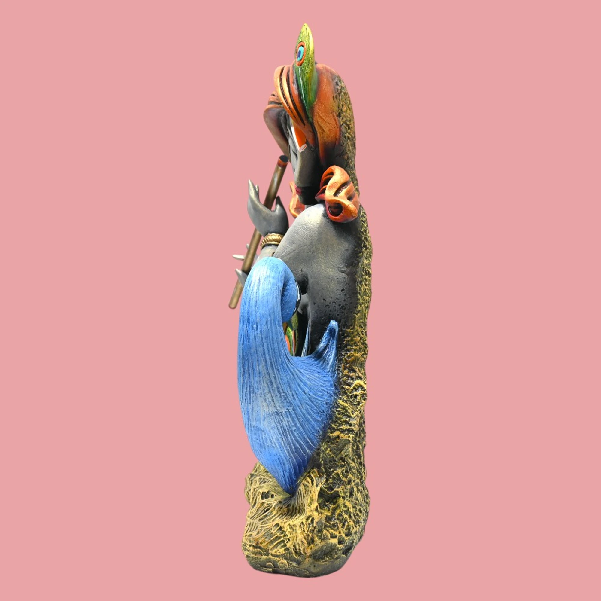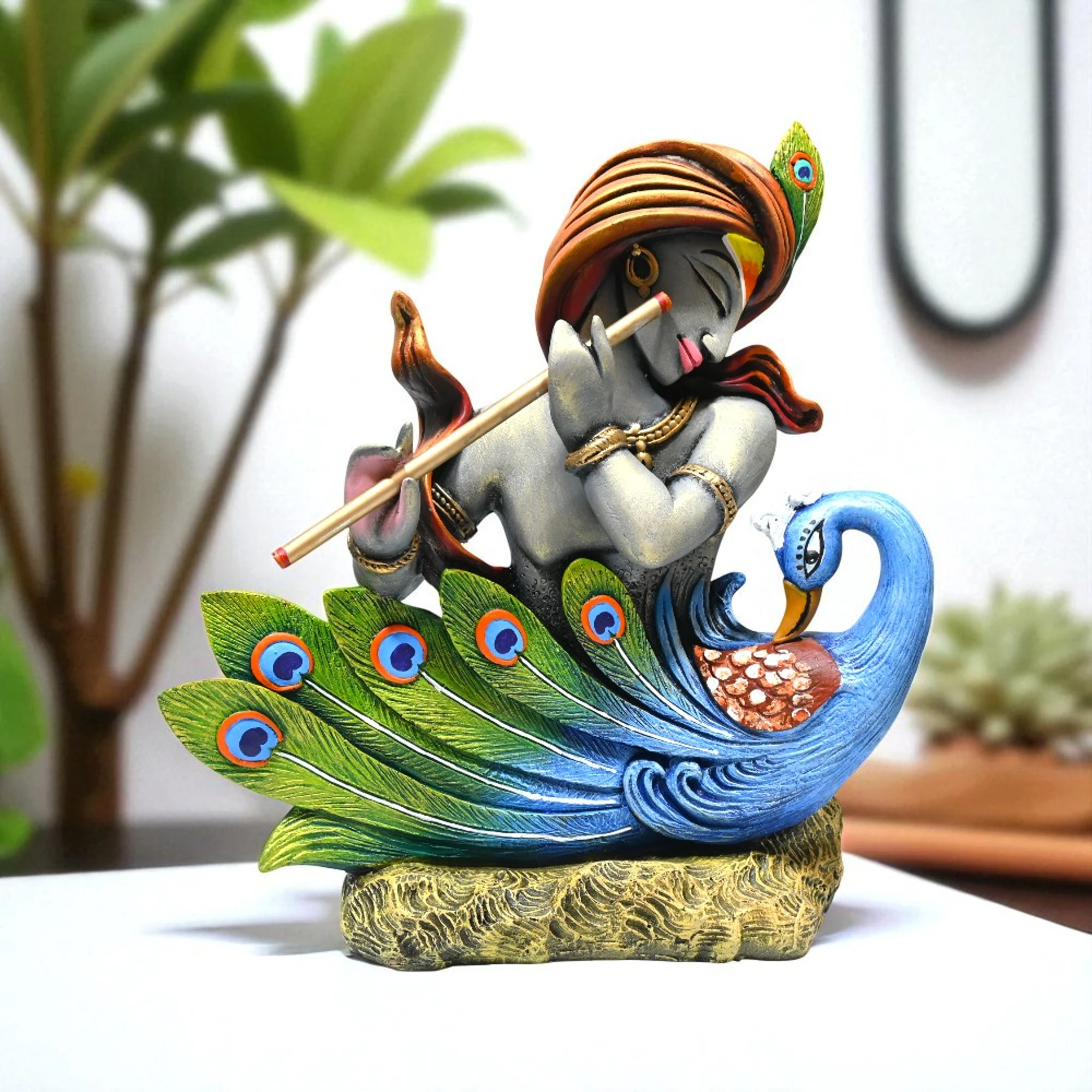 Every detail on this figurine is rendered with utmost precision. From Krishna’s serene expression to the intricately detailed feathers of the peacock, each element is designed to reflect a sense of spiritual peace and natural beauty. Whether placed on a mantel, a coffee table, or a special niche in your living area, this figurine radiates a tranquil and inviting aura.