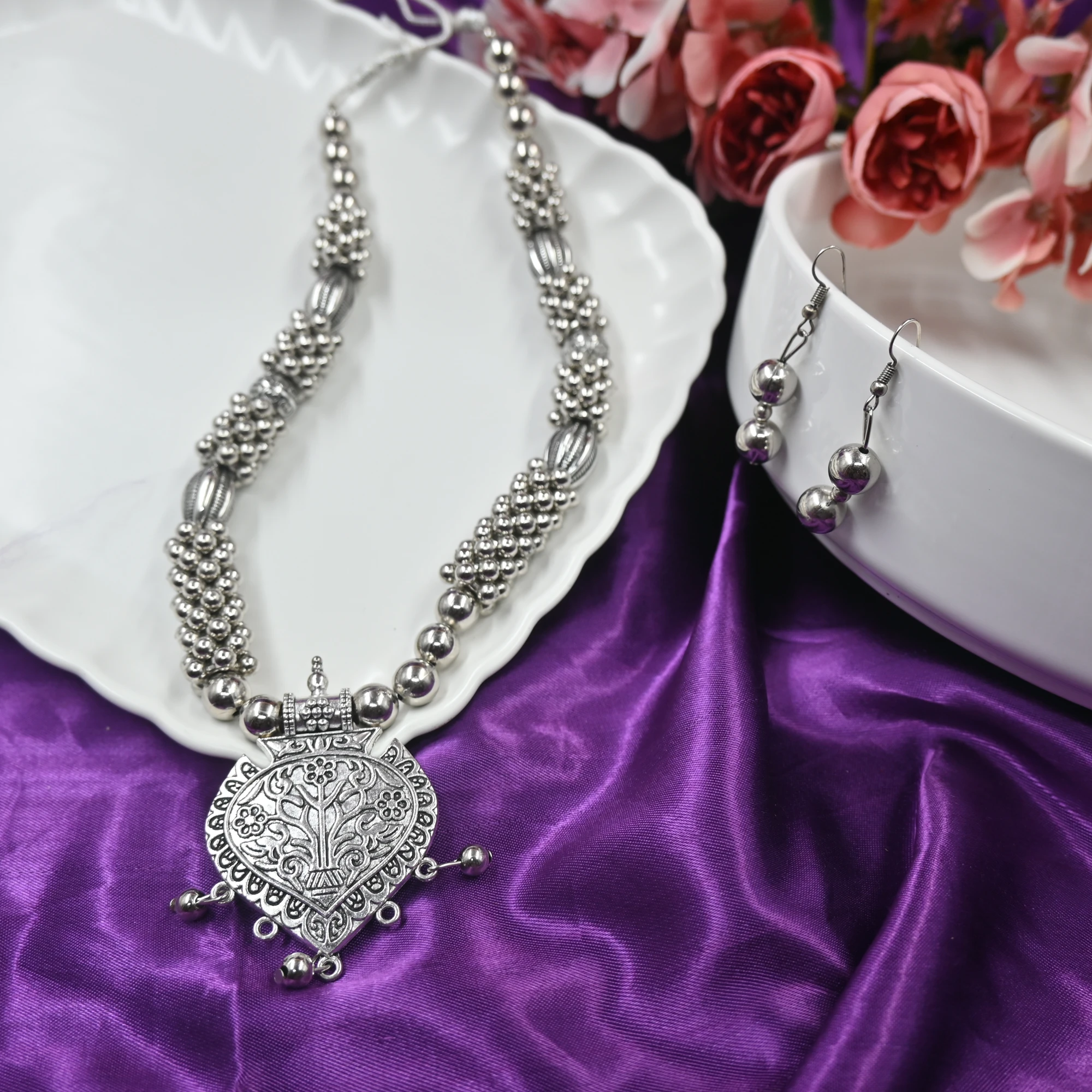 Each piece radiates sophistication, combining the timeless allure of silver with the delicate beauty of leaf design. Whether dressing up for an evening out or adding a touch of elegance to your everyday ensemble, this set will complement your style effortlessly. Add this stunning accessory to your collection and feel the elegance around your neck and ears. Gift yourself or a loved one with nature-inspired beauty.
