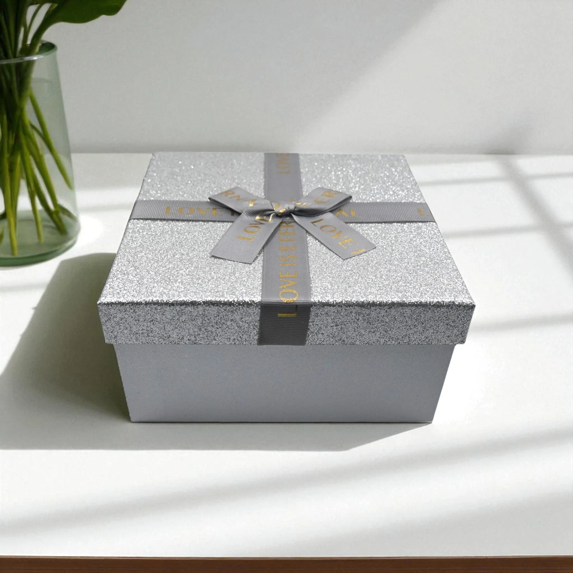 Wrap your gifts with an extra touch of magic with our LOVE IS ETERNAL Glitter Square Gift Box. This big, shimmering box is perfect for those special presents that deserve more than ordinary wrapping.