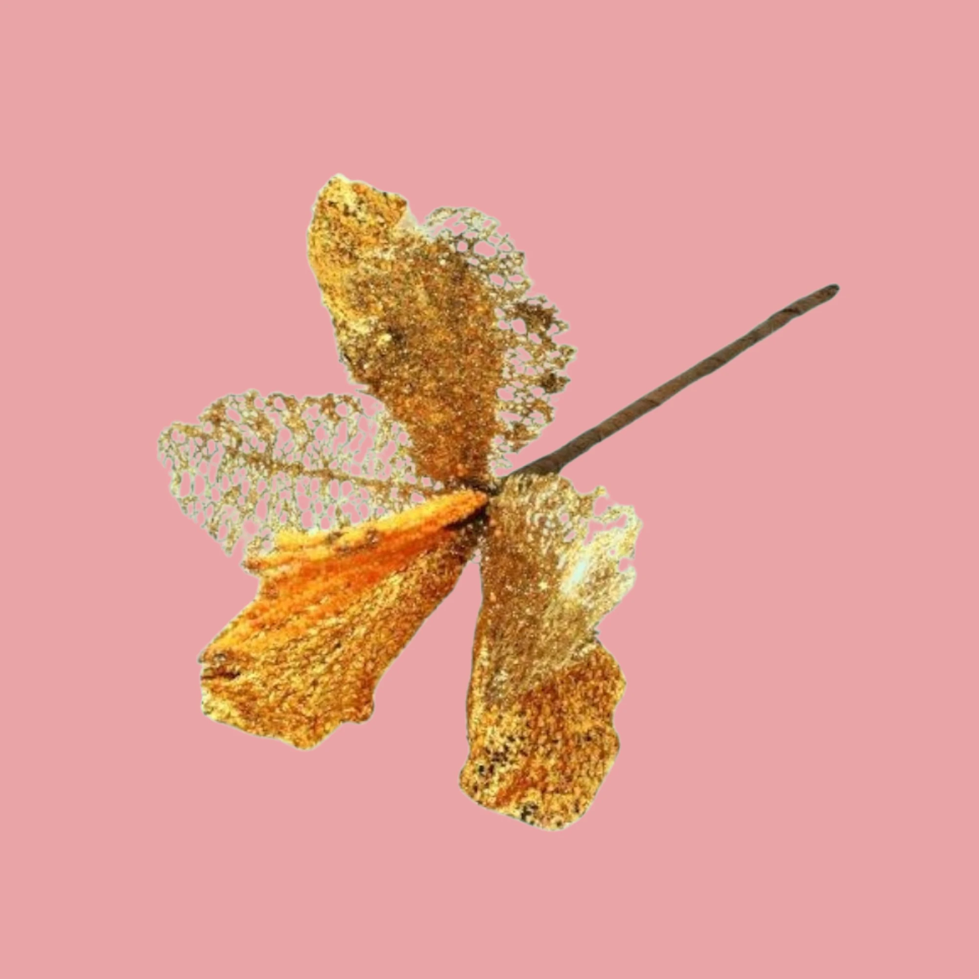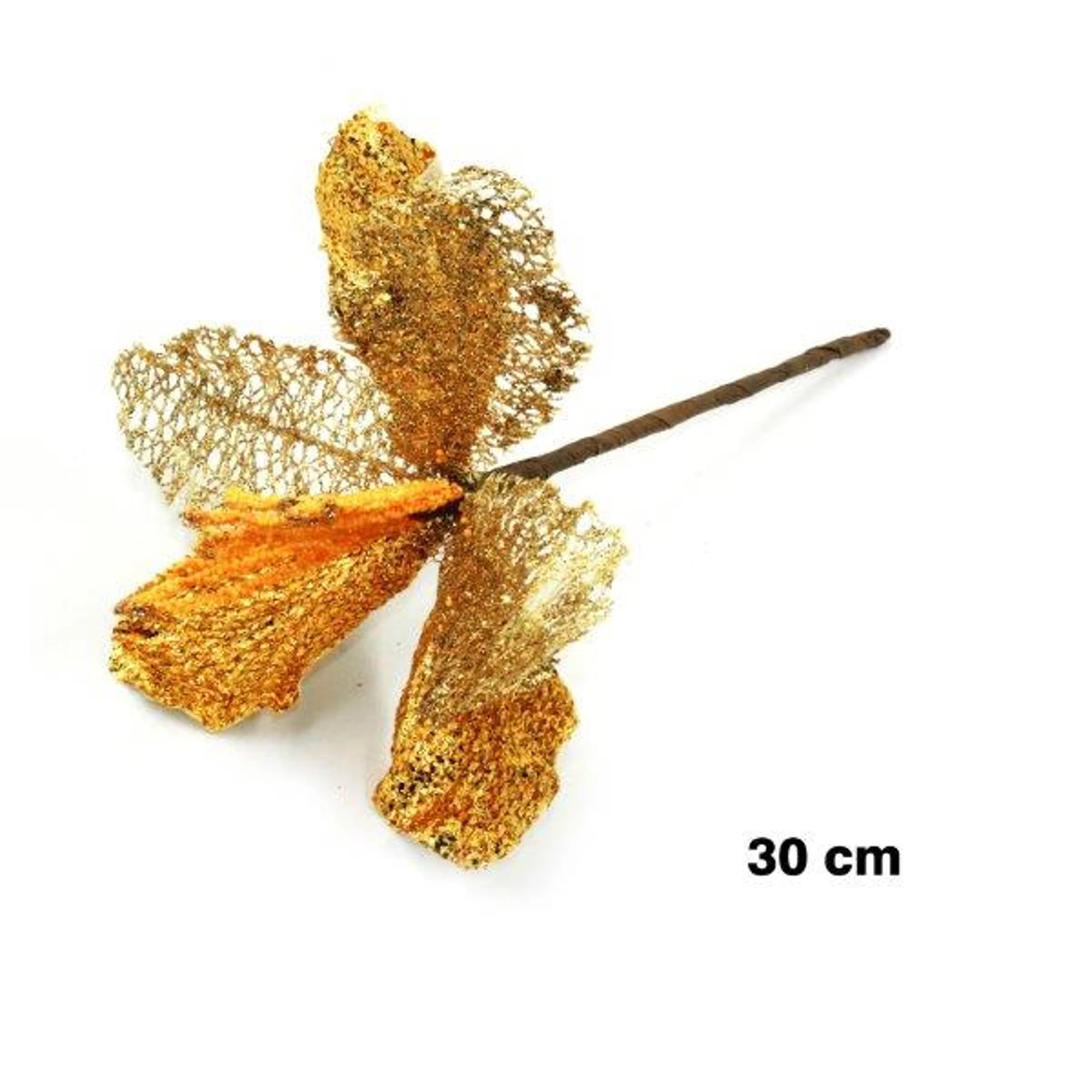 Brighten up your holiday decorations with our Mesh Pointsetia Flower Stick in elegant gold. This big, shimmering flower is designed to add a touch of glam and sparkle to any setting.