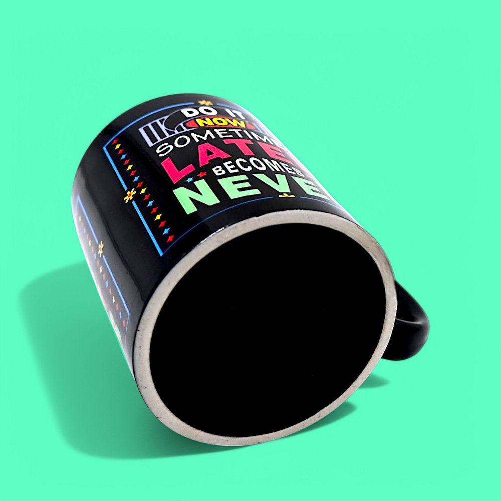 Start every day with a burst of determination with this motivational black ceramic mug. Featuring the empowering phrase “Do It Now, Sometimes Later Becomes Never,” this mug serves as a daily reminder to take action and seize opportunities. The vibrant, multicolored text pops beautifully against the sleek black background, making it a standout piece for your desk or kitchen. Made from high-quality ceramic, this mug is both microwave and dishwasher safe, ensuring convenience and long-lasting durability. Whether you’re enjoying your morning coffee or an afternoon tea, this mug adds inspiration to every sip. It also makes a thoughtful gift for friends, colleagues, or loved ones who strive to achieve their goals. Elevate your beverage experience and keep your motivation flowing with this stylish and functional mug.