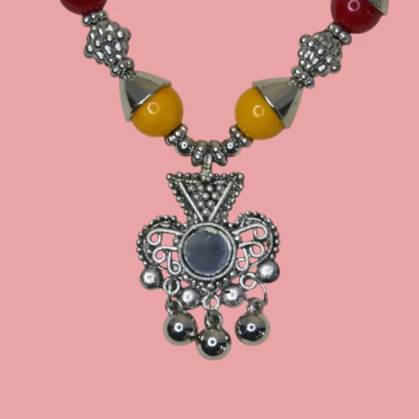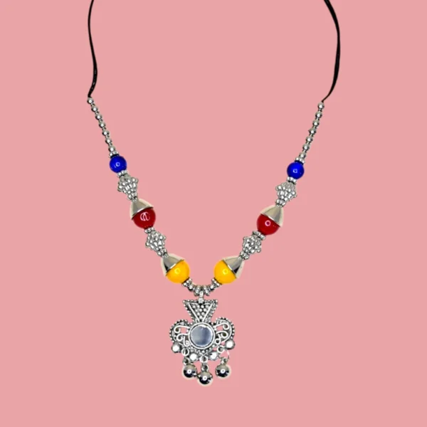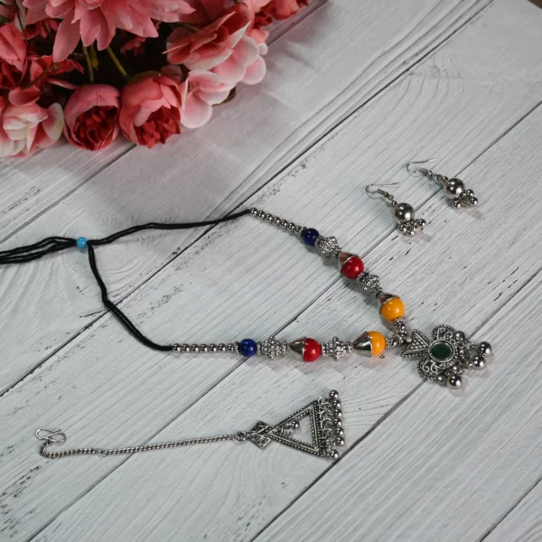 Celebrate the joy of Navratri with this multicolor beads antique silver jewelry set, crafted to bring vibrant elegance to your festive look. The set includes a necklace adorned with colorful beads and a detailed antique pendant, paired with matching earrings and a stylish hand harness that adds charm to your traditional outfit. Designed with an oxidized silver finish, this jewelry blends cultural artistry with playful colors, making it an ideal accessory for lehengas, sarees, or chaniya cholis. Lightweight and comfortable, it ensures ease of wear while dancing through garba nights and festive occasions. A perfect choice for women who want to look radiant and graceful during Navratri.