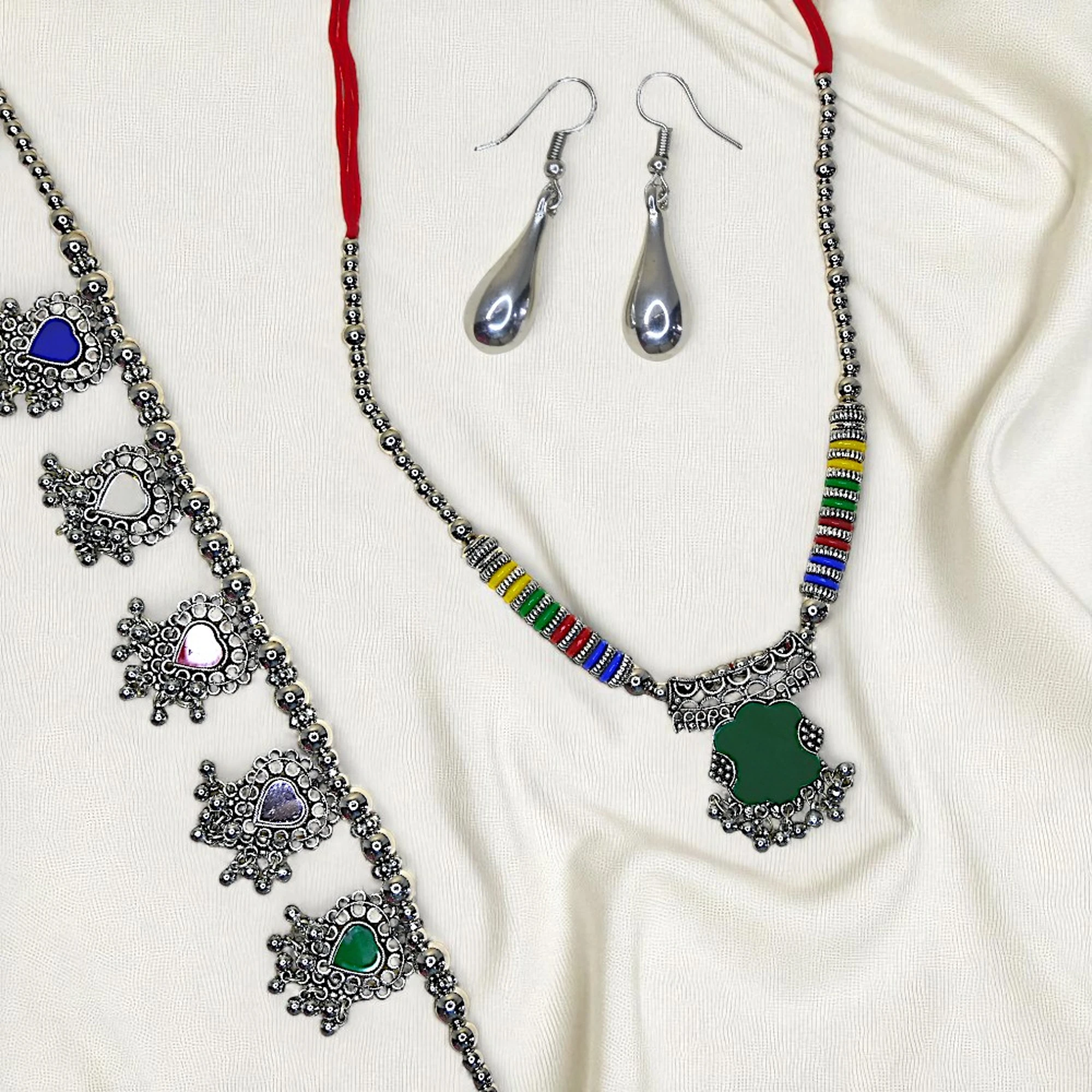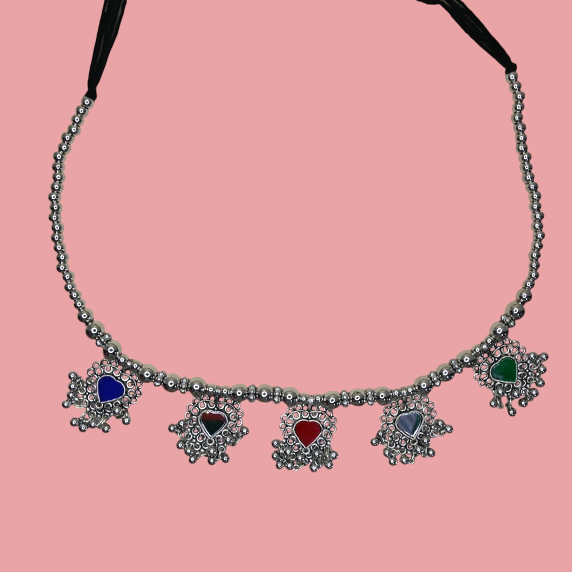 Celebrate the vibrancy of Navratri with this multicolour green pendant jewellery set that perfectly captures the spirit of the season. The set features a striking necklace adorned with colourful beads and a bold green pendant at the centre, beautifully paired with an intricately designed waist belt featuring multi-hued accents and matching earrings. This unique combination blends traditional charm with festive brightness, making it an ideal accessory for Garba and Dandiya nights. Crafted to be lightweight yet durable, the jewellery allows you to enjoy the festivities without compromising on style. Whether paired with a chaniya choli, lehenga, or saree, this set instantly elevates your ethnic look with its captivating design and craftsmanship.