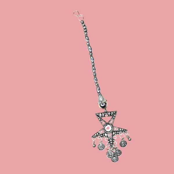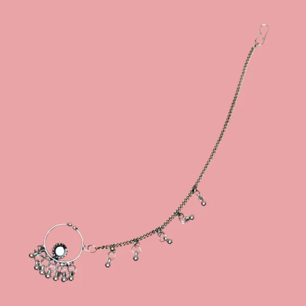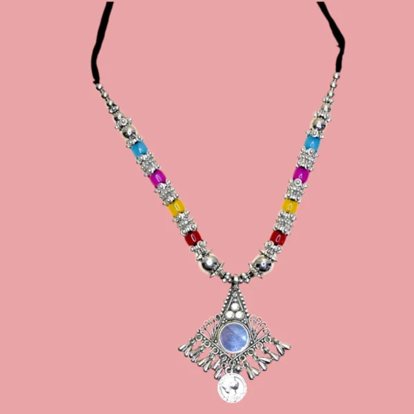 Celebrate the joy of Navratri with this multicolour oxidised jewellery set, crafted to bring radiant elegance to your festive style. The set includes a necklace adorned with colourful beads and a detailed antique pendant, paired with matching earrings and a stylish hand harness that perfectly enhance your traditional attire. Designed with an oxidised silver finish, this jewellery beautifully combines cultural artistry with playful colours, making it an ideal accessory for lehengas, sarees, or chaniya cholis. Lightweight and comfortable, it ensures ease of wear while dancing through garba nights and festive occasions. A must-have choice for women who want to shine with grace and charm during Navratri.