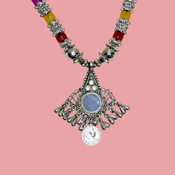– Multicolour bead necklace with antique silver pendant