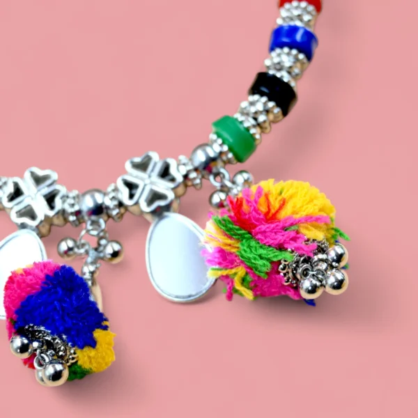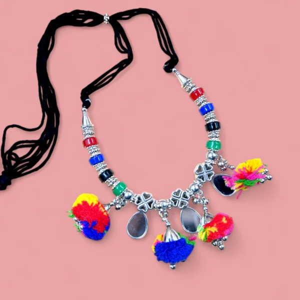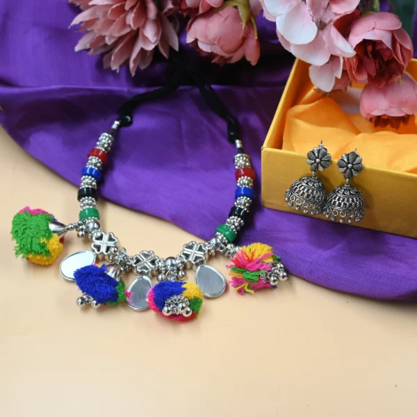 Celebrate the spirit of Navratri with this stunning oxidised beaded mirror pendant set, crafted to bring festive elegance to your ethnic look. The necklace showcases a beautifully detailed rectangular oxidised pendant with intricate patterns and shimmering mirror inlays, creating a captivating centerpiece. Silver danglers shaped like feathers add graceful movement, enhancing its traditional charm. The strand is adorned with vibrant multicolored beads paired with oxidised silver accents, making it perfect for complementing colorful chaniya cholis and sarees. The set comes complete with matching oxidised earrings featuring a unique cone-shaped design, adding a contemporary twist to the traditional style. Lightweight and comfortable, this set is designed for long hours of Garba and Dandiya nights, ensuring you shine effortlessly throughout the festivities.