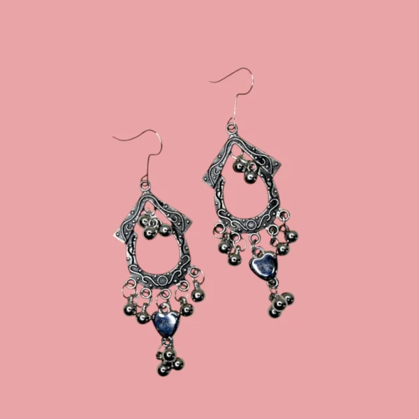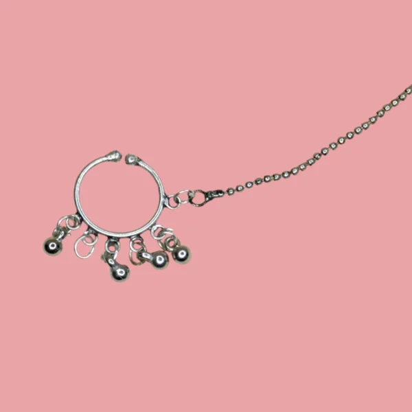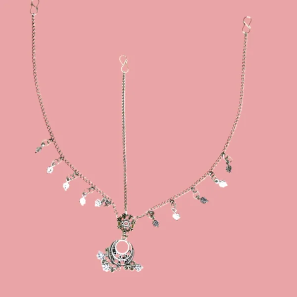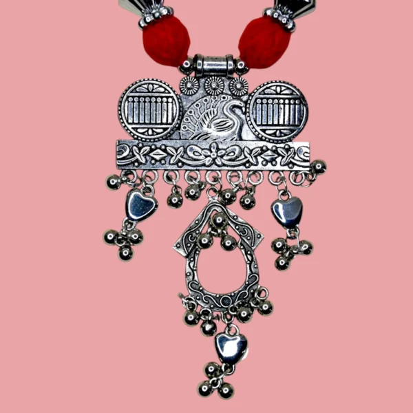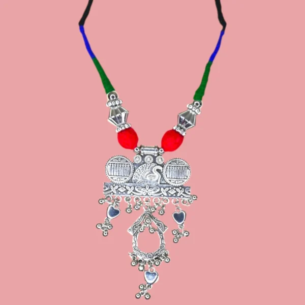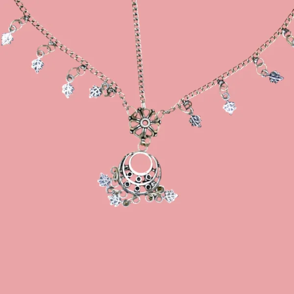 Enhance your festive charm with this exquisite Navratri oxidised multicolour jewellery set, designed to bring traditional elegance and vibrant appeal to your celebrations. The set features a bold necklace with intricate antique detailing, a delicate chain necklace with ornate drops, matching earrings, a stylish bracelet, and a hand harness that completes the ethnic look. Adorned with coloured accents and finished in oxidised silver, this jewellery perfectly complements lehengas, sarees, and chaniya cholis. Lightweight and comfortable, it allows you to enjoy garba and dandiya nights with effortless grace. A perfect accessory to elevate your Navratri outfits and leave a lasting impression.