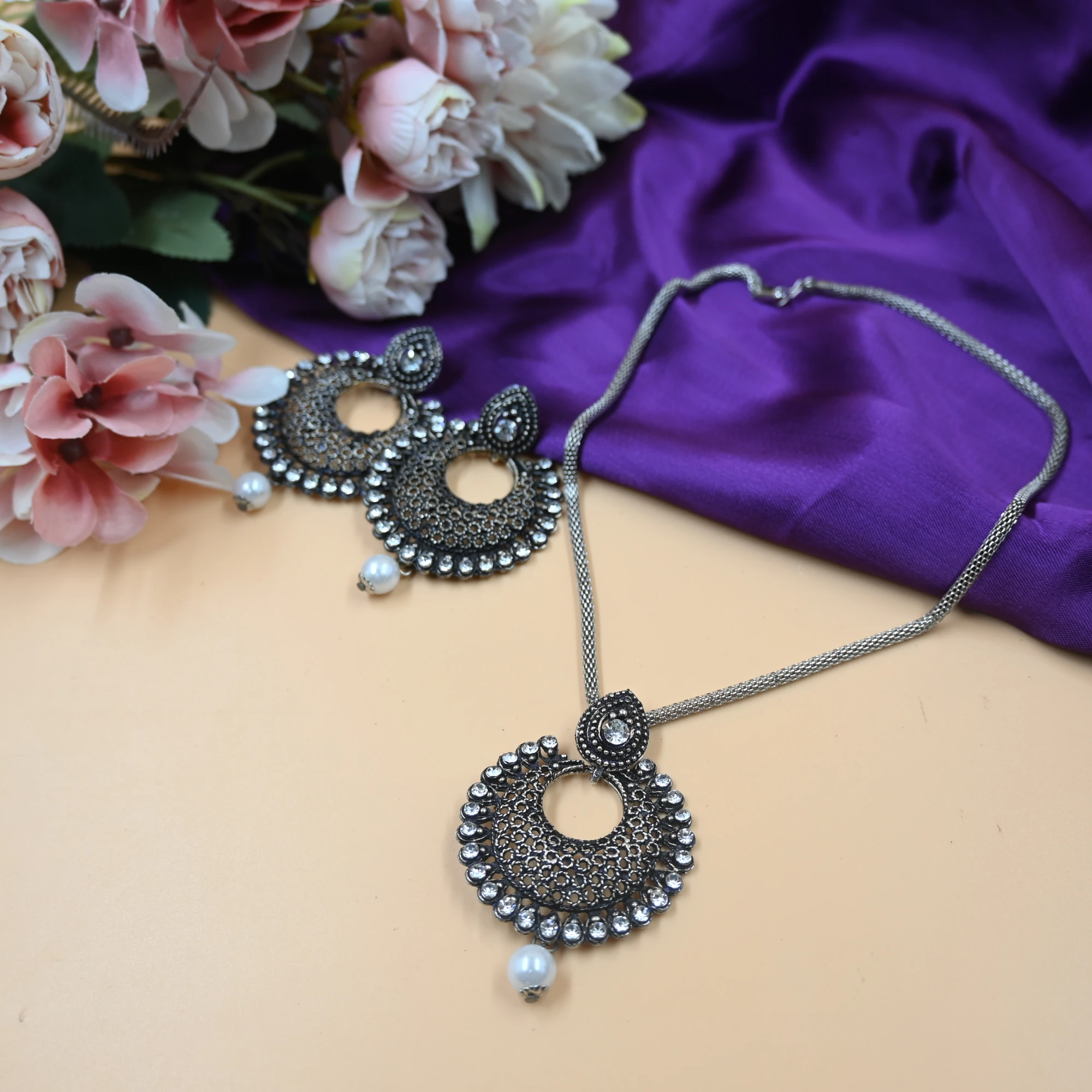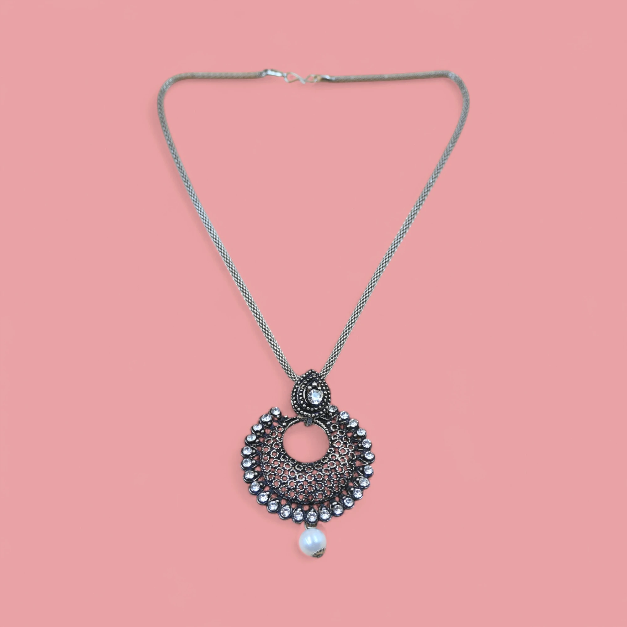 Celebrate the festive beauty of Navratri with this exquisite oxidised choker necklace set, designed to add elegance and charm to your ethnic wardrobe. The necklace features an intricate circular pendant embellished with detailed carvings and surrounded by shimmering stone accents, giving it a regal and festive appeal. A delicate pearl drop adds a graceful finishing touch, enhancing its traditional charm. The matching earrings mirror the necklace design, making this set a complete statement piece. Perfect for pairing with chaniya cholis, sarees, and festive lehengas, this jewelry set ensures you shine brightly during Navratri celebrations. Its lightweight construction makes it easy to wear for long hours while dancing through Garba and Dandiya nights. This set beautifully combines heritage design with contemporary elegance, making it a must-have accessory for the festive season.