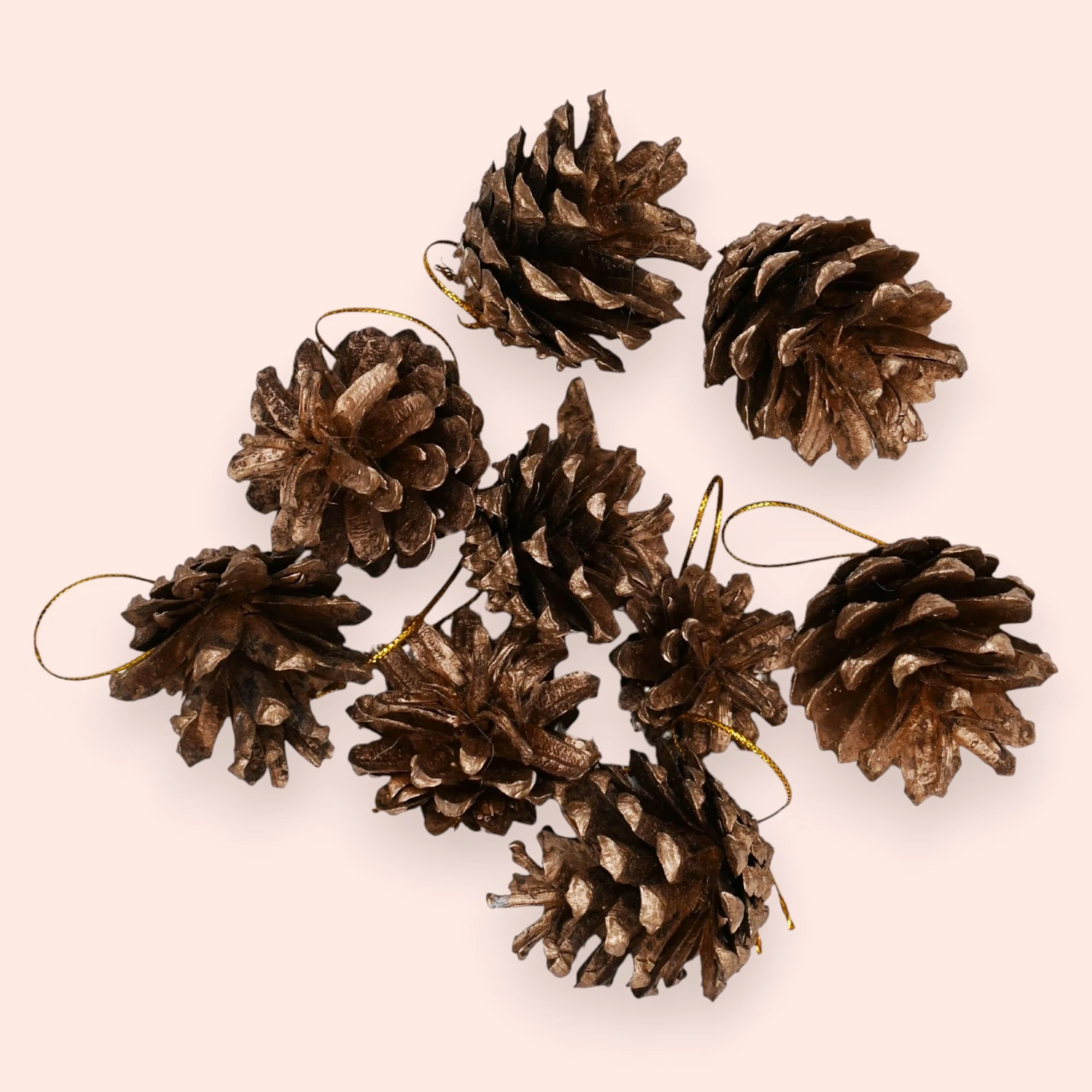 The image shows a close-up view of several brown pine cones attached to a string, arranged in a decorative manner. The pine cones are natural and have a textured, layered appearance. This arrangement is often used for seasonal decorations, particularly during autumn and winter, making it interesting for those looking to create a rustic or nature-inspired decor.