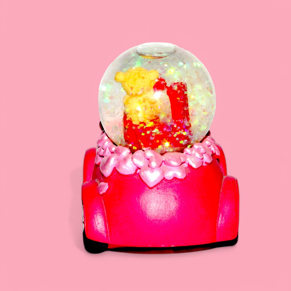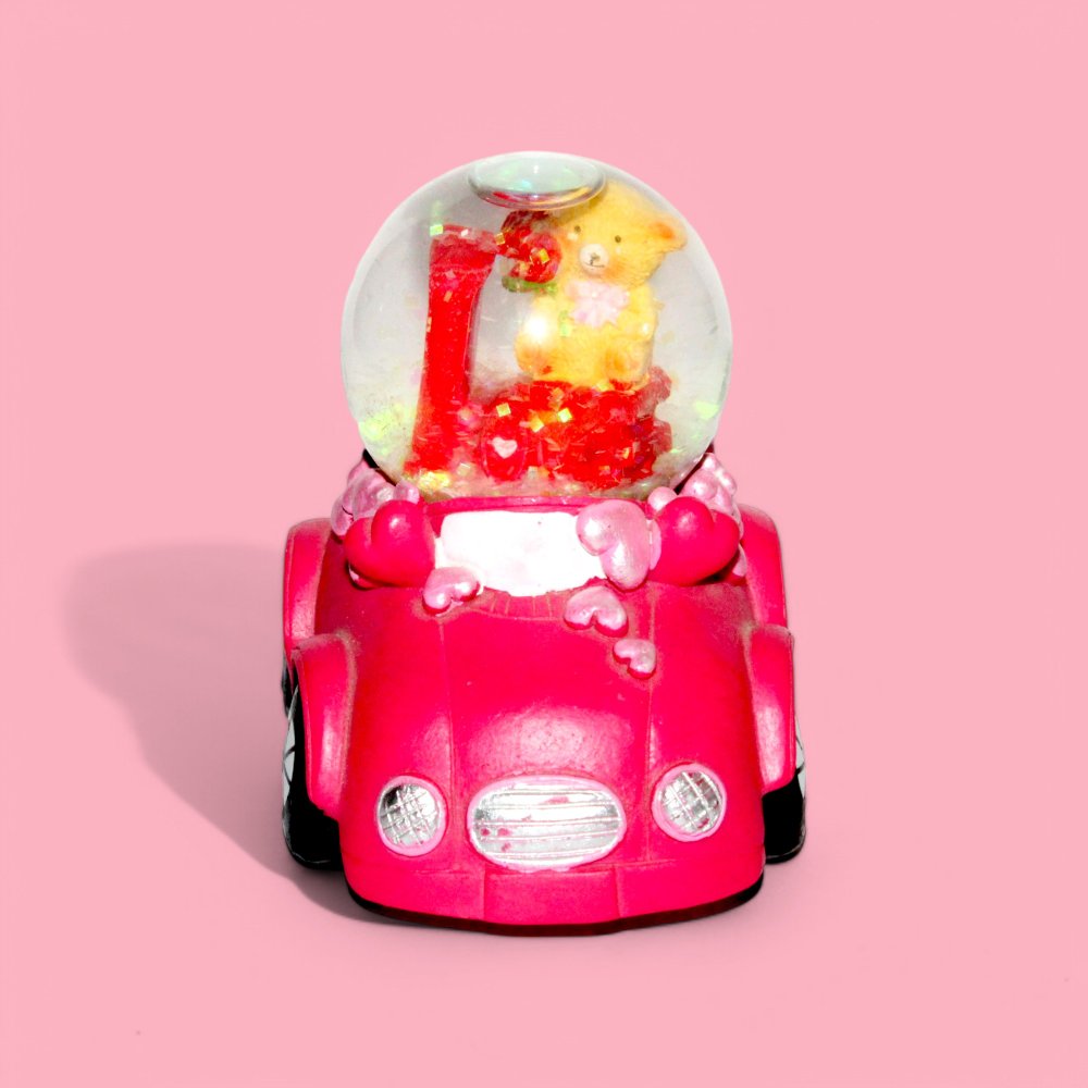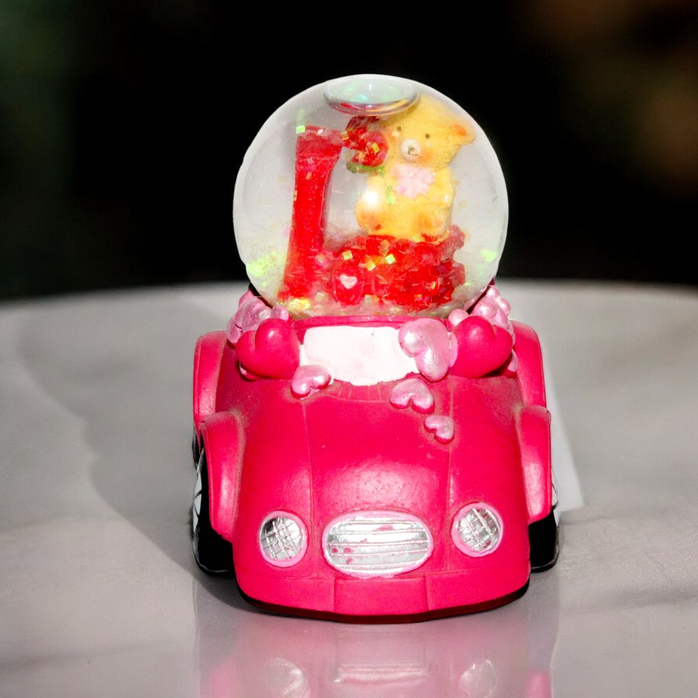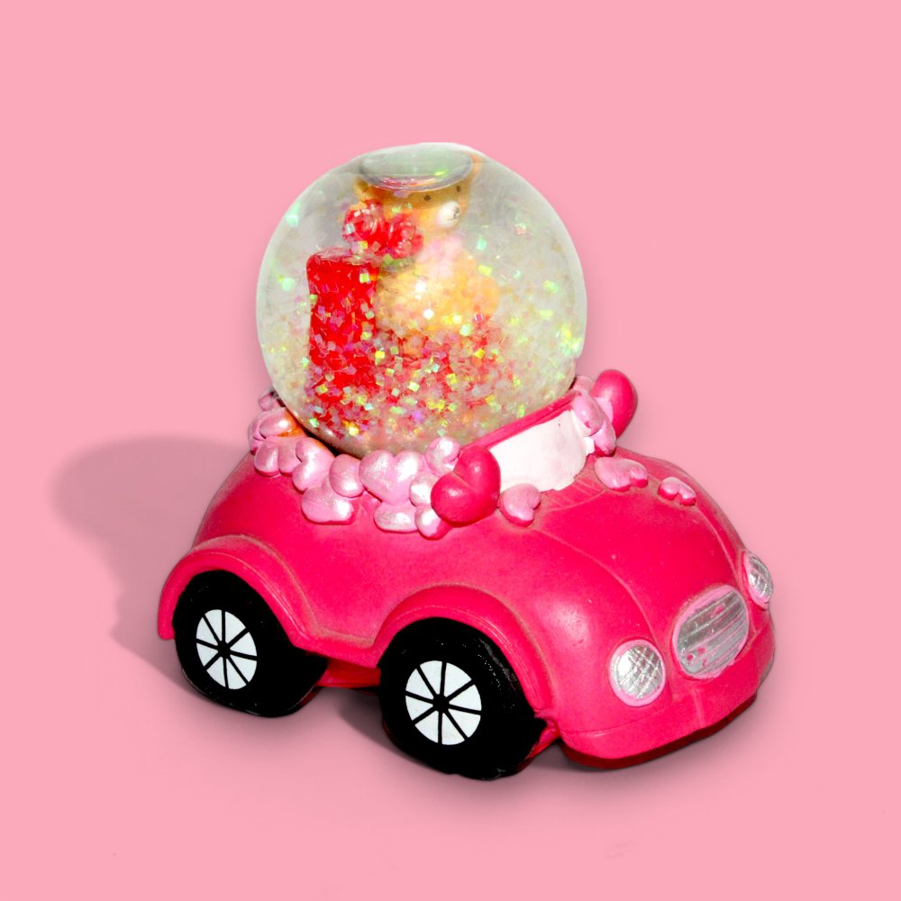 This delightful Pink Vintage Car Snow Globe combines the nostalgic charm of a vintage toy car with the whimsical magic of a snow globe. The bright pink car is adorned with heart-shaped decorations, creating a playful and romantic aesthetic. Inside the clear globe on top of the car sits an adorable yellow bear holding a red flower, surrounded by vibrant red and yellow glitter. The solid pink background enhances the overall cute and charming appearance of this unique decorative piece. Perfect for gifting on special occasions like Valentine’s Day or anniversaries, this snow globe adds a touch of sweetness and fun to any space.