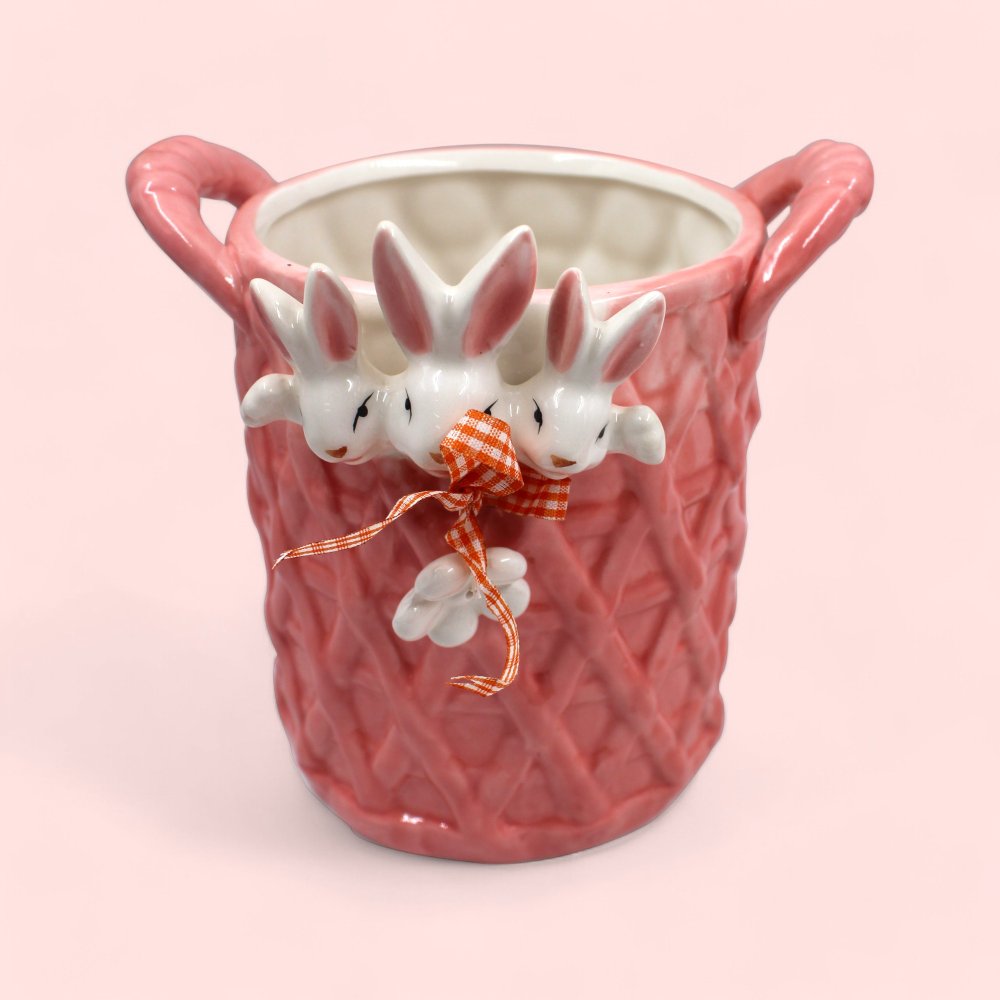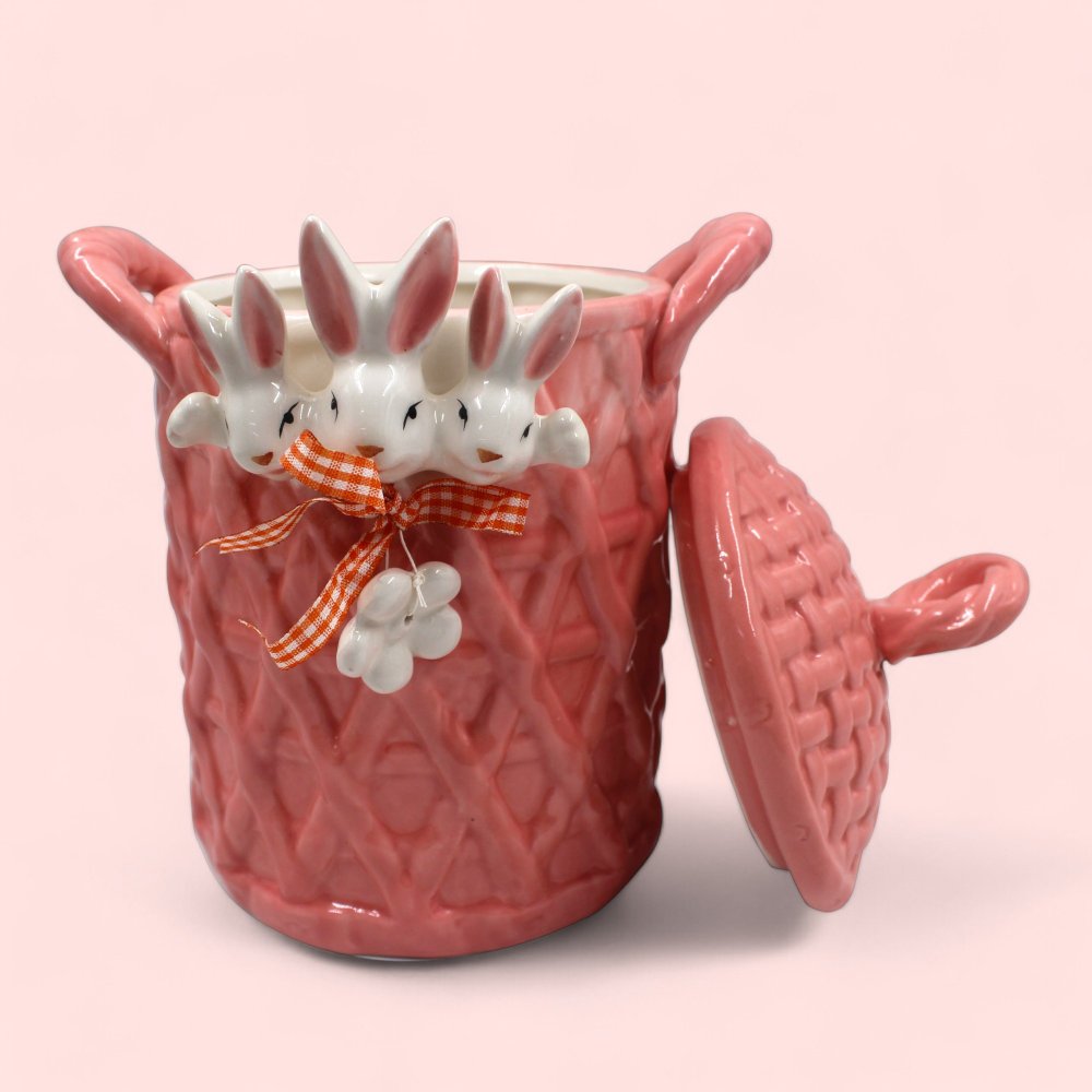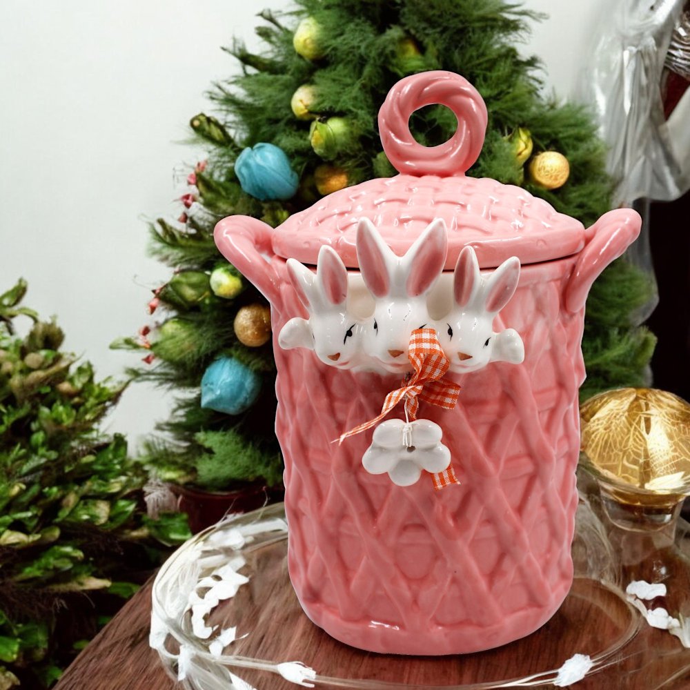 The image shows a decorative ceramic jar with a lid, designed in a bright green color with a textured, quilted pattern. The jar features three white bunny heads with pink ears and small black eyes, positioned side by side near the top. The bunnies are adorned with a green and white checkered ribbon tied into a bow, adding a charming touch. The lid of the jar is partially open and has a loop handle. The background is a solid bright pink, which contrasts with the green jar, making the object stand out. This jar is interesting due to its whimsical design and vibrant colors, making it a unique and eye-catching decorative piece.