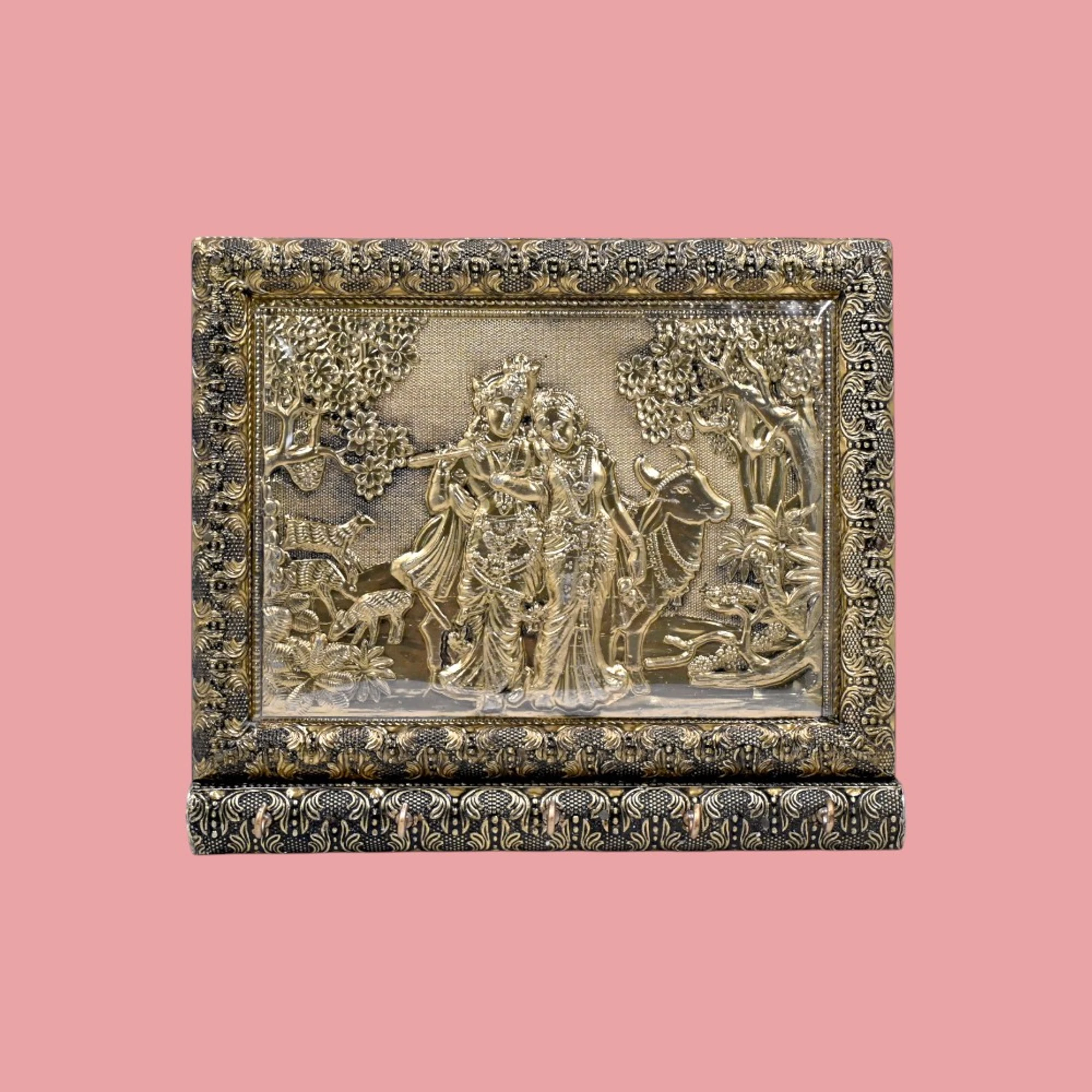 Bring a touch of divine charm to your home with the exquisite RADKHA Krishna Gold Metallic Key Holder. This beautifully crafted piece not only keeps your keys organized but also serves as a tasteful decor fixture.