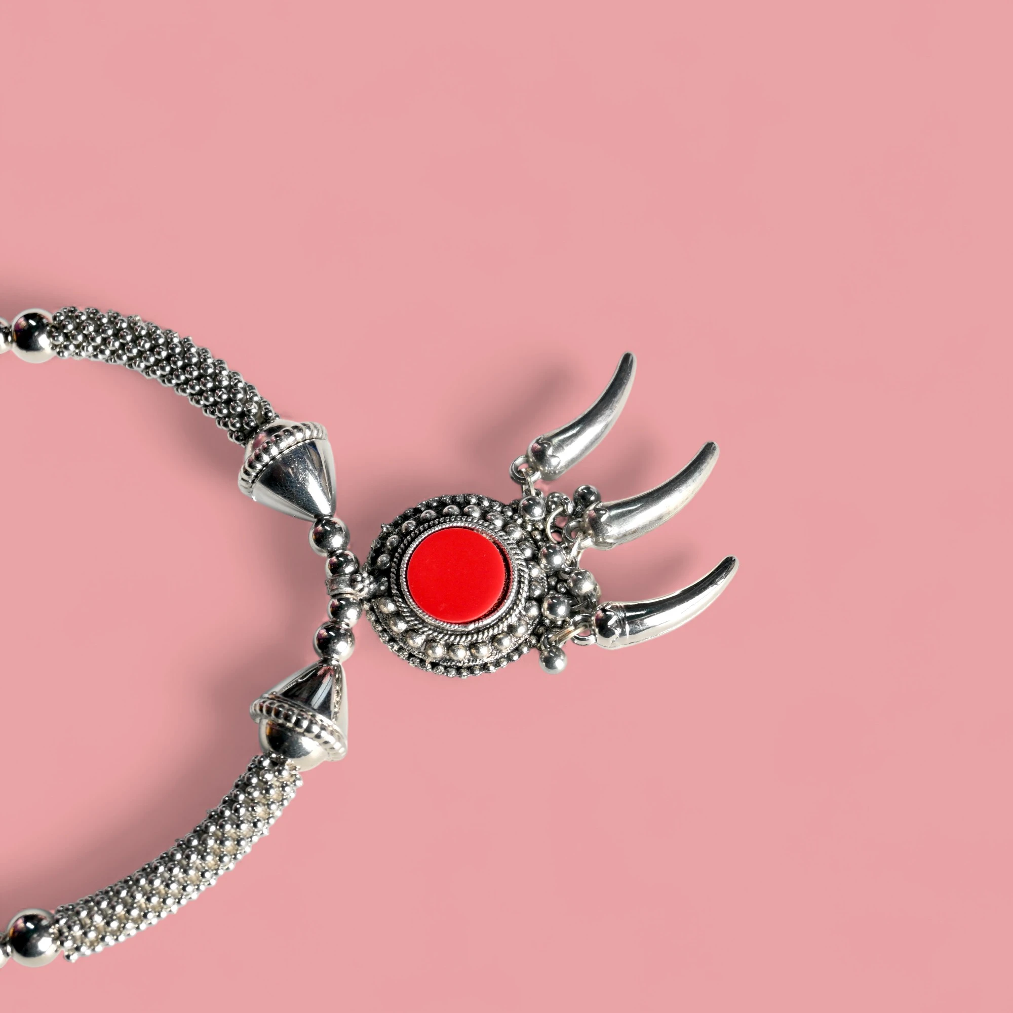 – Bold red stone pendant with unique claw-shaped danglers