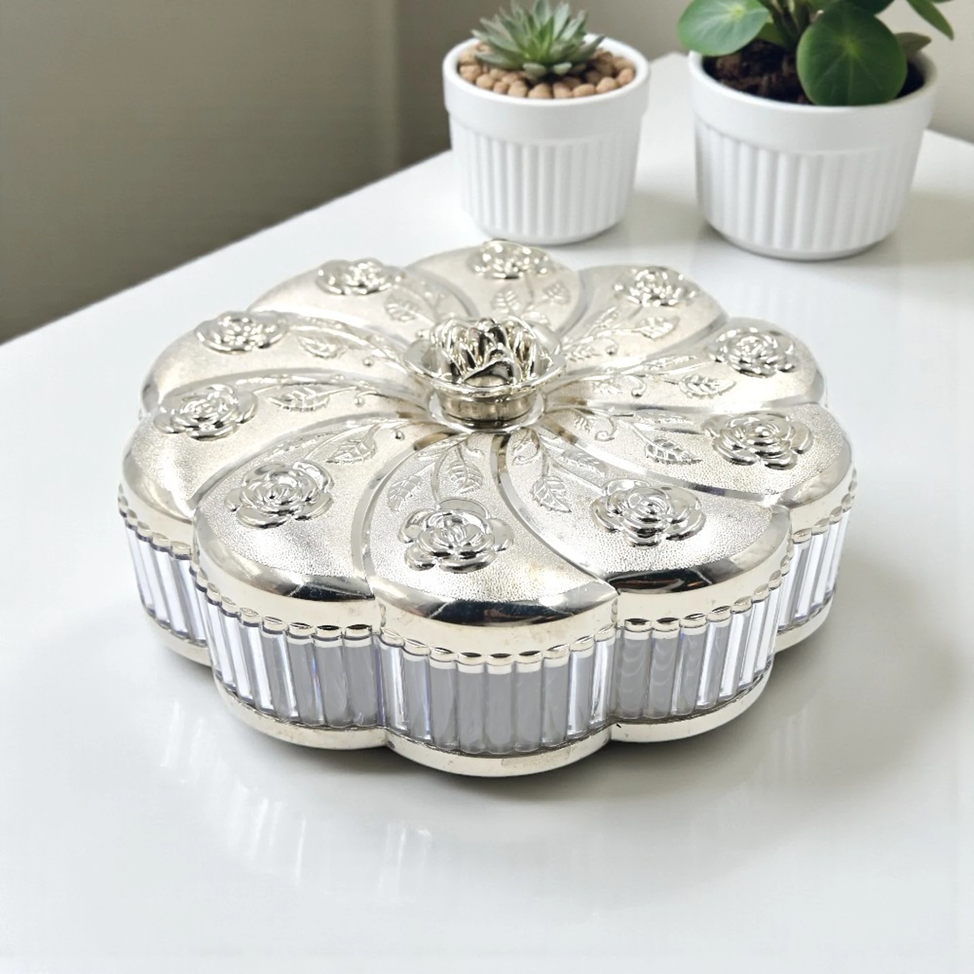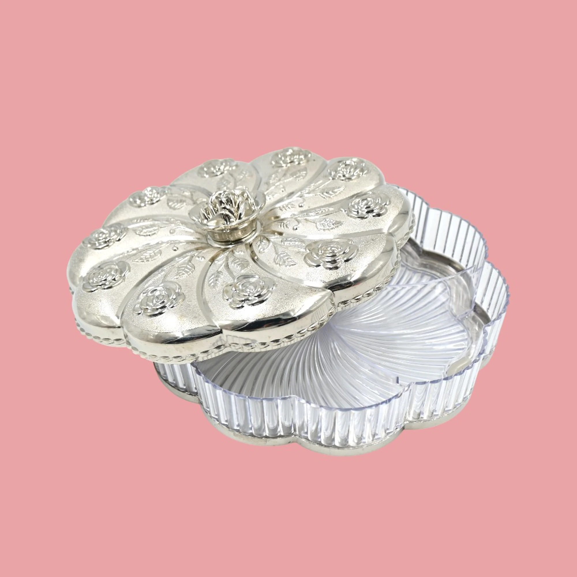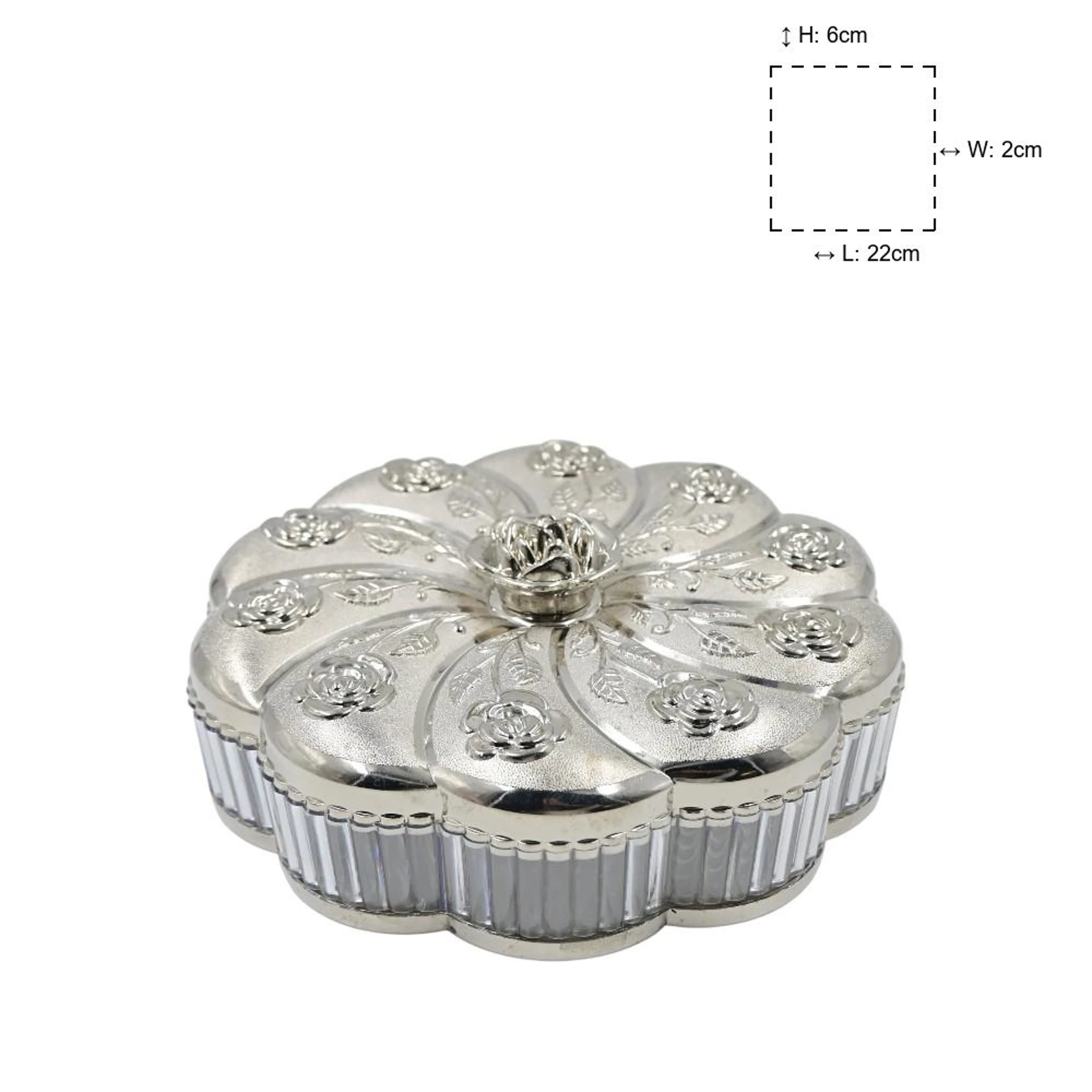 This medium-sized box is perfect for a single serving or sharing among family and friends. It features multiple partitions that allow you to arrange an assortment of dry fruits such as cashews, almonds, raisins, pistachios, or anything else you love.