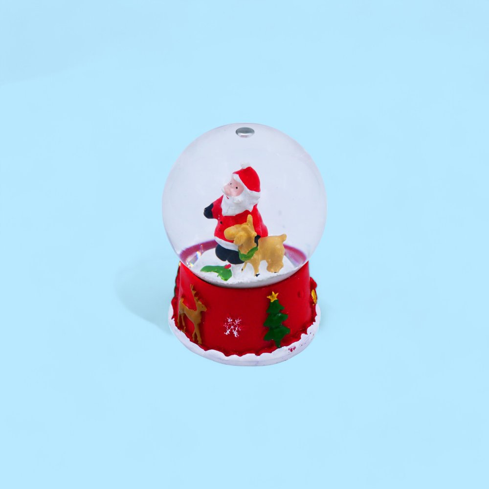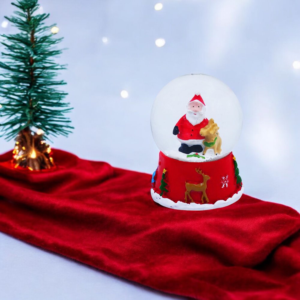 This festive snow globe features a charming scene with Santa Claus and a reindeer inside a clear glass dome. The base of the snow globe is decorated in bright red with images of a reindeer, Christmas trees, and snowflakes, adding to the holiday spirit. Perfect for holiday decor or as a gift, this snow globe captures the magic of Christmas with its delightful design and vibrant colors.
