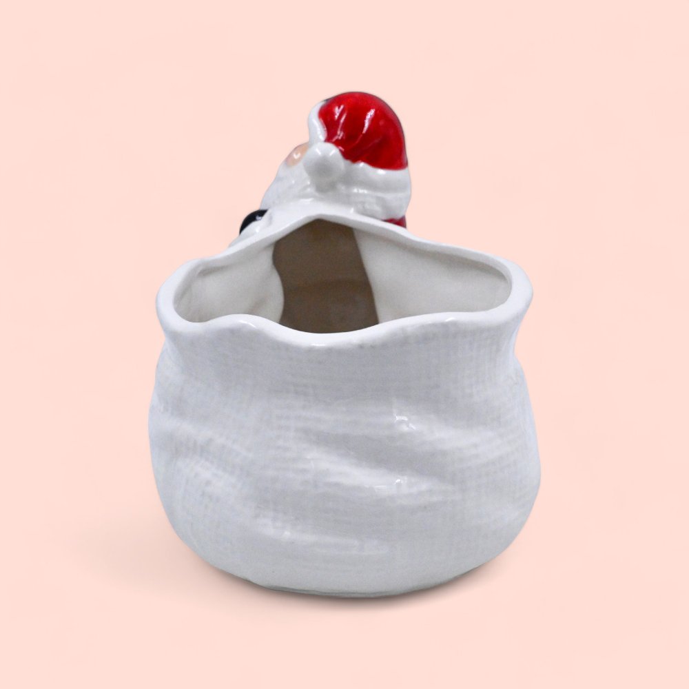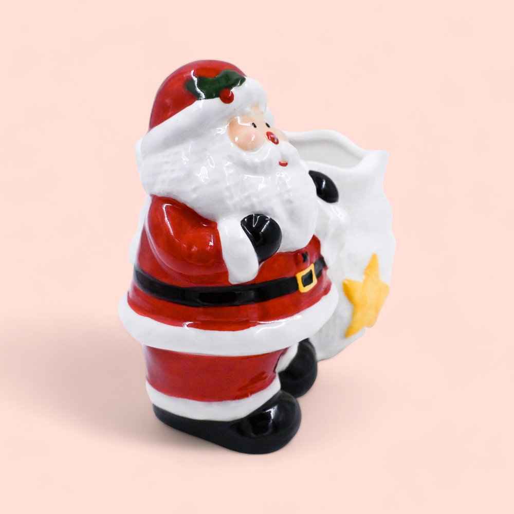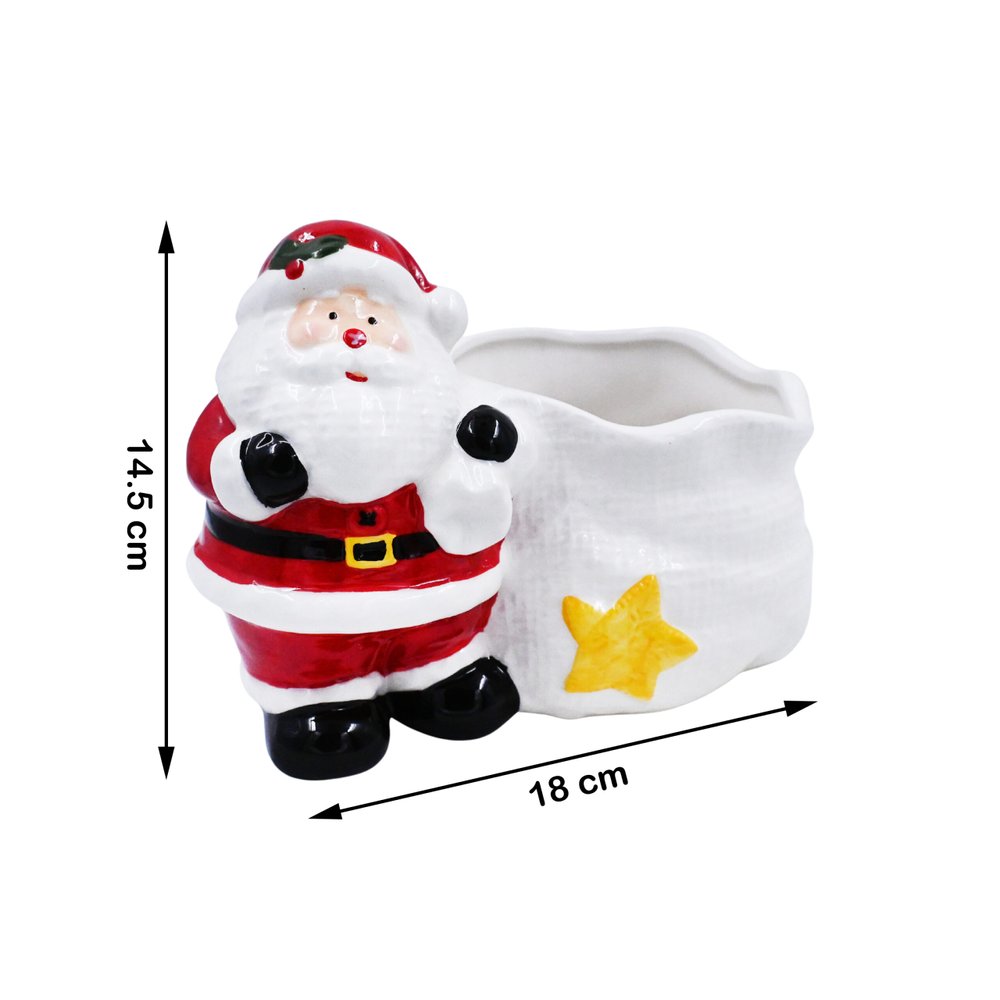 This delightful Santa Claus ceramic bowl brings a touch of holiday charm to your festive table. Standing 14.5 cm tall and 18 cm wide, it features a jolly Santa holding a sack with a bright yellow star, making it ideal for serving holiday snacks or adding a decorative accent to your home.