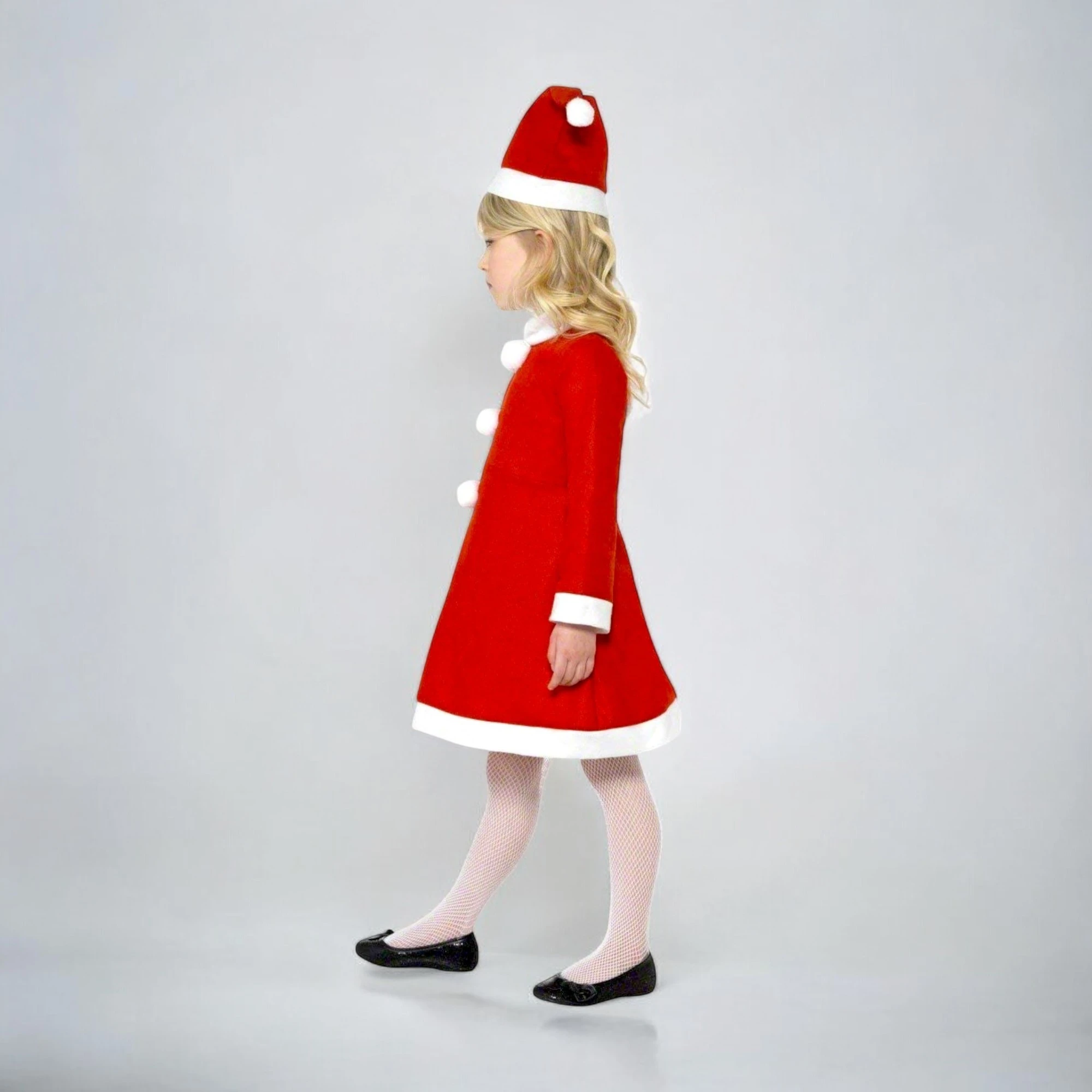 This adorable Santa Claus costume for kids includes a red jacket with white trim, matching red pants, a classic Santa hat, and a black belt buckle. The jacket features a white button-down front and white cuffs, while the pants have white cuffs at the ankles. The hat is red with a white trim and a small white tassel at the top. Perfect for holiday parties, Christmas photos, and festive events, this costume will make any child look like a mini Santa Claus. Made from soft and comfortable fabric, it ensures a cozy fit for your little one.