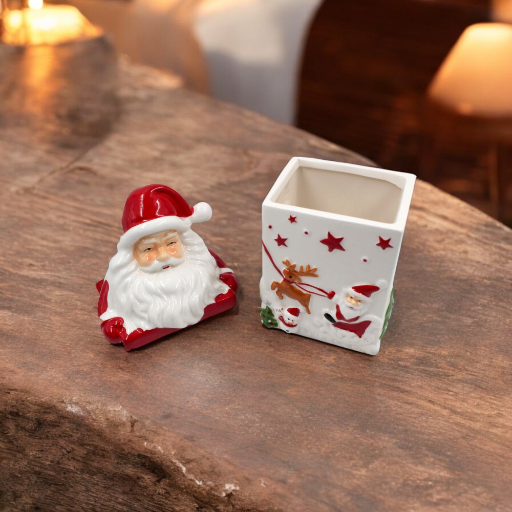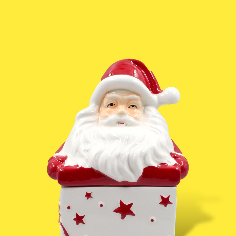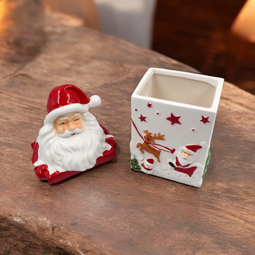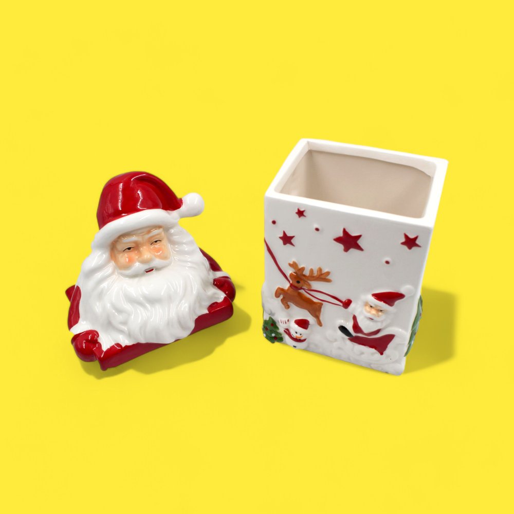 Get your holiday spirit into full swing with our Santa on Sleigh Jar with Santa Face Lid. This charming decorative piece is perfect for adding cheer to any room, a delightful combination of functionality and festive fun.