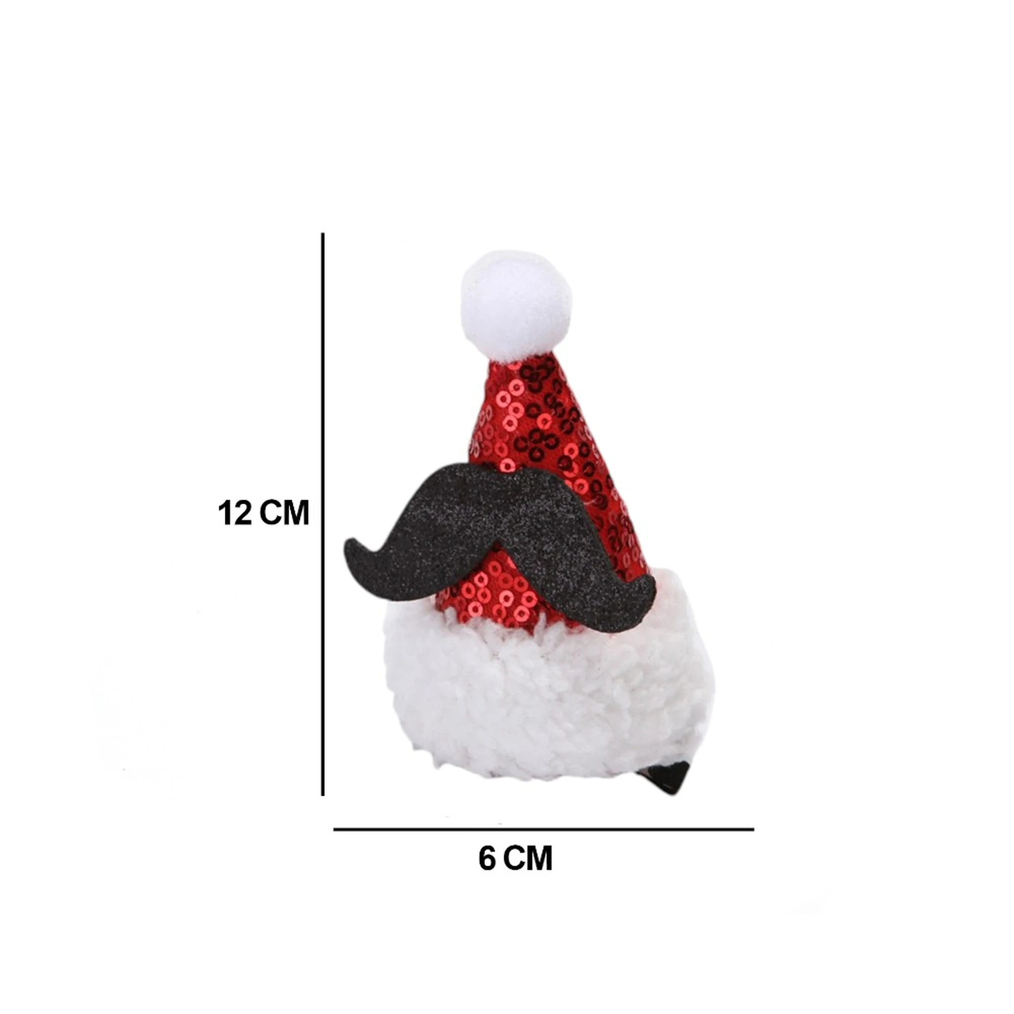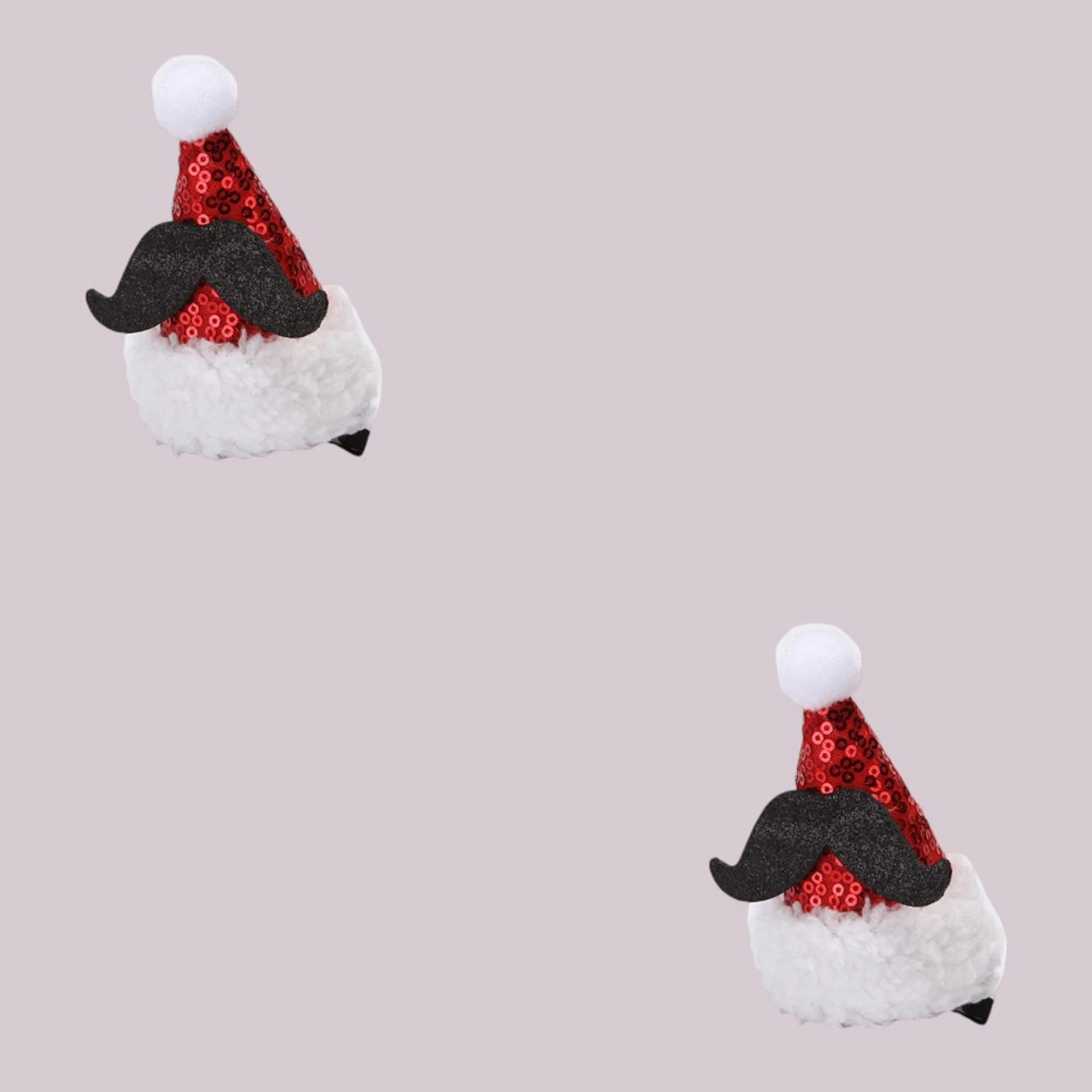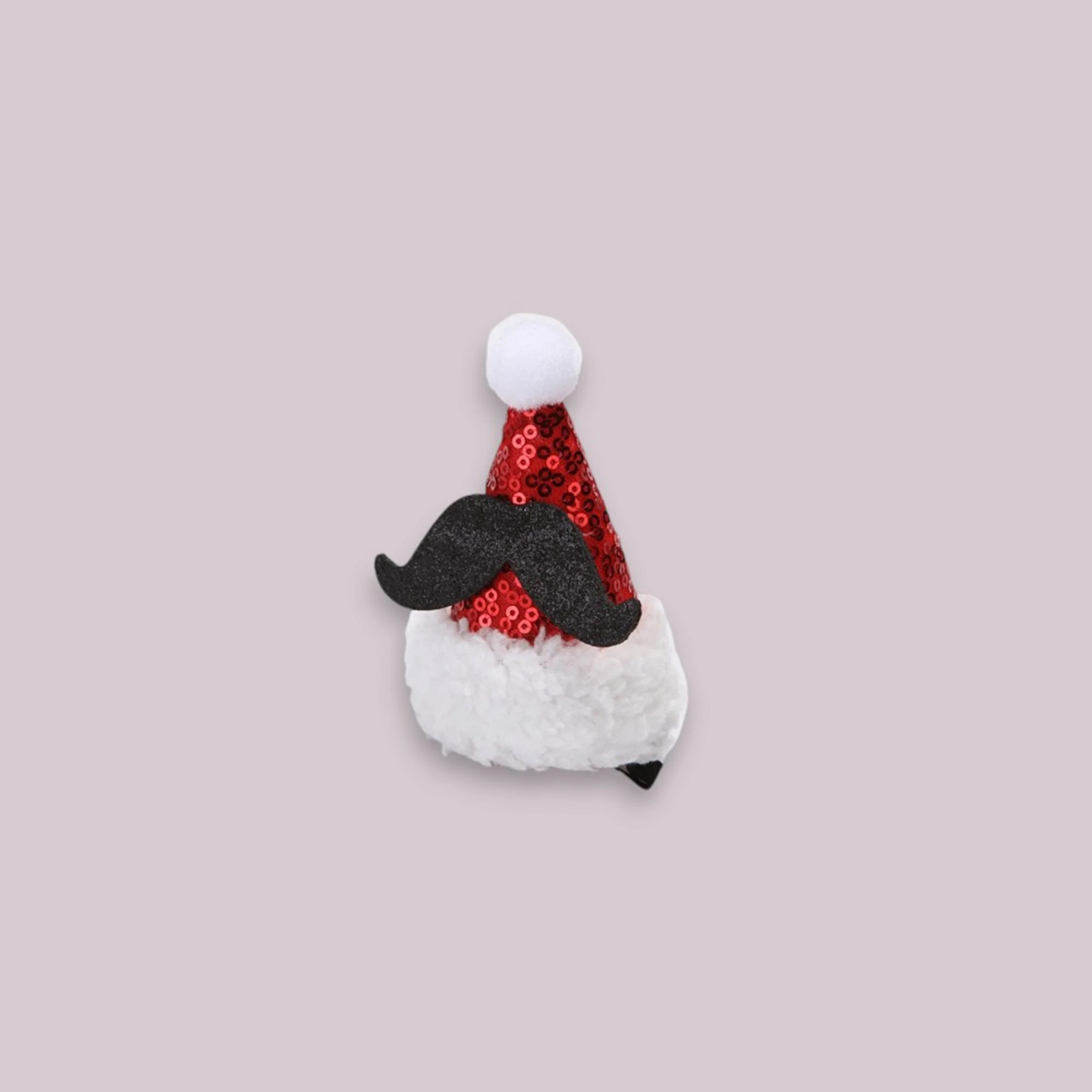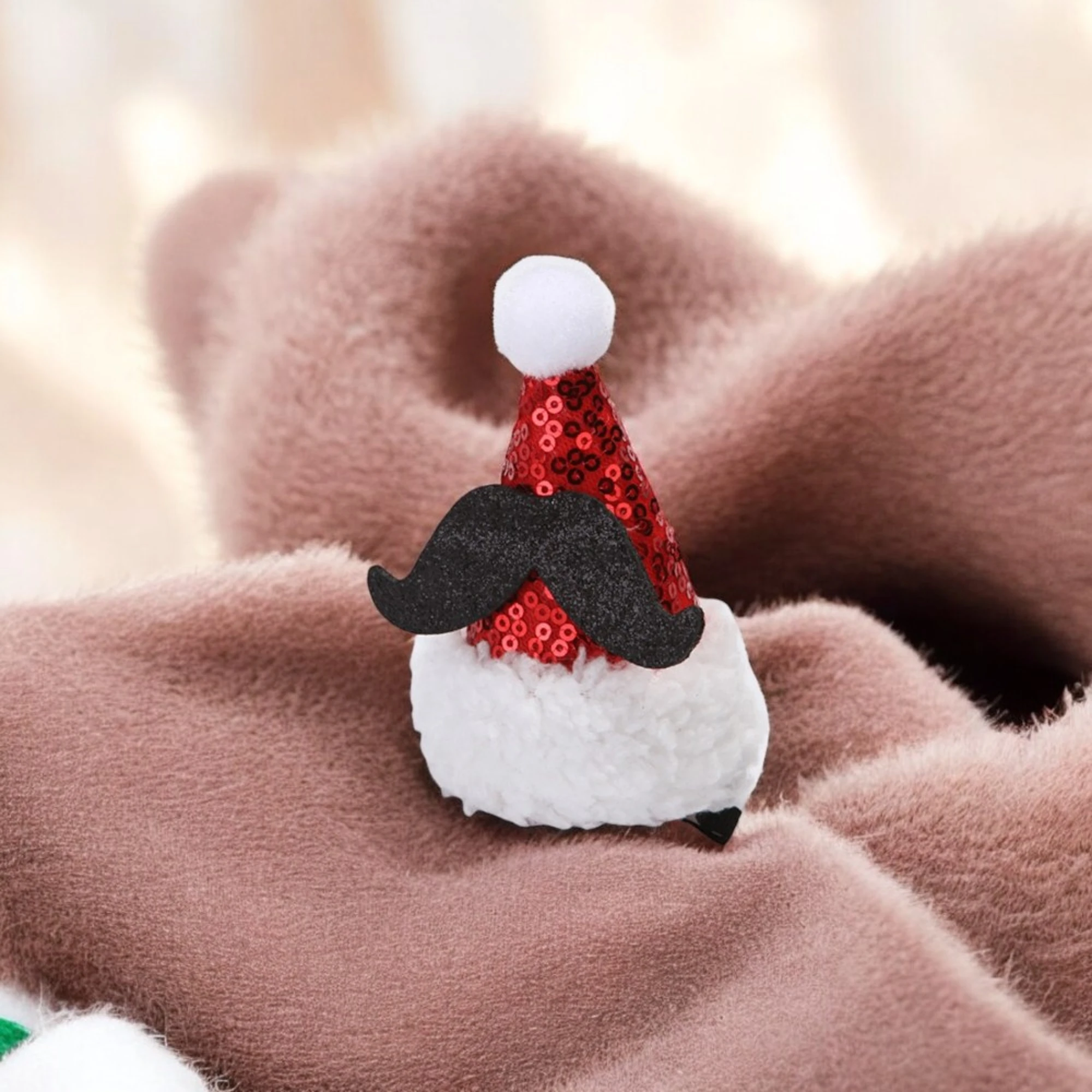 The image shows a small, festive Santa hat hair clip placed on a soft, white fabric background. The hat is adorned with red sequins and has a white, fluffy trim at the base, resembling the traditional Santa Claus hat. Attached to the bottom of the hat is a red hair clip, making it a decorative accessory likely intended for holiday-themed outfits or events. The contrast between the vibrant red hat and the soft white background makes the accessory stand out, highlighting its festive and playful nature.