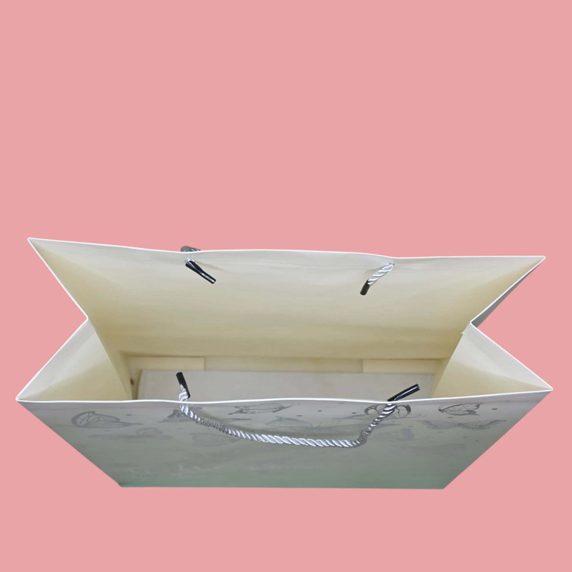 Delight in the whimsical charm of our Silver Butterfly Print Green Paper Bags. Perfect for gift-giving and special occasions, these bags feature a magical butterfly design that adds a touch of elegance and fun.