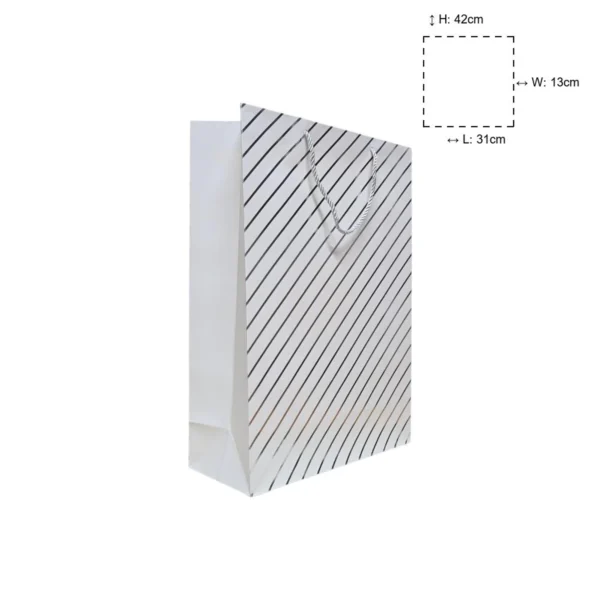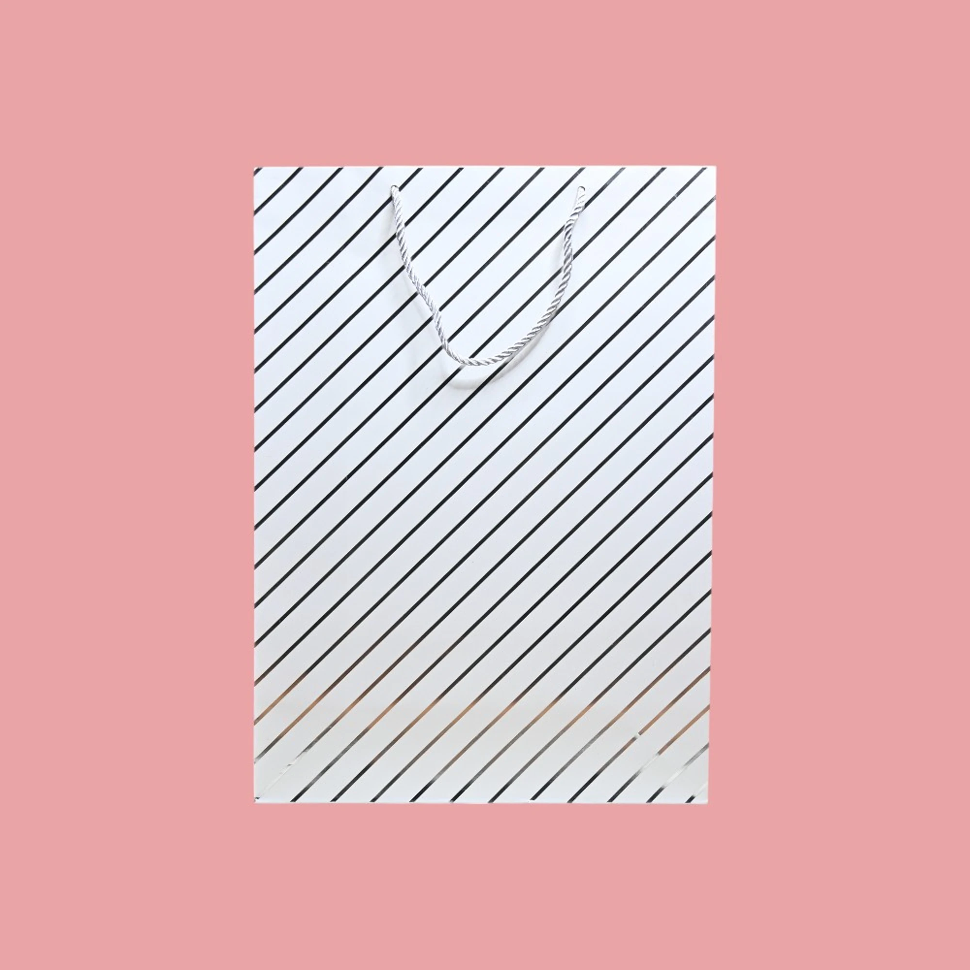 These Slanting Line White Paper Bags, available in a convenient set of 6, are perfect for all your gifting and packaging needs. Designed with sleek, slanting lines, these bags add a touch of elegance to any occasion.