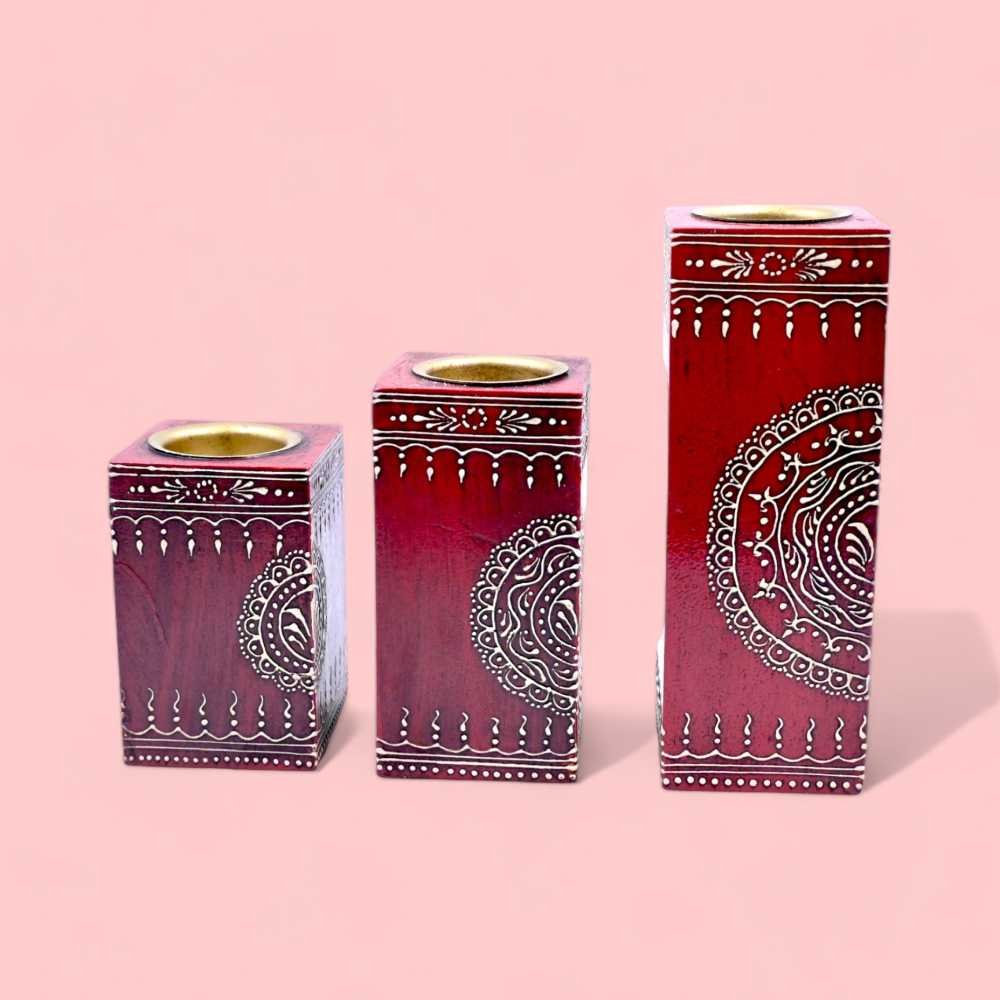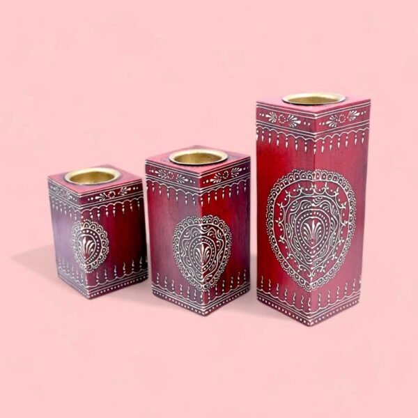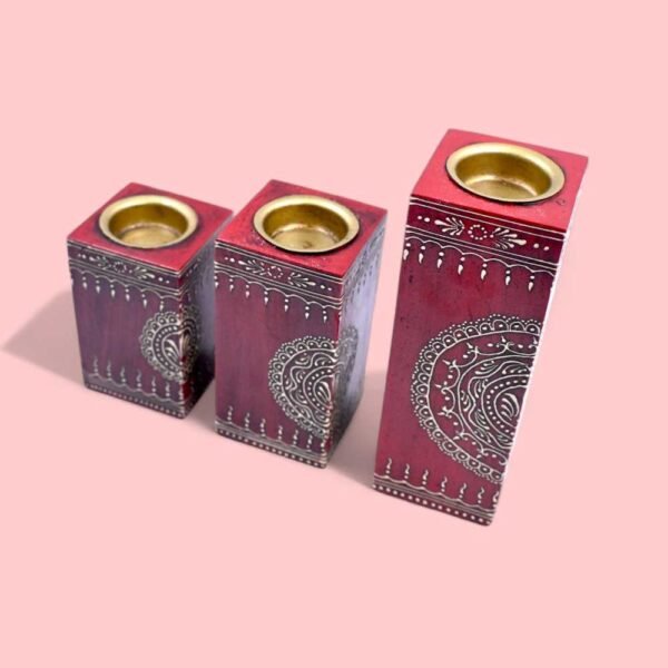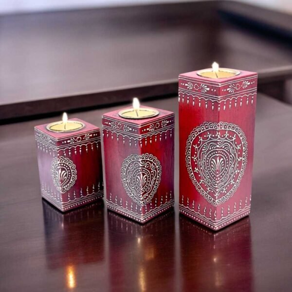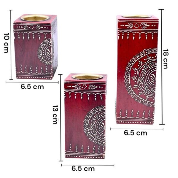 Whether you’re dressing up for the holidays or just want to elevate the everyday atmosphere in your space, the Wooden Red Ethnic Pillar 3 Tea Light Holder Set is your go-to for achieving that desired cozy glow. Bring this delightful set into your home and see how it transforms your space into a warm and welcoming haven. Enjoy the flicker of tea lights casting delightful shadows and creating a peaceful environment for relaxation and enjoyment.