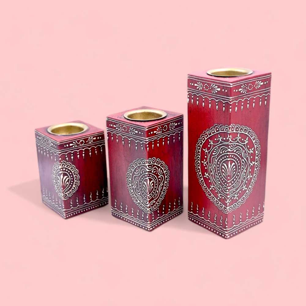 Brighten up your space with the Wooden Red Ethnic Pillar 3 Tea Light Holder Set. This vibrant and thoughtfully crafted set is perfect for those who love to add a touch of warmth and charm to their home decor.